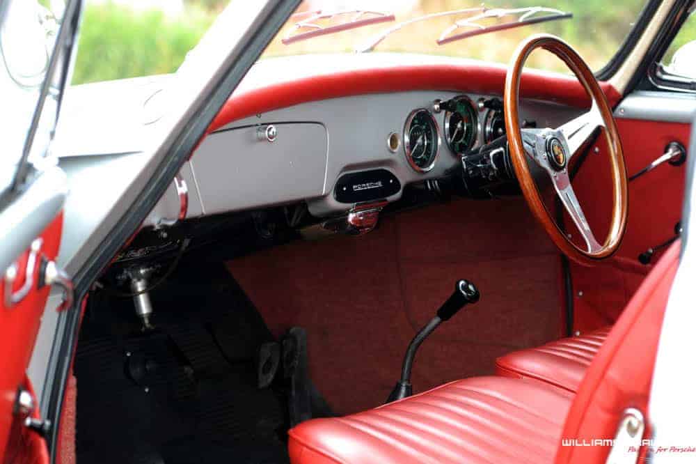 This 356 presents well, and will be welcomed everywhere. It is an older restoration with original chrome, a comfortable red leather interior, with red square weave carpets and a really nice feel. Note the lovely handles, original instruments and bright work. The eagle eyed will spot that the panel gaps are not as good as they could be and there is a little bubbling in the bottom of the doors, but overall a very attractive and rare right hand drive 356.