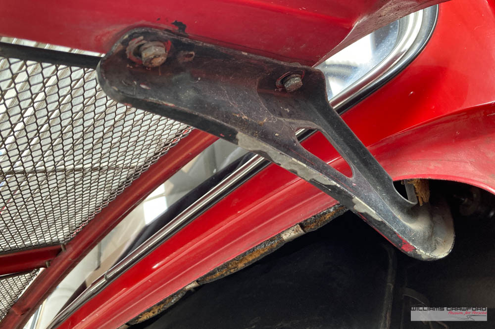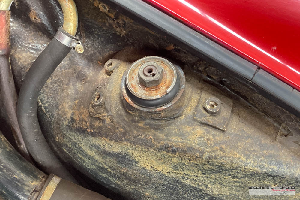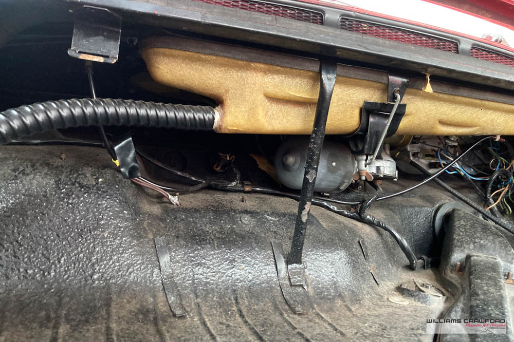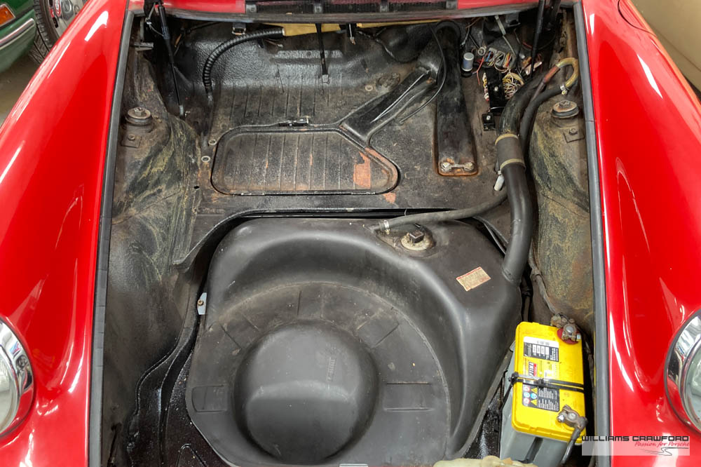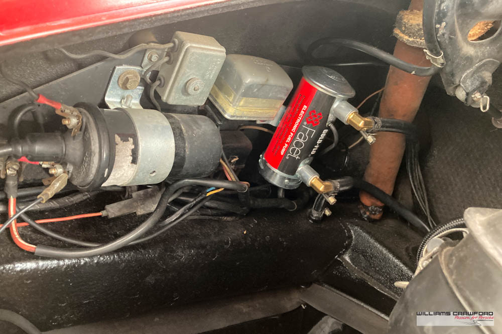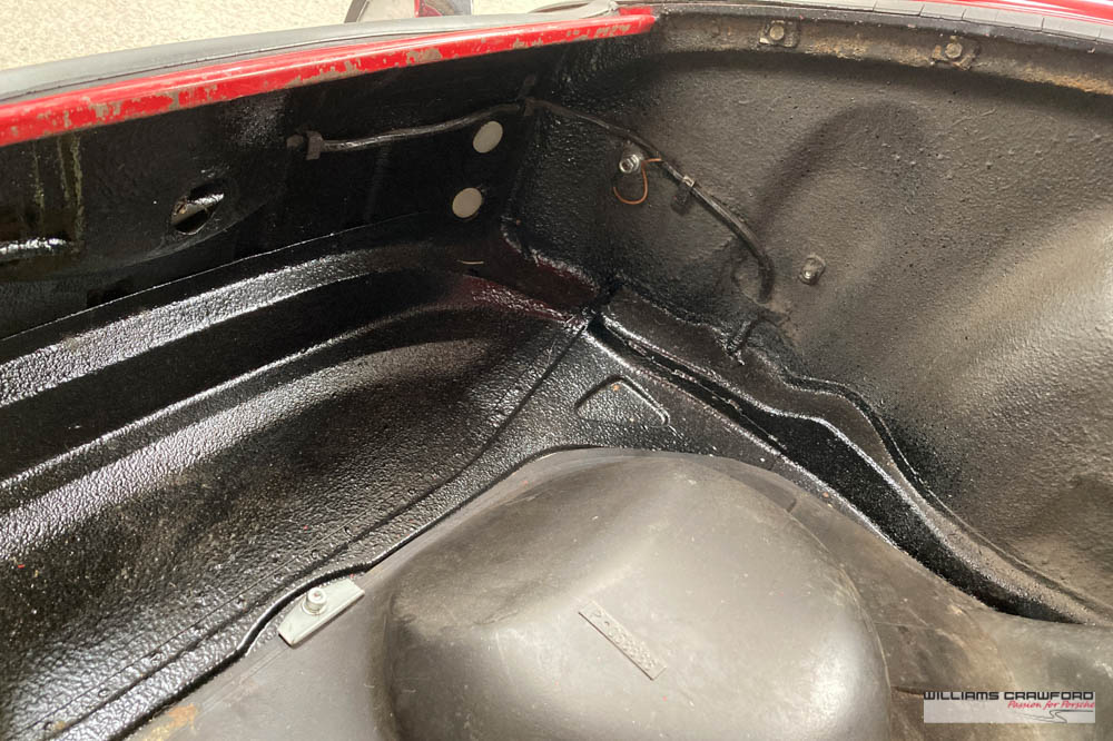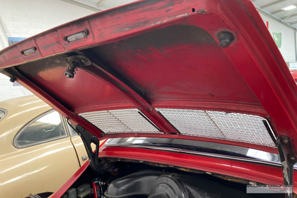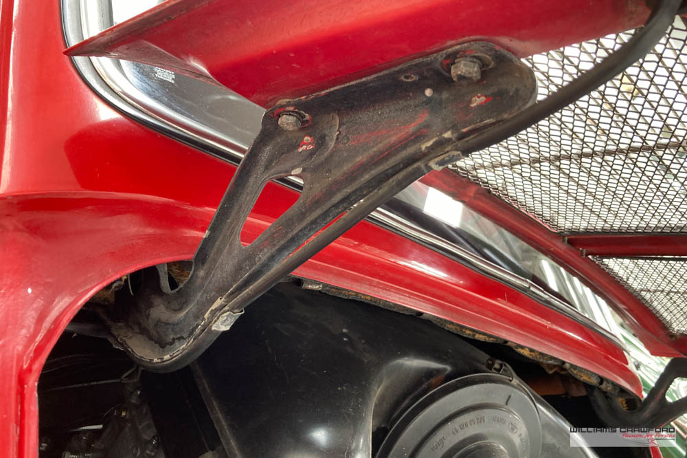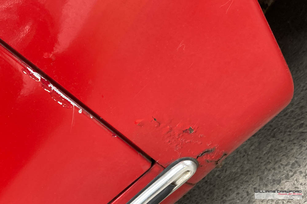 Finished in its original colour of 6602 Polo red, the aged paint probably dates from 30 or more years ago when it was given its first repaint (in the original red). Now that paint shows its age, but the panel gaps and the body lines are excellent. In fact, we believe that all the panels are original to the car; the front wings, with their original locating pins, sills, kidneys and floor. Just the tank support panel under the battery has been recently replaced.
