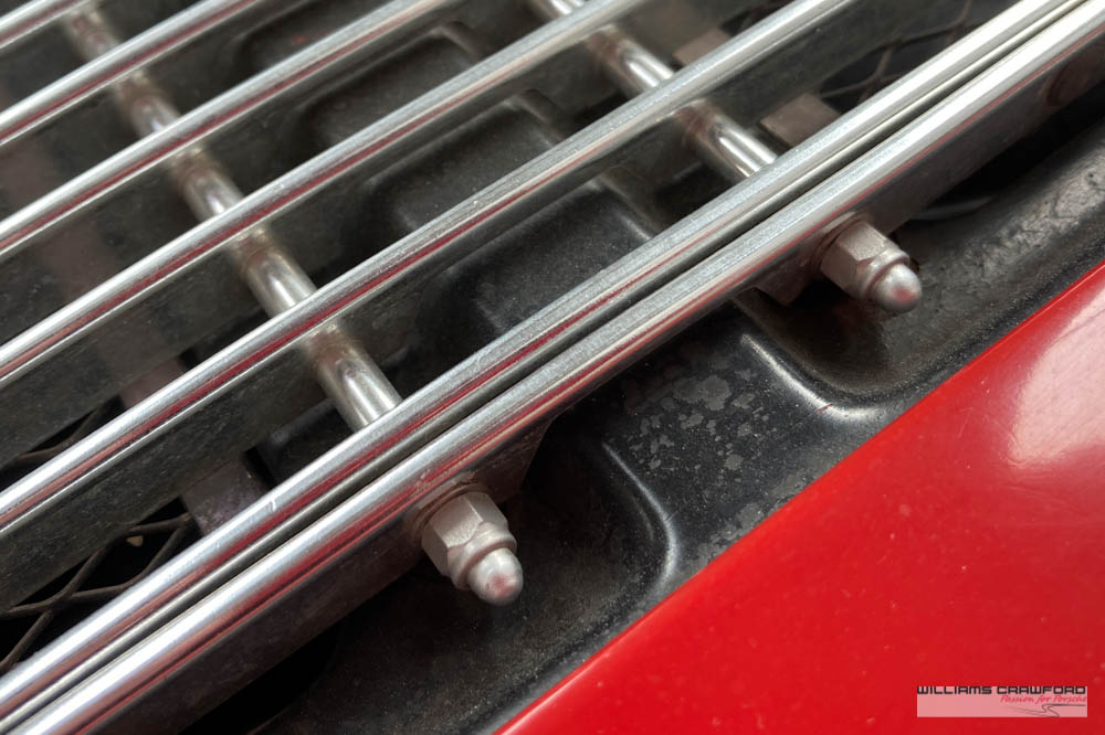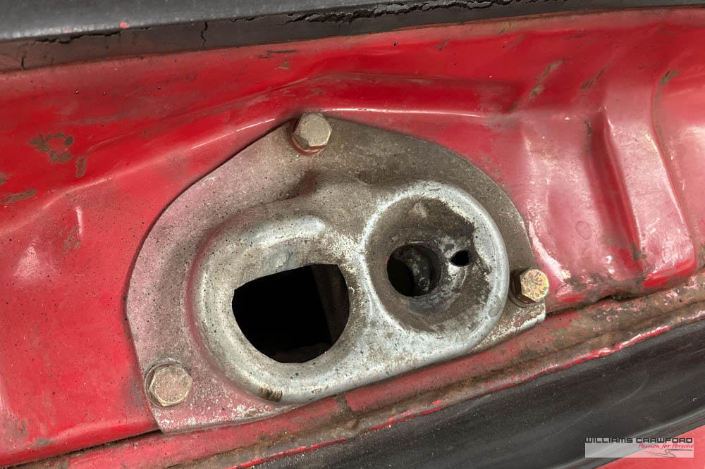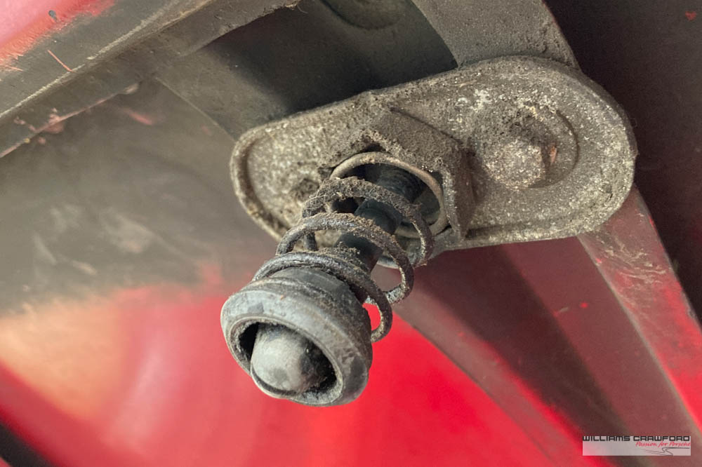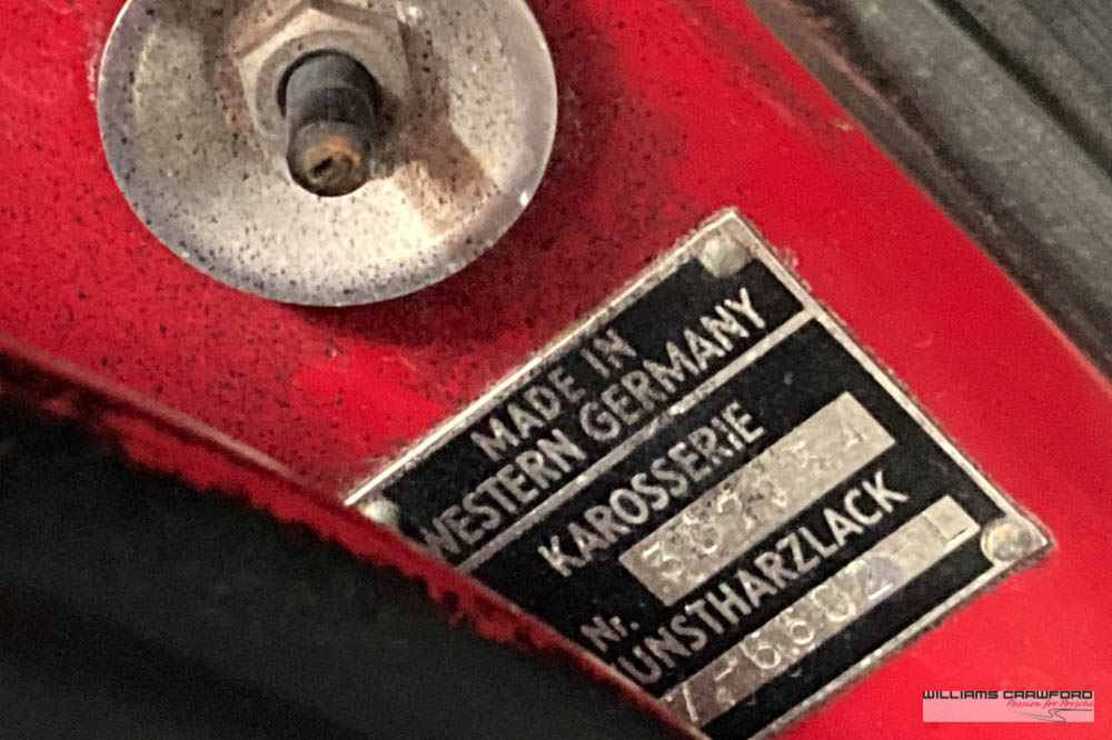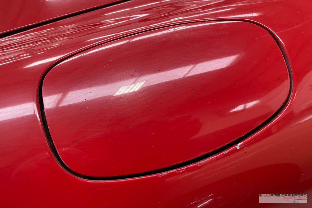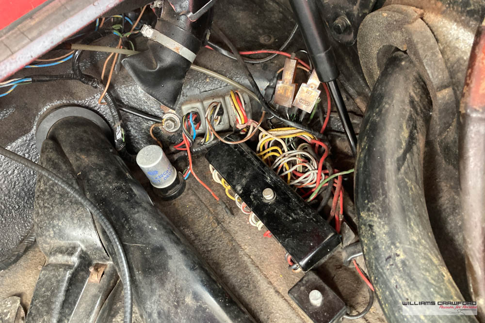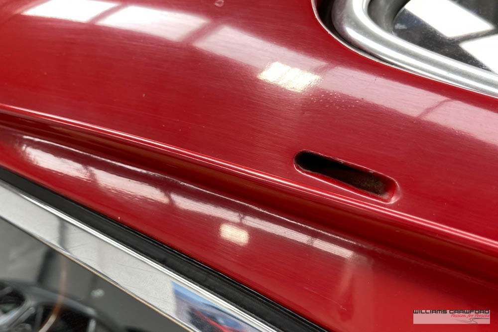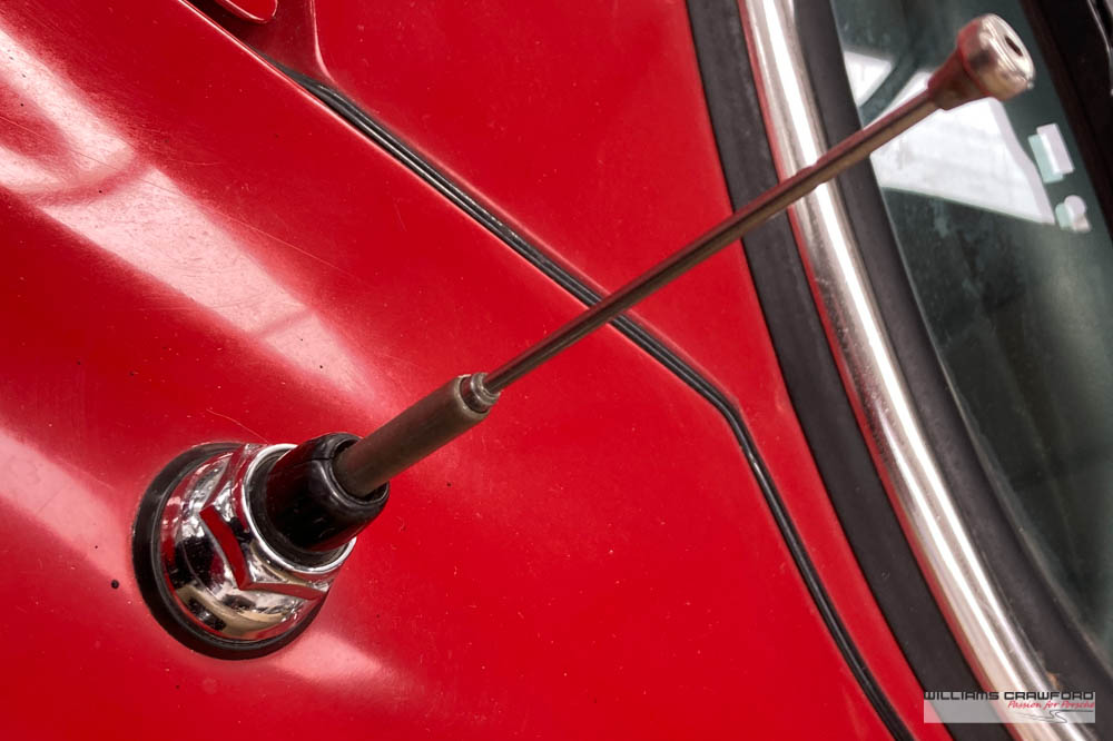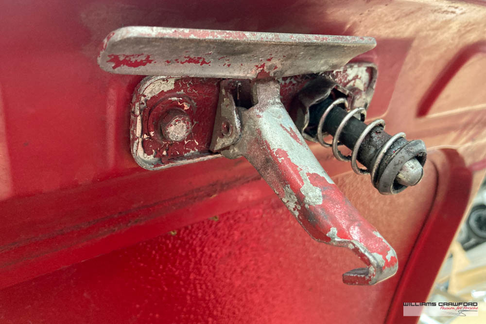 Finished in its original colour of 6602 Polo red, the aged paint probably dates from 30 or more years ago when it was given its first repaint (in the original red). Now that paint shows its age, but the panel gaps and the body lines are excellent. In fact, we believe that all the panels are original to the car; the front wings, with their original locating pins, sills, kidneys and floor. Just the tank support panel under the battery has been recently replaced.