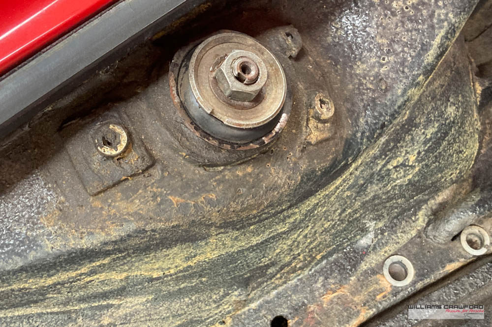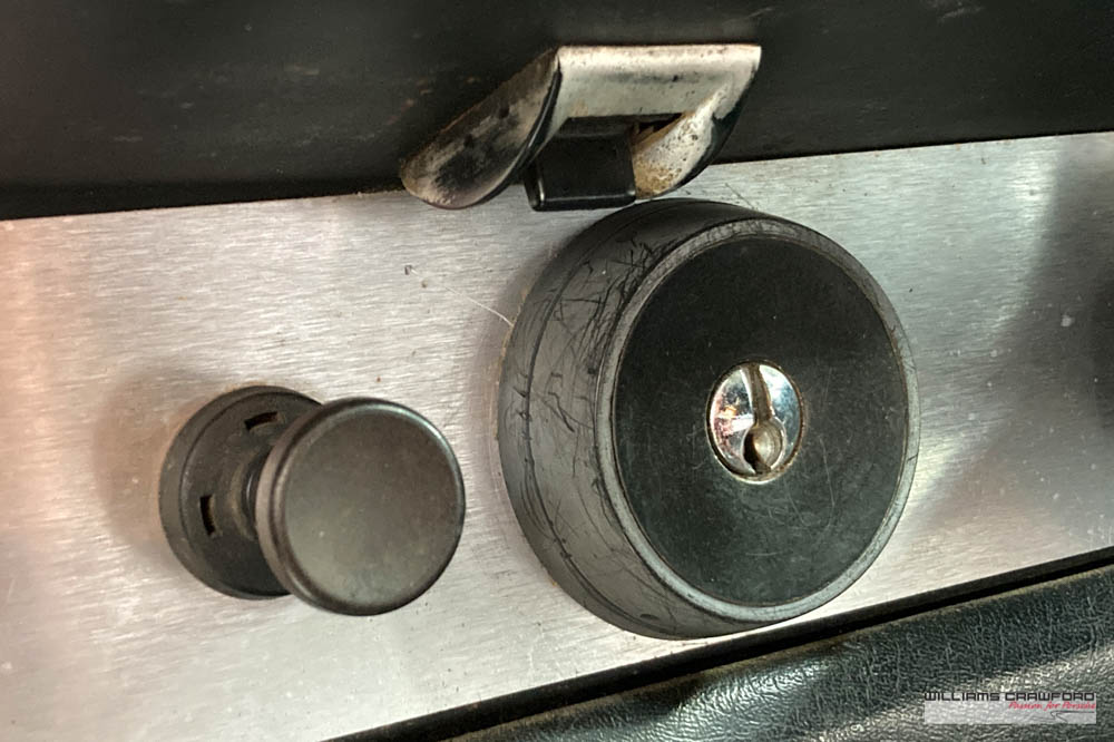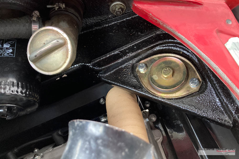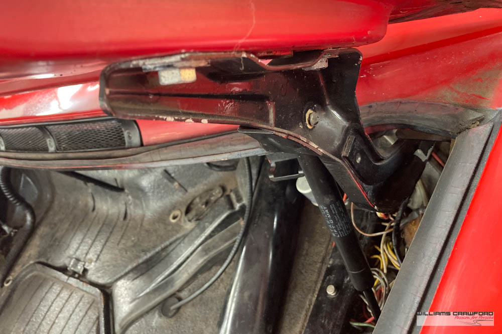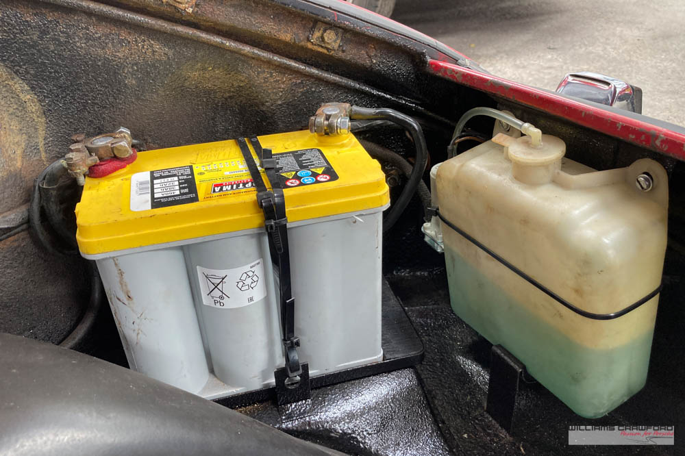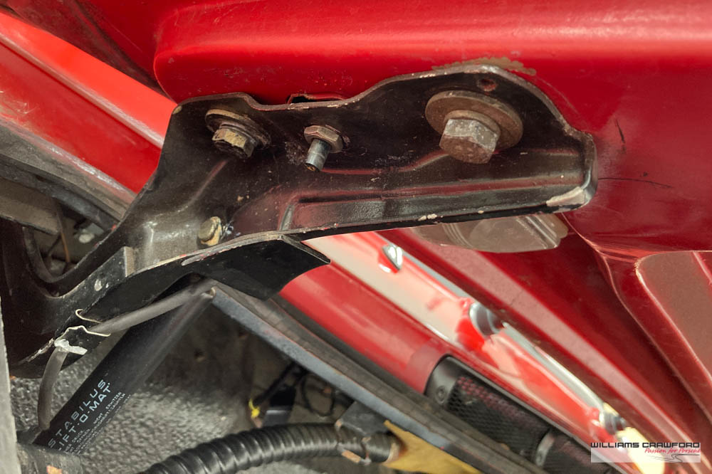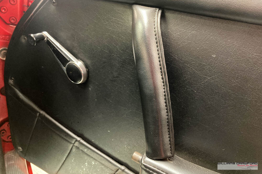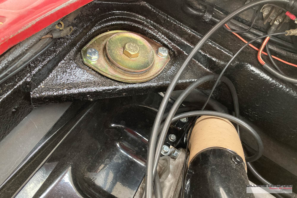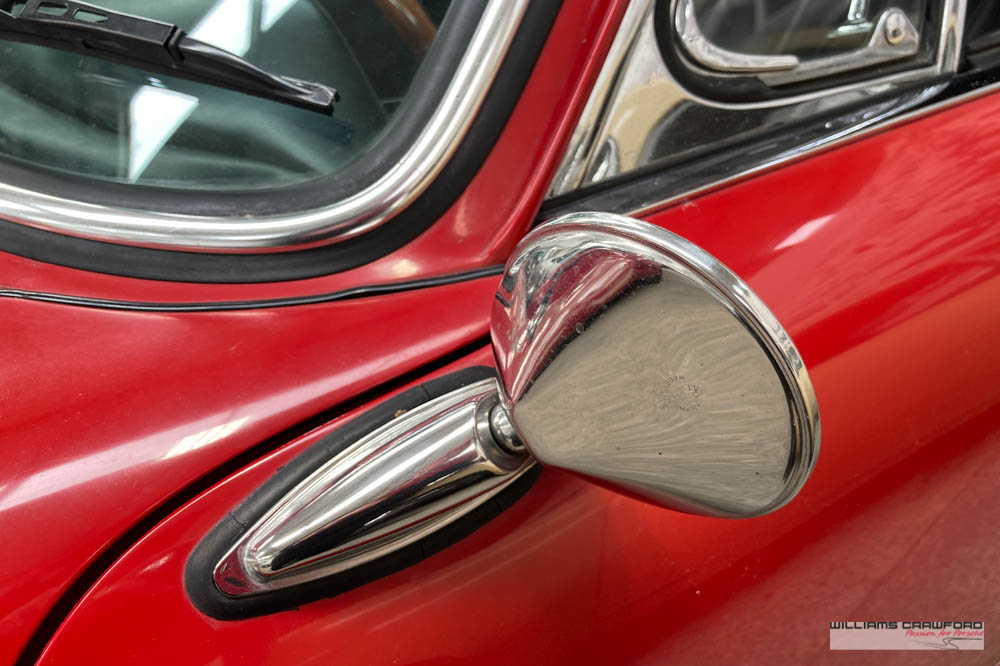 Finished in its original colour of 6602 Polo red, the aged paint probably dates from 30 or more years ago when it was given its first repaint (in the original red). Now that paint shows its age, but the panel gaps and the body lines are excellent. In fact, we believe that all the panels are original to the car; the front wings, with their original locating pins, sills, kidneys and floor. Just the tank support panel under the battery has been recently replaced.