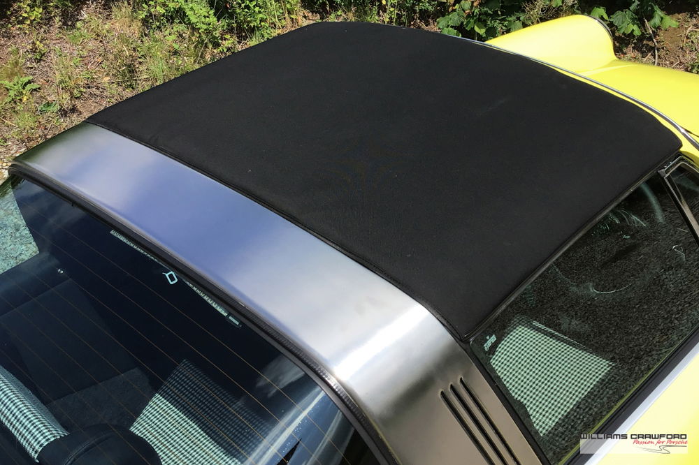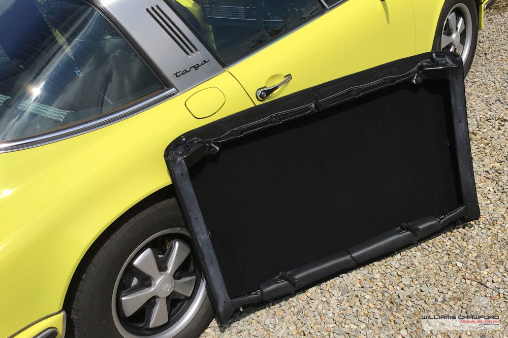 The Targa roof, completely refurbished and finished in black mohair, unlatches with just 2 clips and folds neatly in its own storage bag.