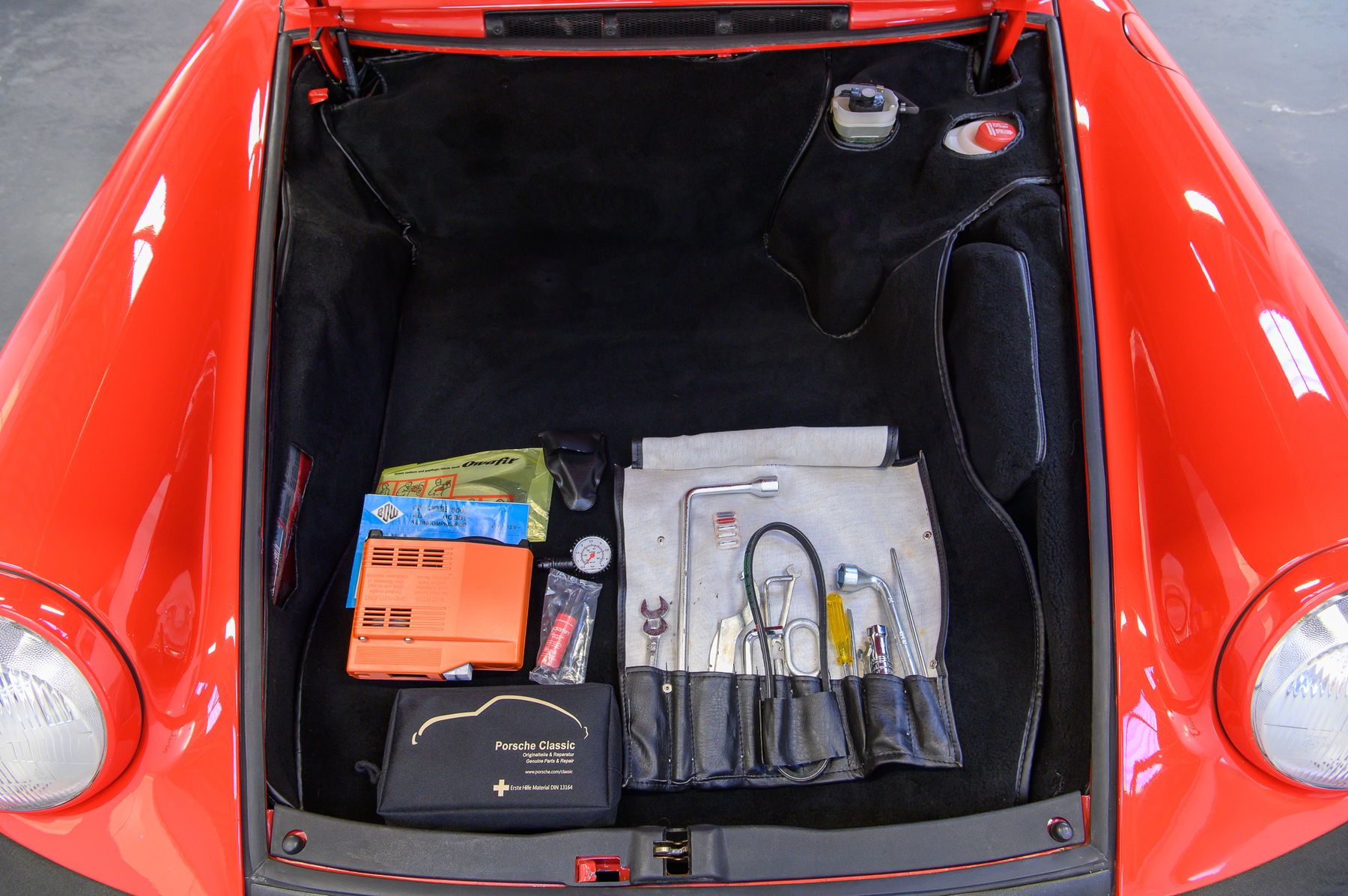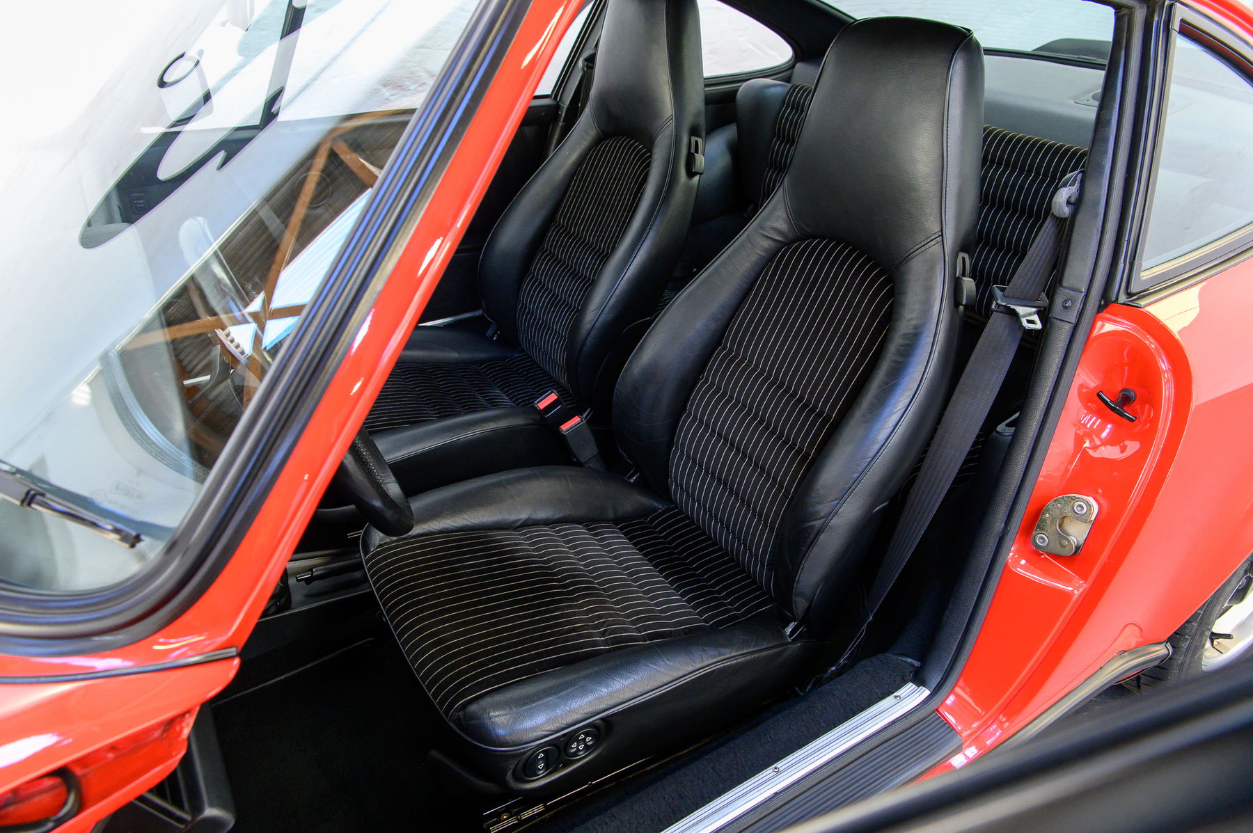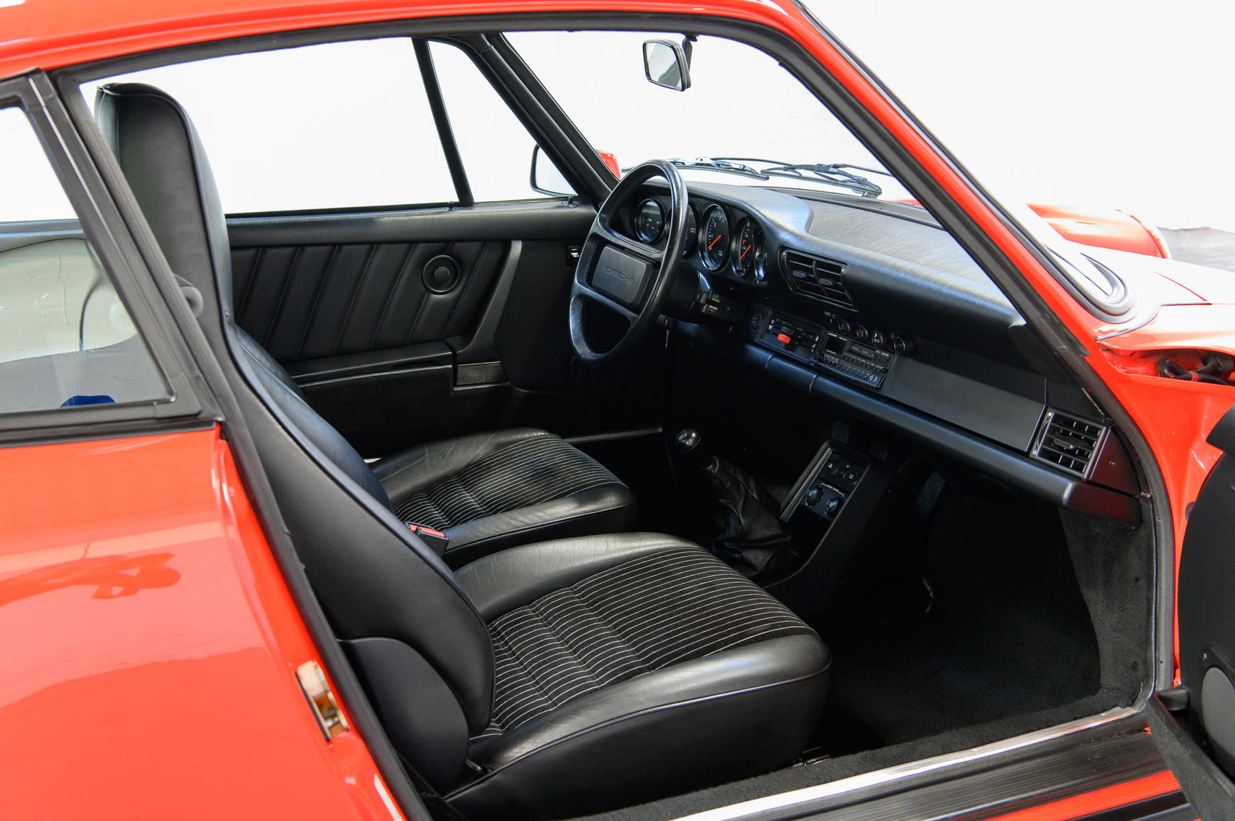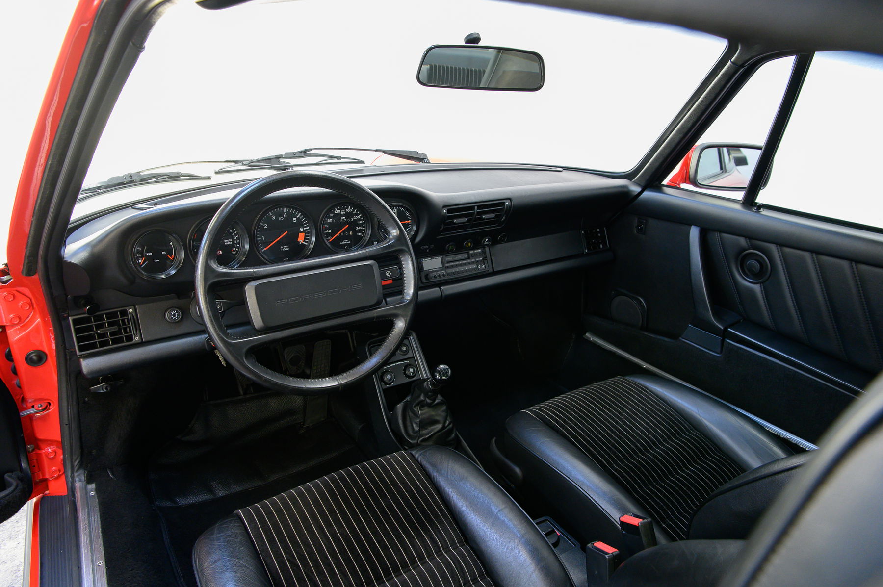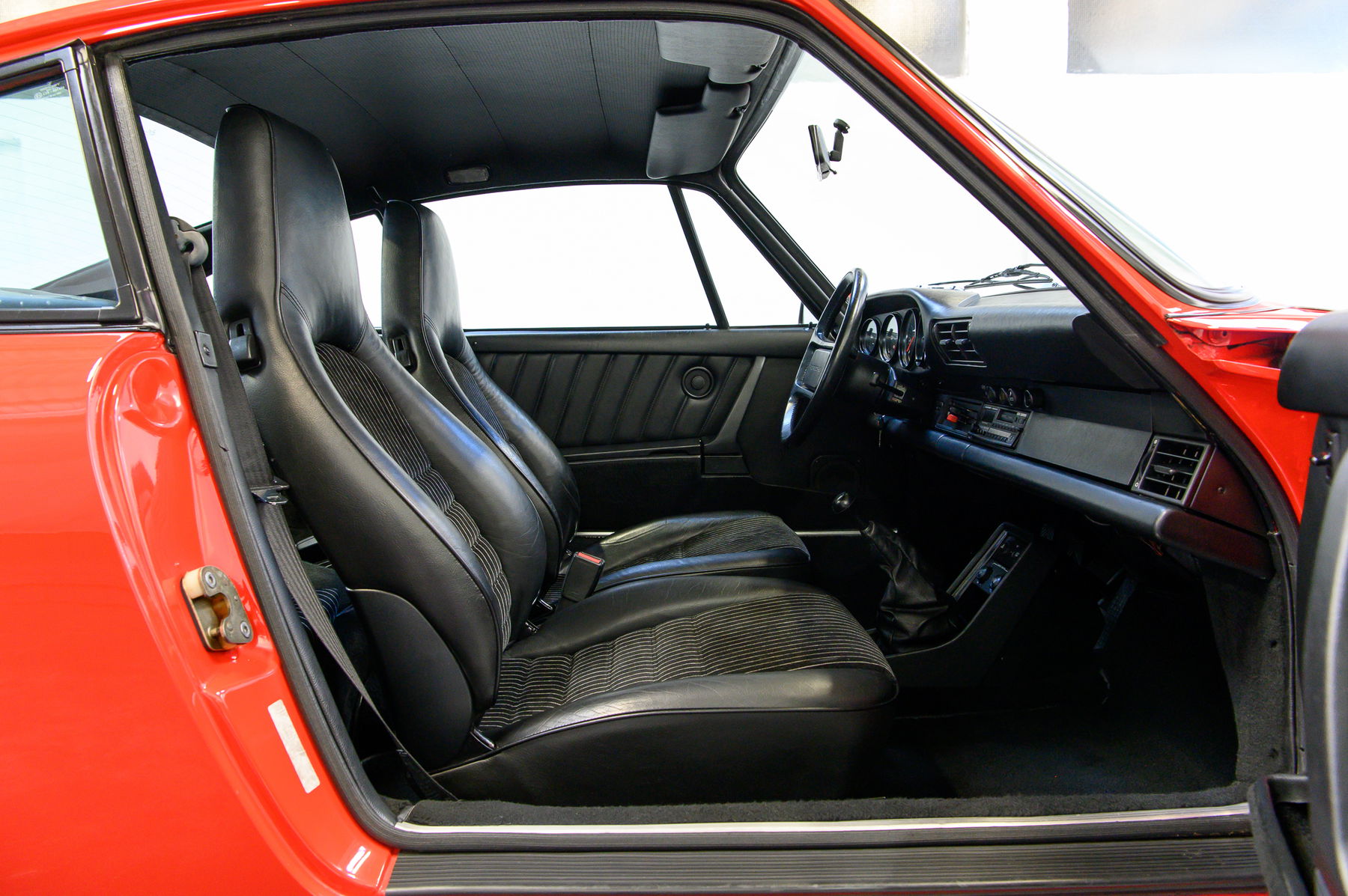 Der 911 ist unfallfrei und besitzt weitestgehend Lackwerte auf dem Niveau der Auslieferung. Perfekte Spaltmaße, unberührte Karosserieschrauben und Originalität bis ins Detail erfreuen den Kenner, Spuren von Winterbetrieb sind nicht zu erkennen. Eine weitere Seltenheit: Weder Heckscheibenwischer noch Schiebedach stören die Linien. Das Interieur mit begehrtem Nadelstreifenvelours präsentiert sich mit nur minimaler Patina ebenso in außergewöhnlich gutem Zustand.