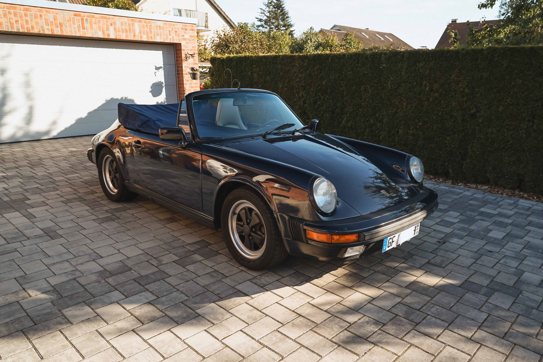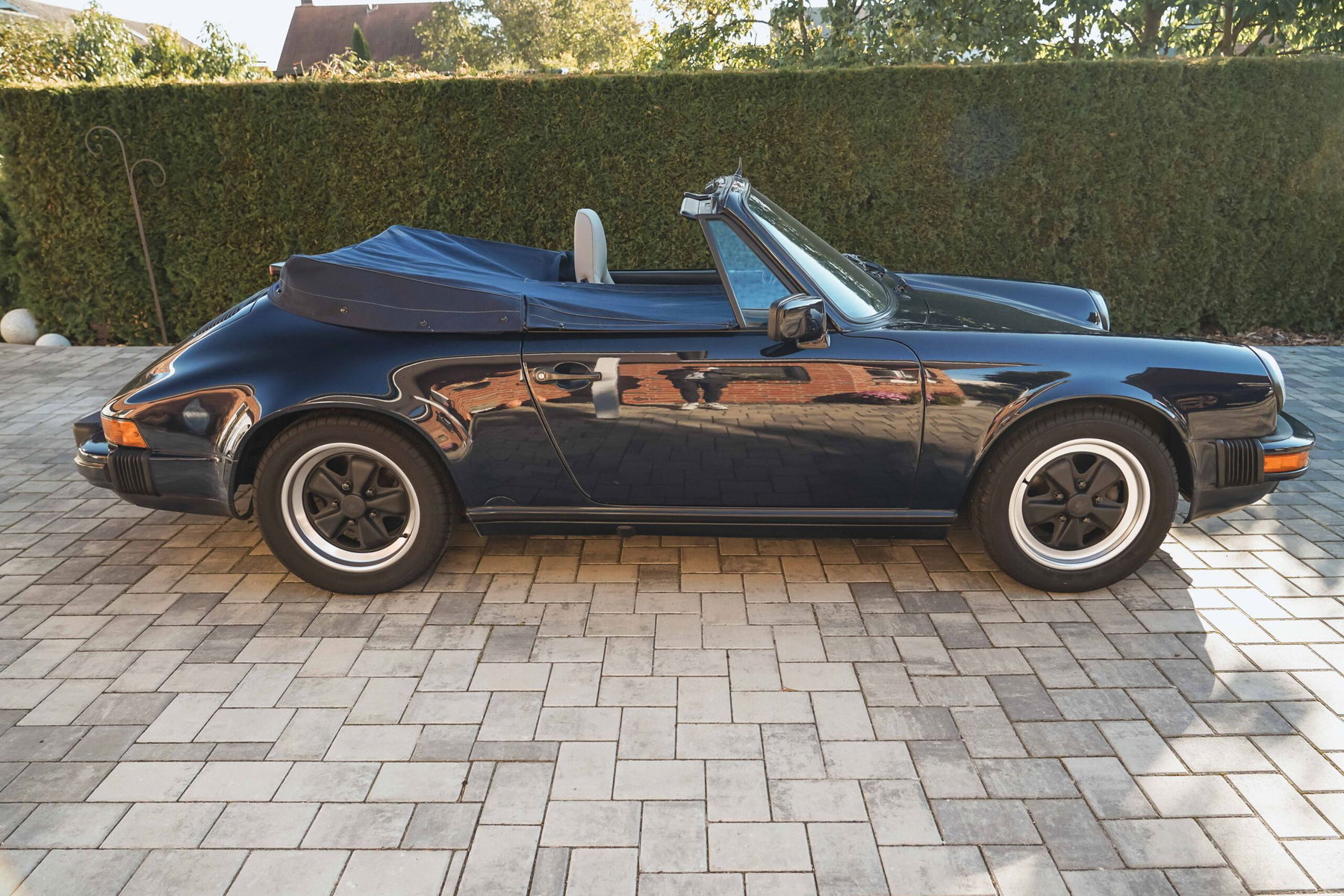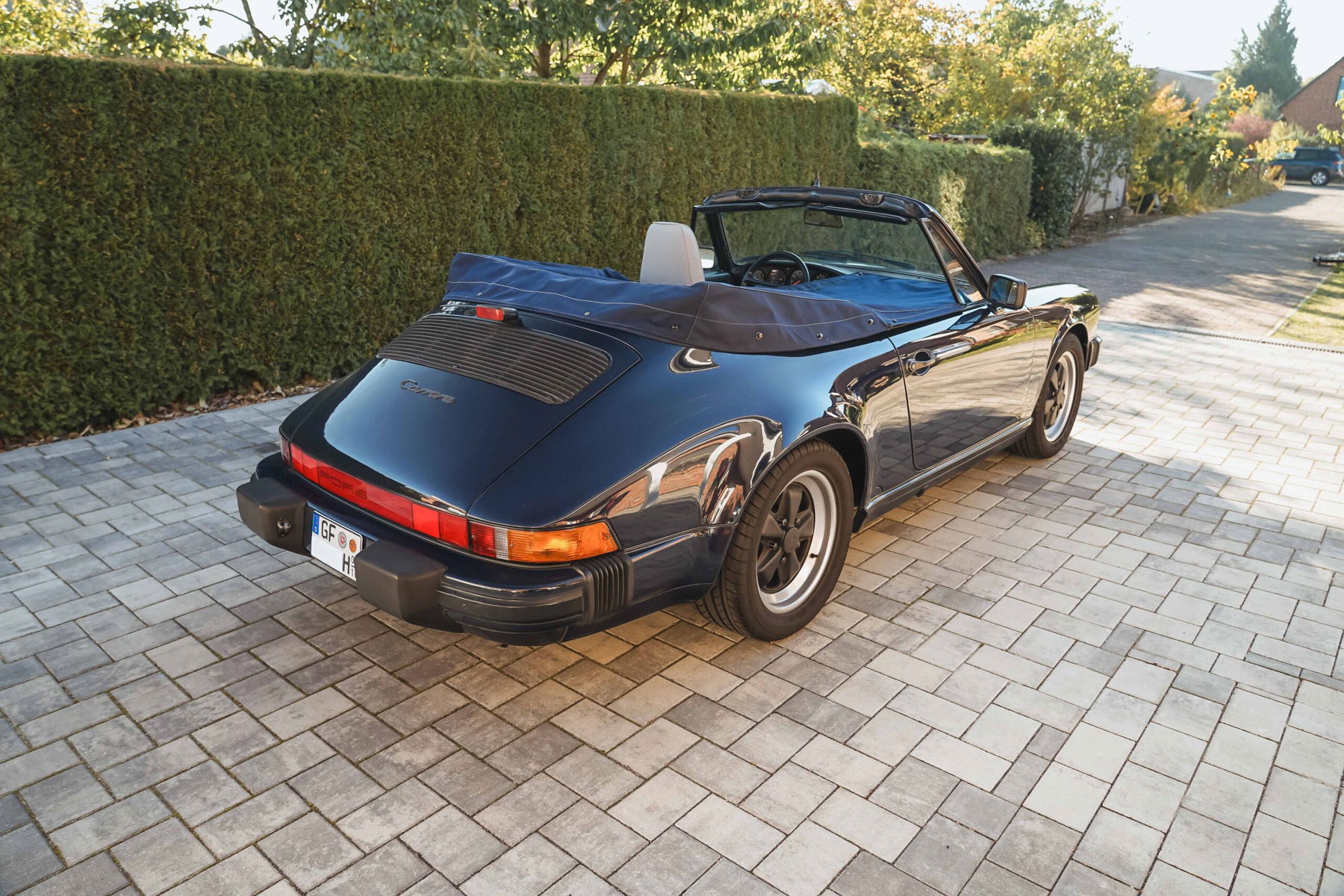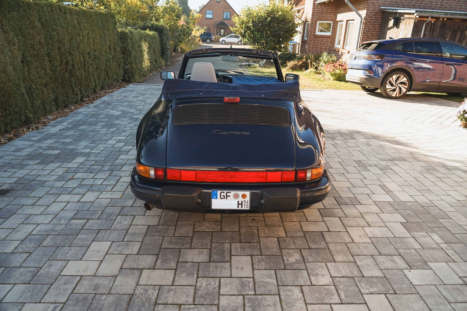 Zum Verkauf steht ein Porsche 911 Carrera Cabriolet (G-Modell) aus dem Jahr 1988 in klassischem Blau.