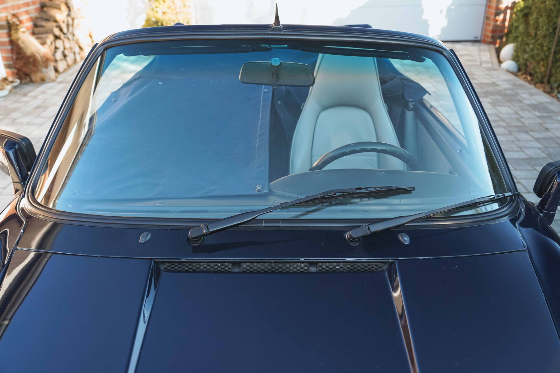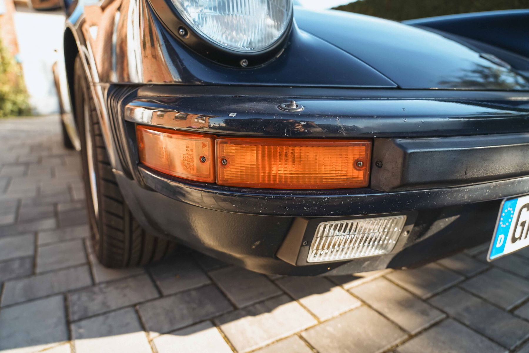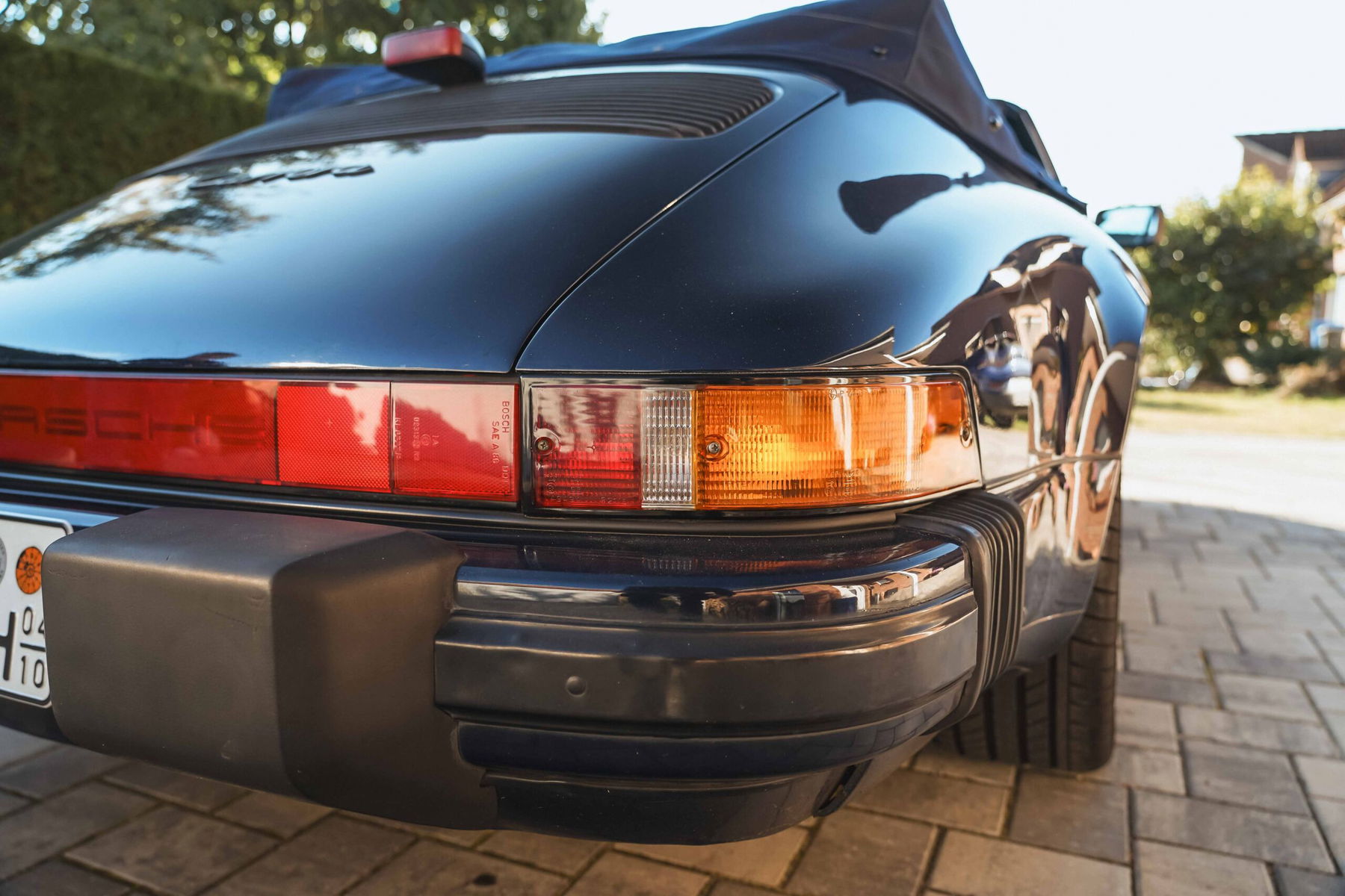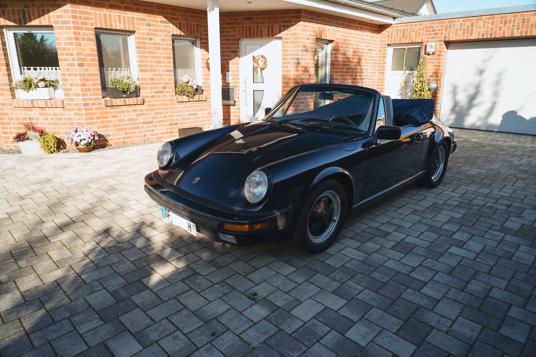 Zum Verkauf steht ein Porsche 911 Carrera Cabriolet (G-Modell) aus dem Jahr 1988 in klassischem Blau.