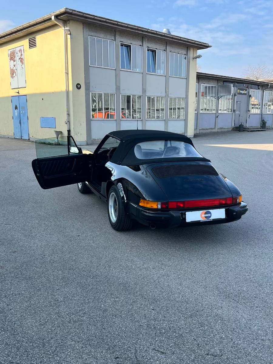 Dieser Wagen wurde im Juli 1988 im Porsche Zentrum Hülpert an seine Erstbesitzerin ausgeliefert und sie fuhr ihn bis jetzt. Tatsächlich befindet sich aussschließlich ihr Name in den KFZ Unterlagen, Rechnungen und im Scheckheft. Offensichtlich wurde der Wagen von der Dame sehr gehegt und gepflegt. Er befindet sich nach nunmehr 38 Jahren immer noch in einem sehr guten originalen Zustand. Das Verdeck und die Heckscheibe sind sehr gut. Der Innenraum ist vollkommen original und ebenso erstklassig. Die Teppichmatten haben die Producktionsaufkleber auf der Rückseite. Wir haben den Wagen mit einem Lackschichtdickenmessgerät geprüft und keine Nachlackierungen feststellen können. Er ist unfallfrei.