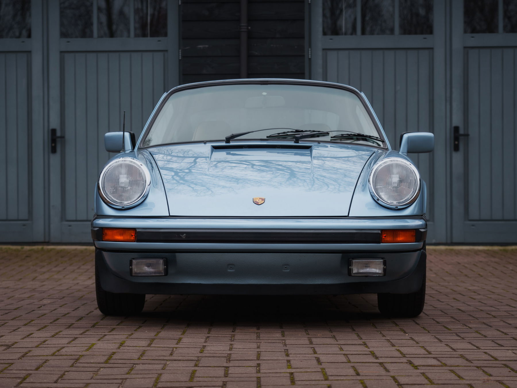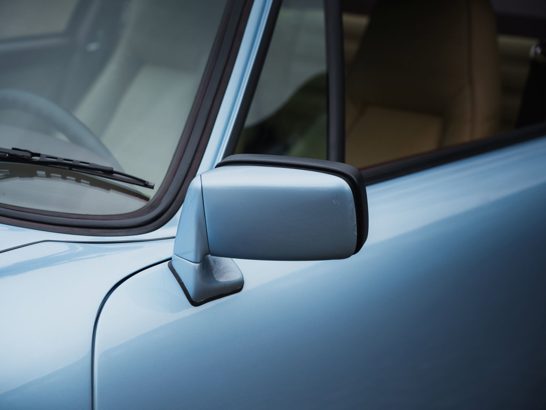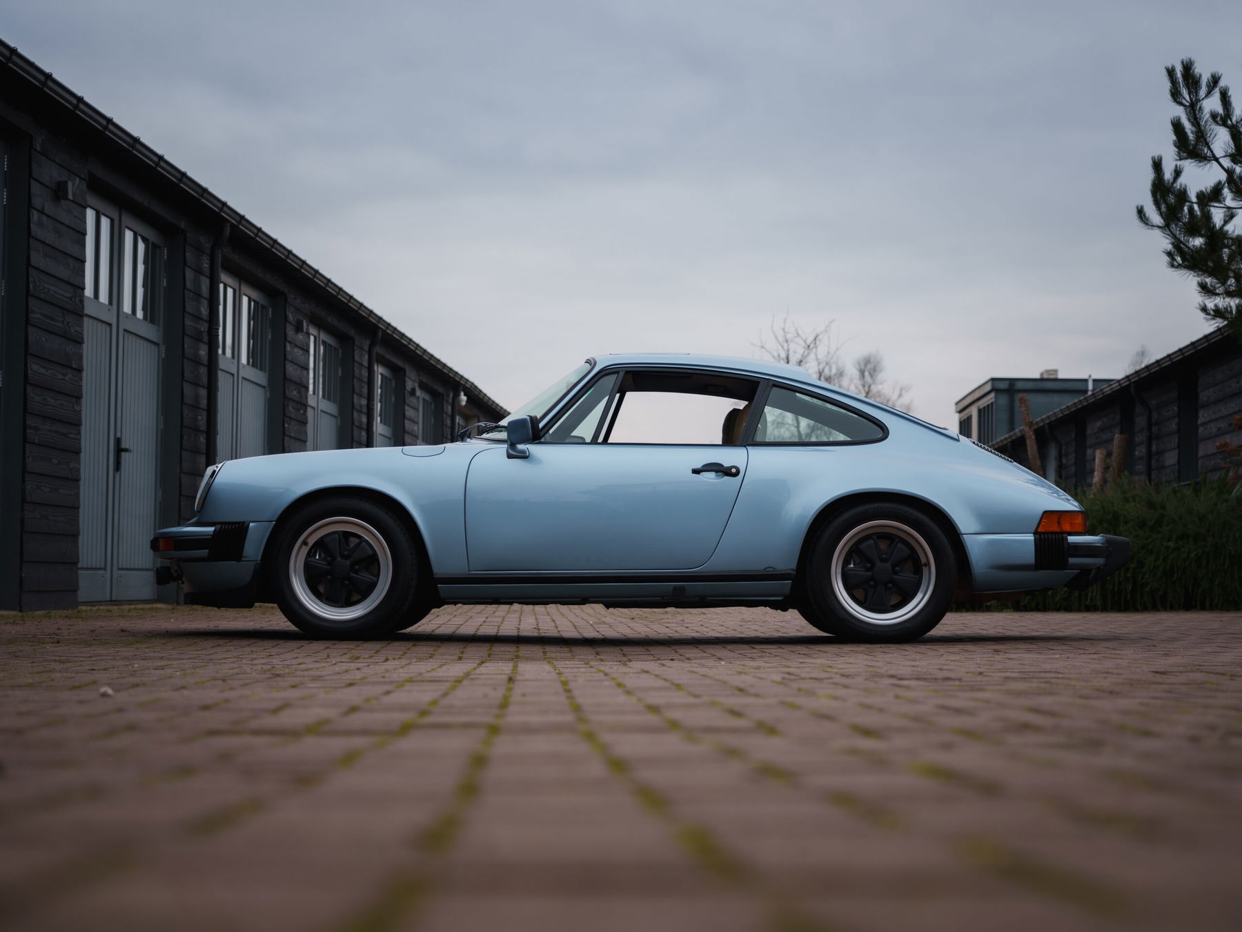 Dieses 1980er Porsche 911 3.0 SC Coupé ist in Hellblau Metallic (Hellblau) lackiert und verfügt über eine beige Lederausstattung mit dunkelbraunen Akzenten.
