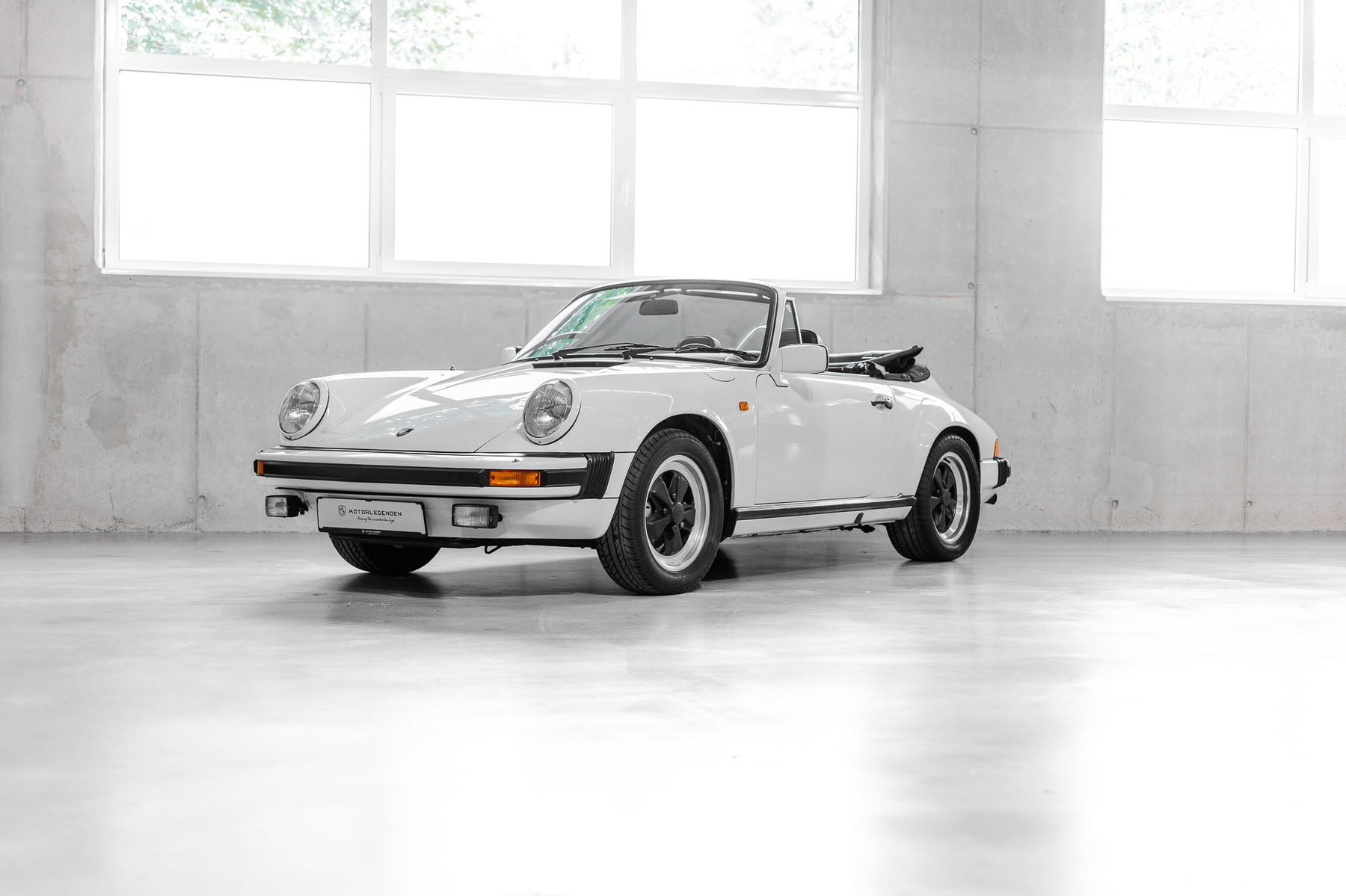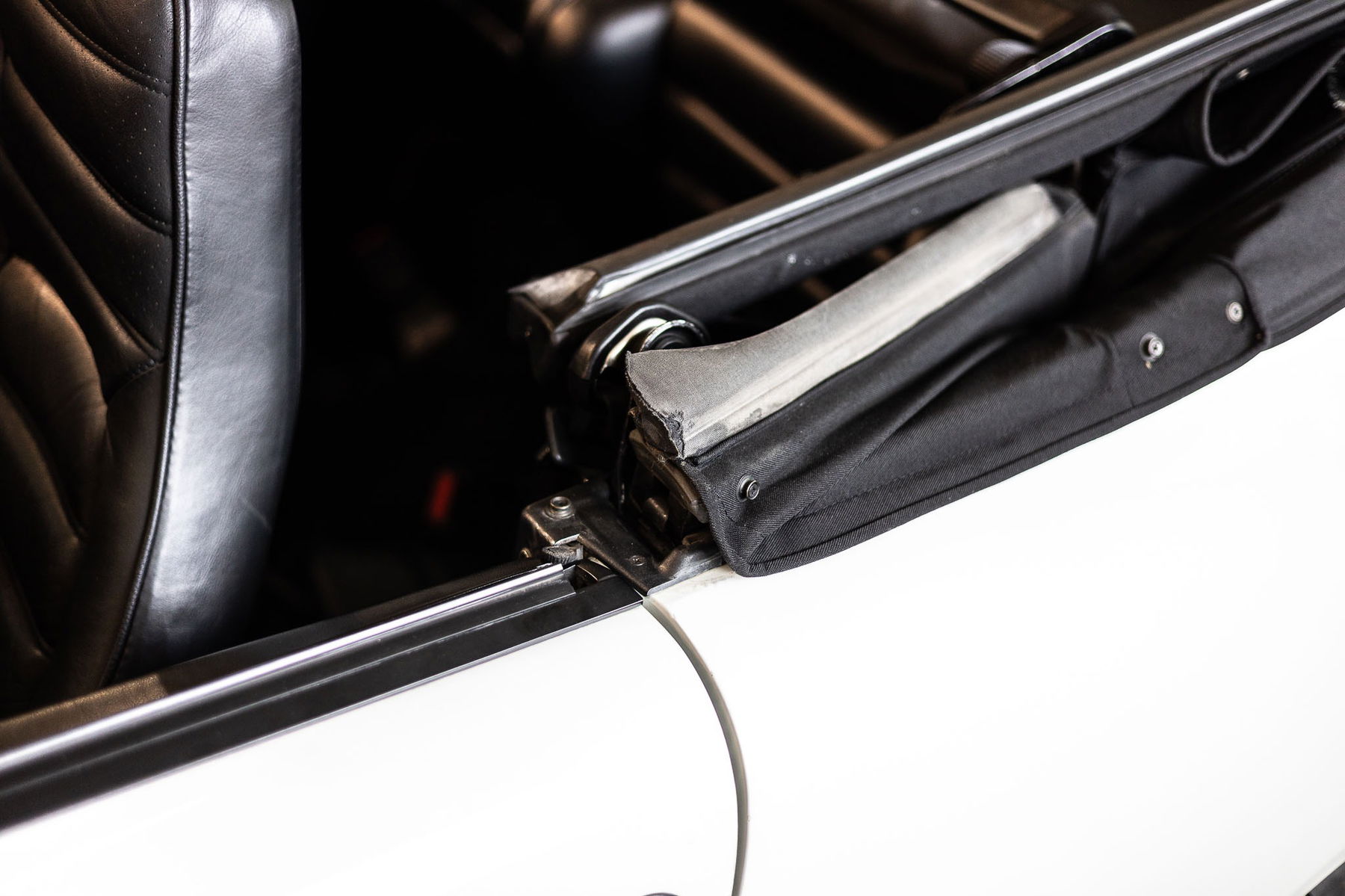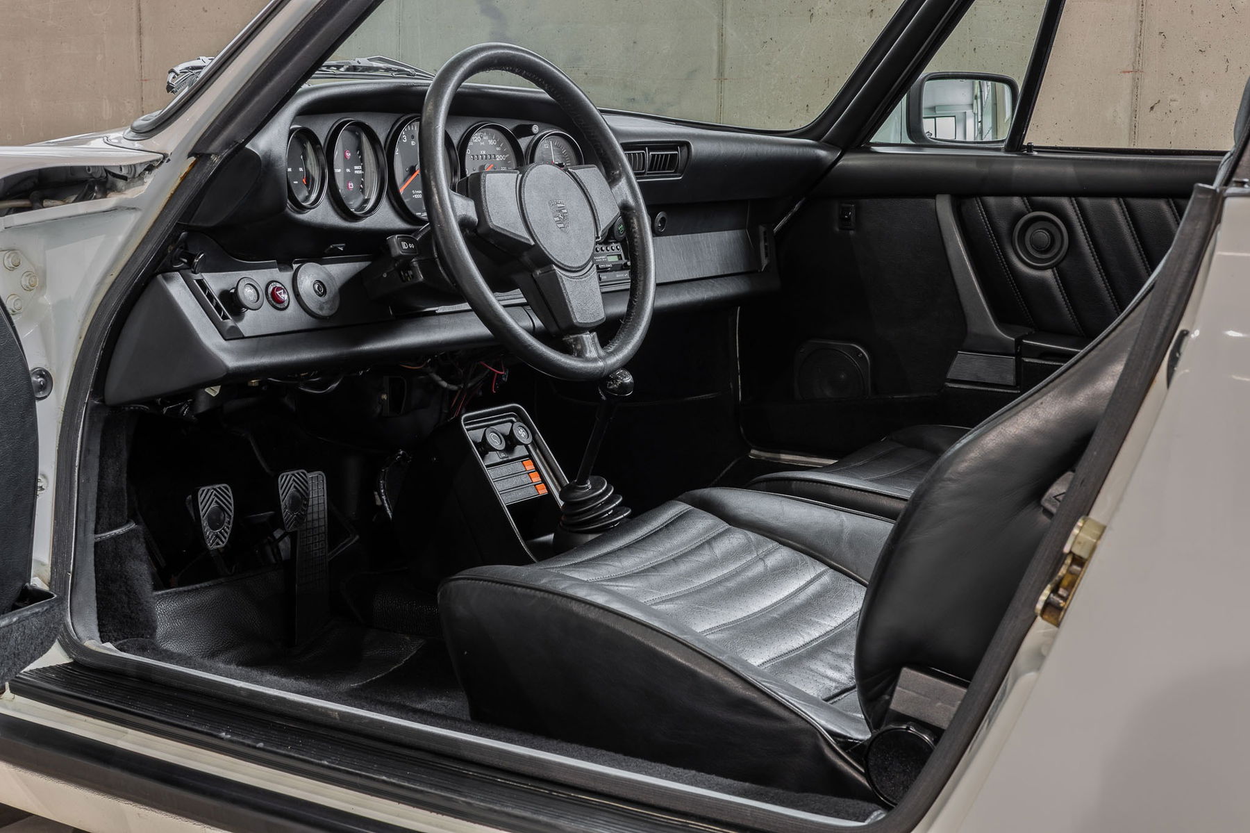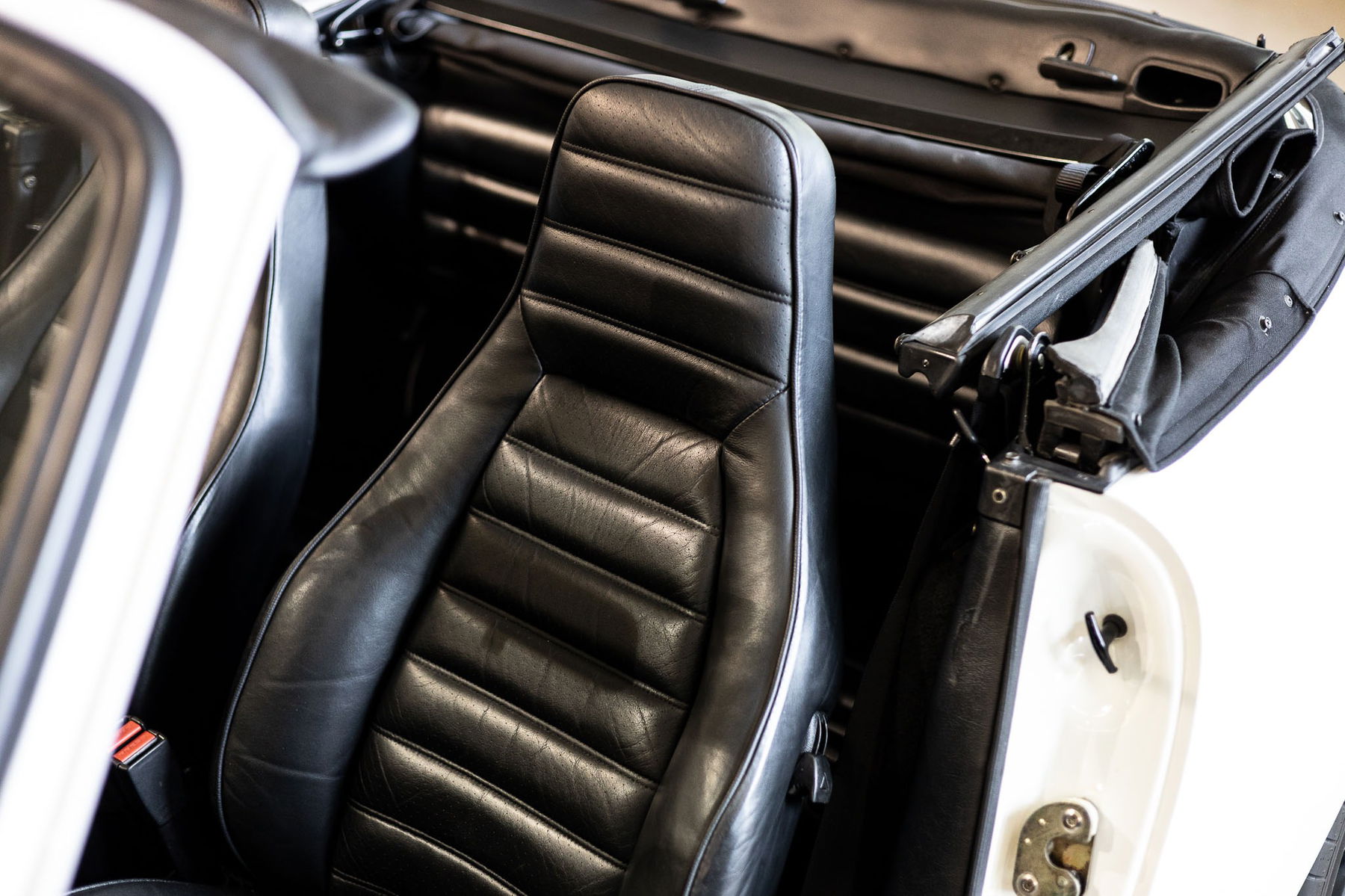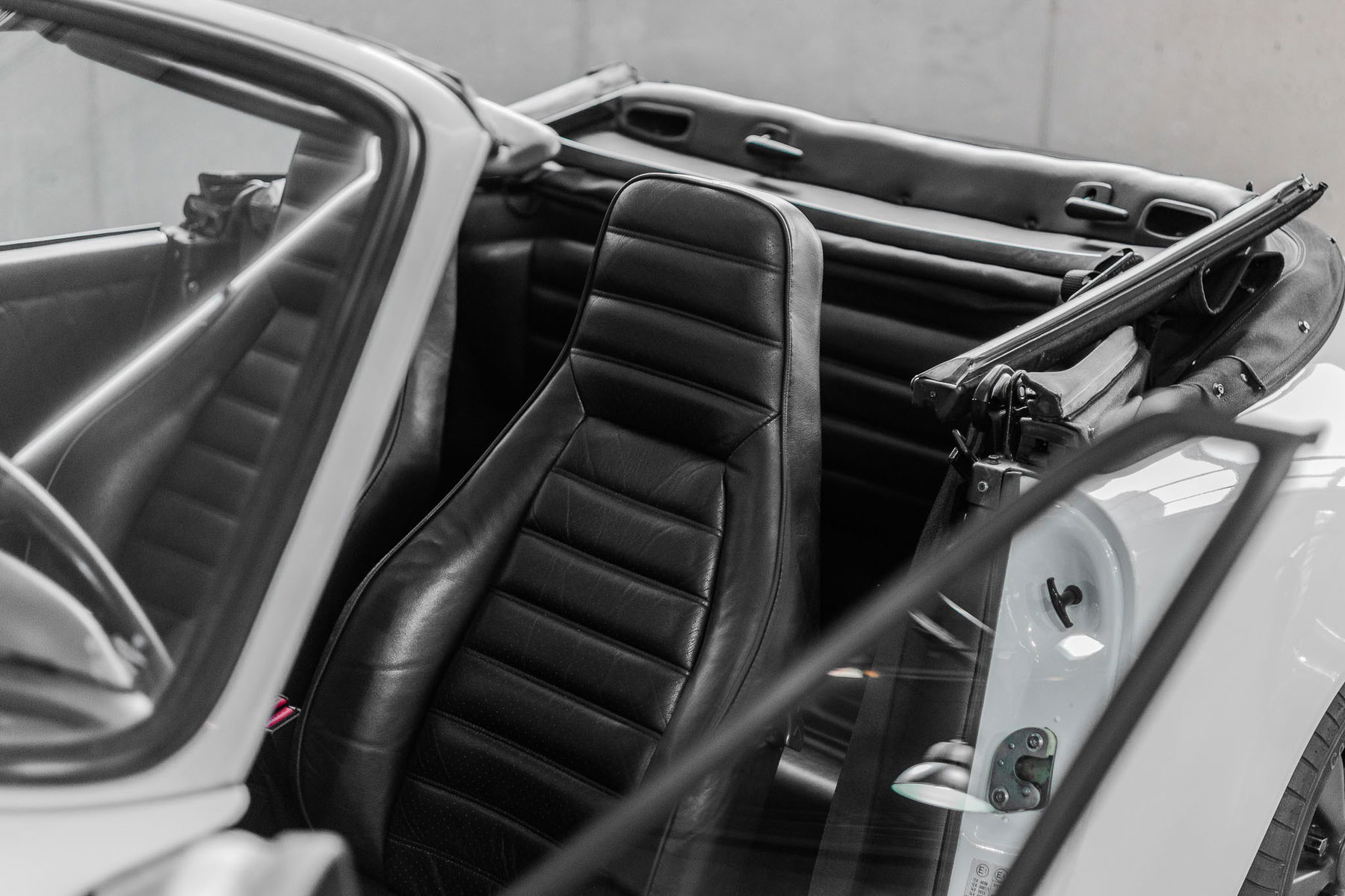 Die klassische Farbkombination in Grandprixweiß mit schwarzer Lederausstattung und dem schwarzen Verdeck, sowie den geschmiedeten Leichtmetallräder mit schwarzem Stern, ist auch von der Farbgebung wohl mit die schönste Art einen Porsche offen zu Fahren. Eine damals seltene Klimaanlage wurde auf Wunsch des Eigentümers zusätzlich ab Werk geordert.