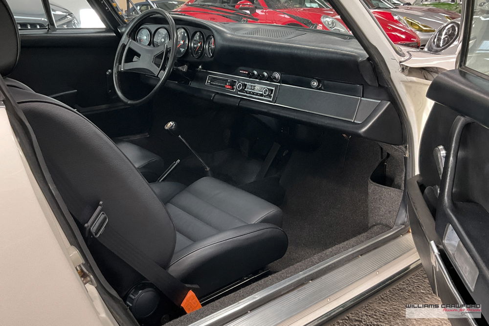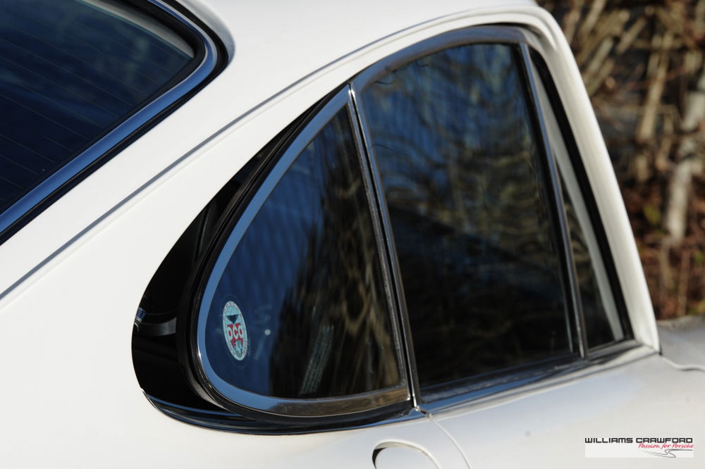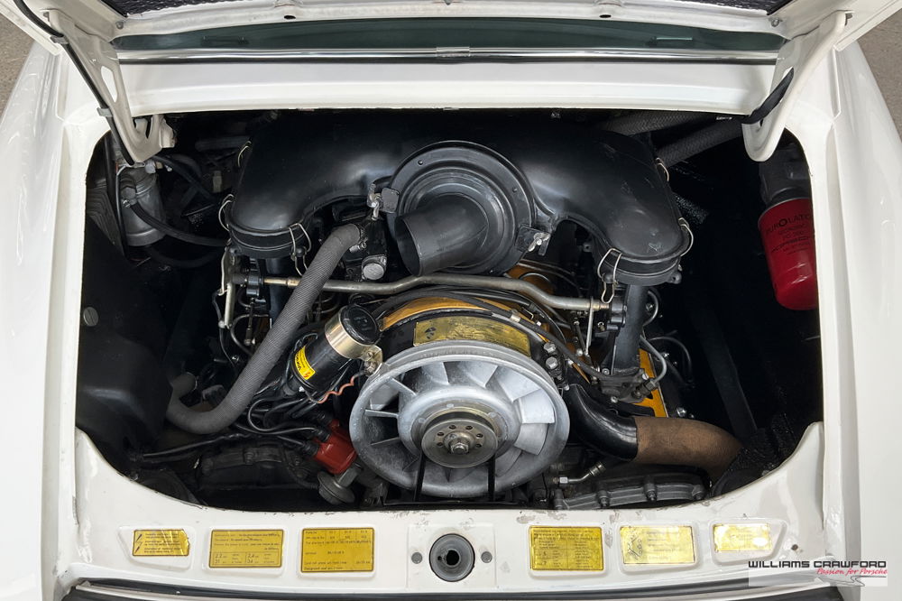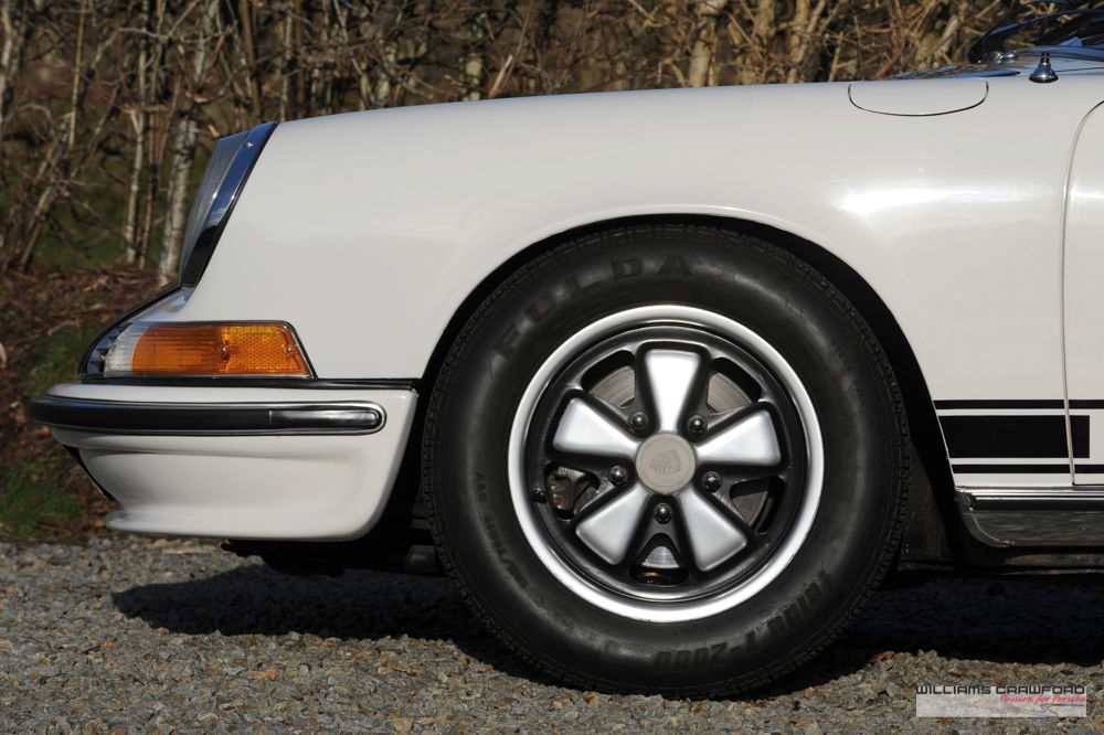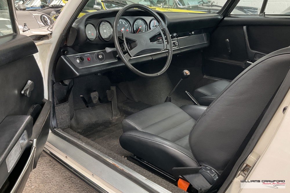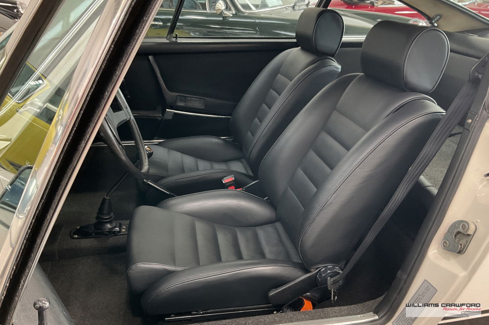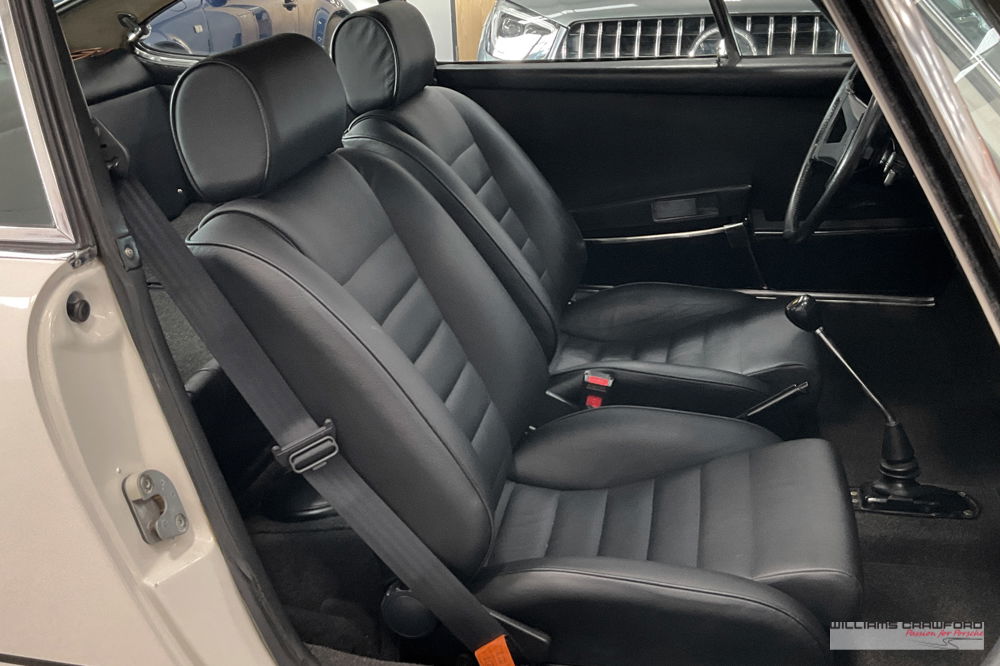 The colour is not seen often, and lends itself to a little personalization. This one has been given black stripes on the bonnet and ‘PORSCHE’ door decals. Additionally, it is fitted with the ‘S’ spec front bumper and integrated spoiler, plus very nice period correct replica Recaro seats from BF Torino (‘Le Mans’ model in black leather). It also has three point inertia reel seat belts.