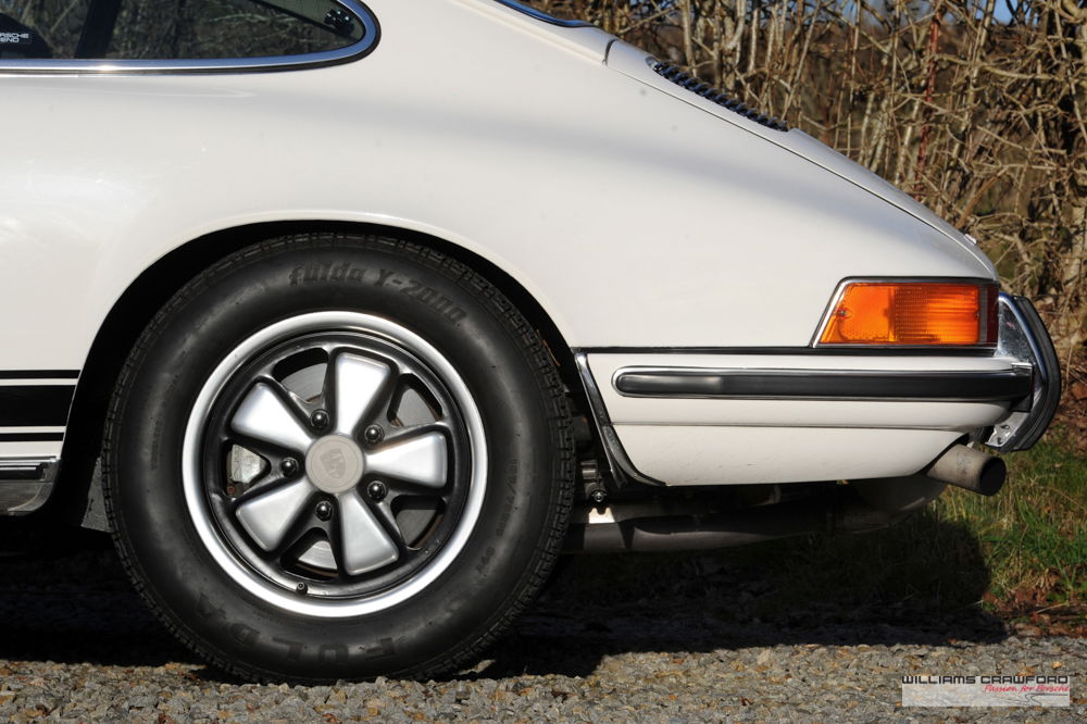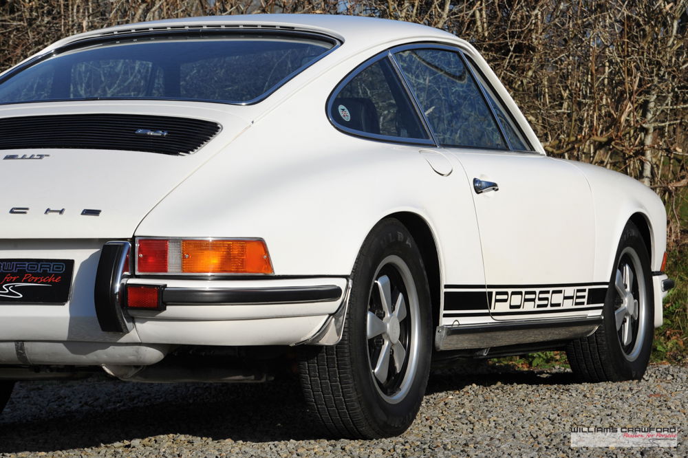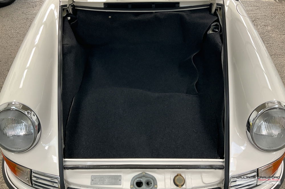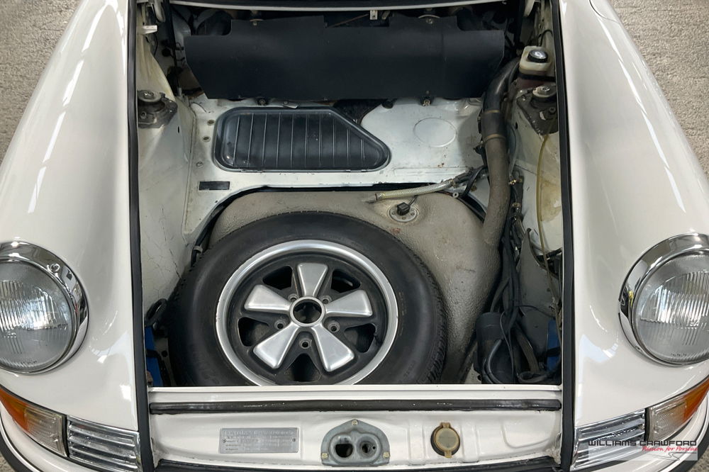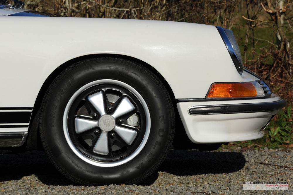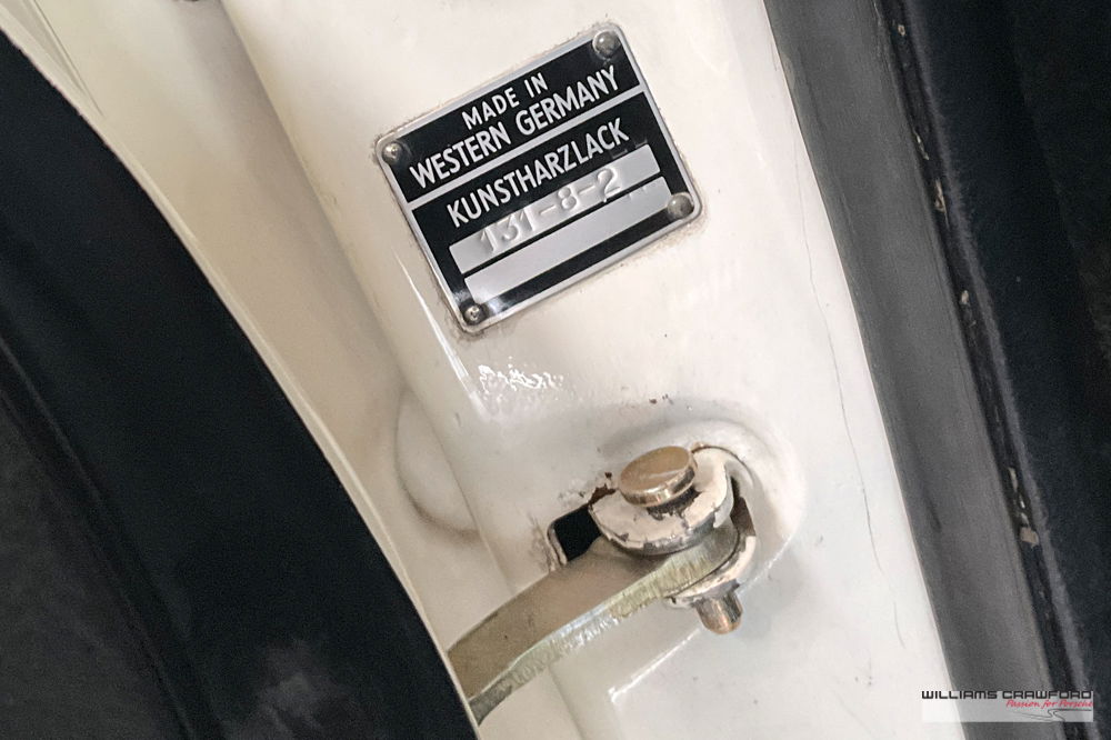 The colour is not seen often, and lends itself to a little personalization. This one has been given black stripes on the bonnet and ‘PORSCHE’ door decals. Additionally, it is fitted with the ‘S’ spec front bumper and integrated spoiler, plus very nice period correct replica Recaro seats from BF Torino (‘Le Mans’ model in black leather). It also has three point inertia reel seat belts.