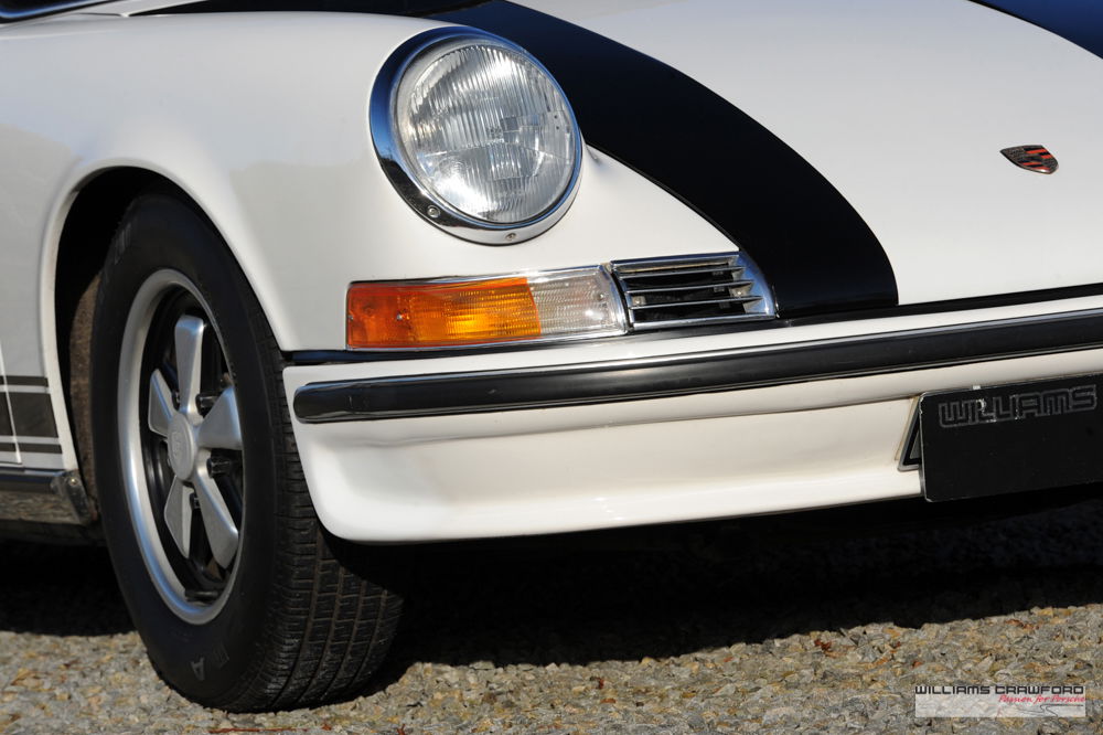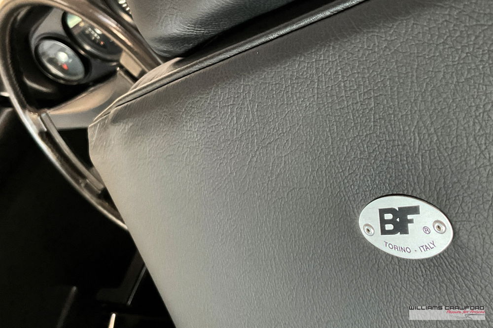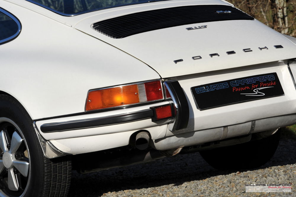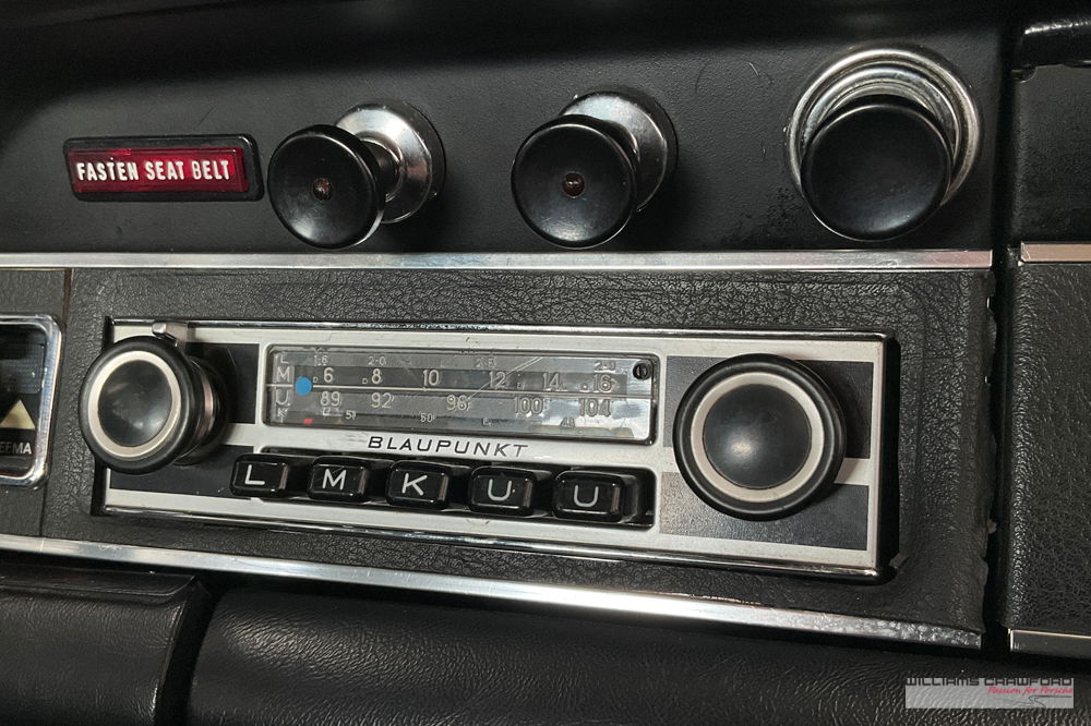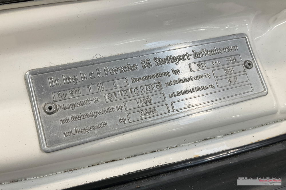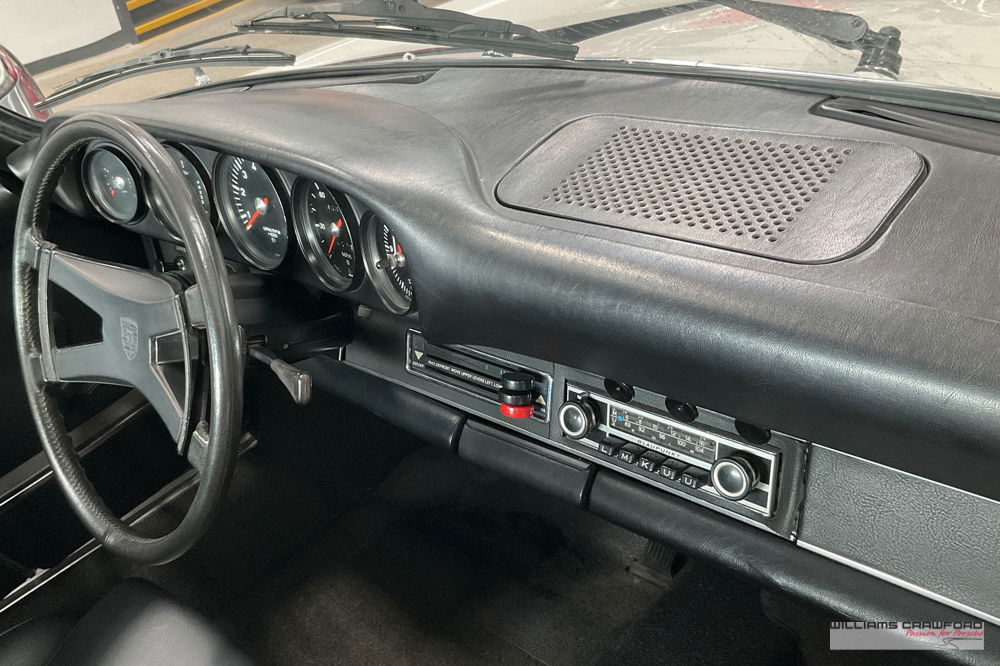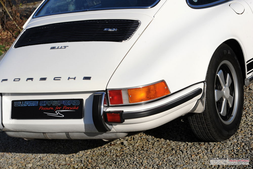 The colour is not seen often, and lends itself to a little personalization. This one has been given black stripes on the bonnet and ‘PORSCHE’ door decals. Additionally, it is fitted with the ‘S’ spec front bumper and integrated spoiler, plus very nice period correct replica Recaro seats from BF Torino (‘Le Mans’ model in black leather). It also has three point inertia reel seat belts.