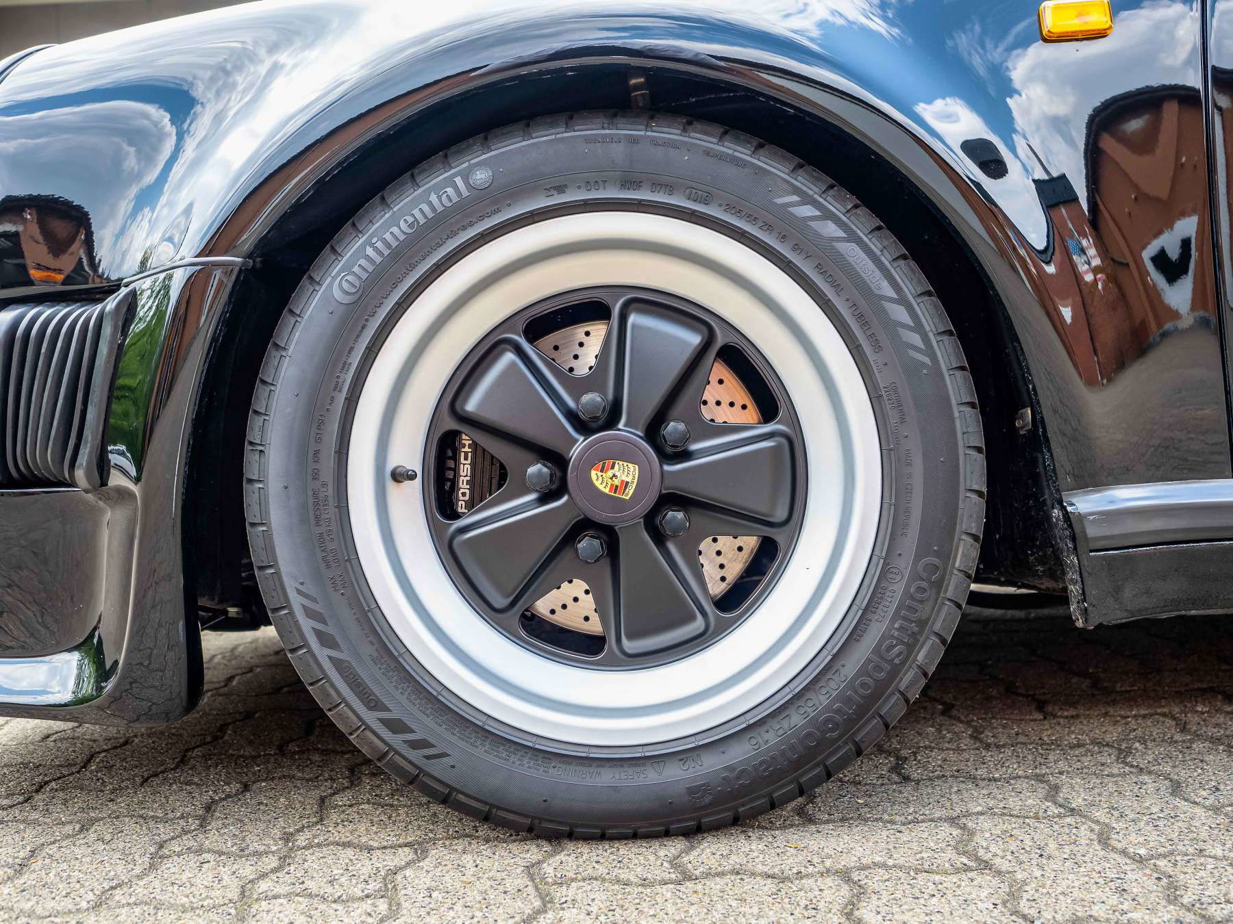 Auf klassischen Porsche Fuchs-Felgen präsentieren sich Pneus der Marke Continental aufgezogen, die – genauso wie die Alufelgen – erst vor kurzem neu kamen. Ebenfalls als Neu bezeichnet der Verkäufer die Verfassung der Bremsanlage, da diese im Zuge der Frame-Off Restaurierung erneuert worden ist. Ungereimtheiten im Bereich des Fahrwerks können augenscheinlich nicht genannt werden.
