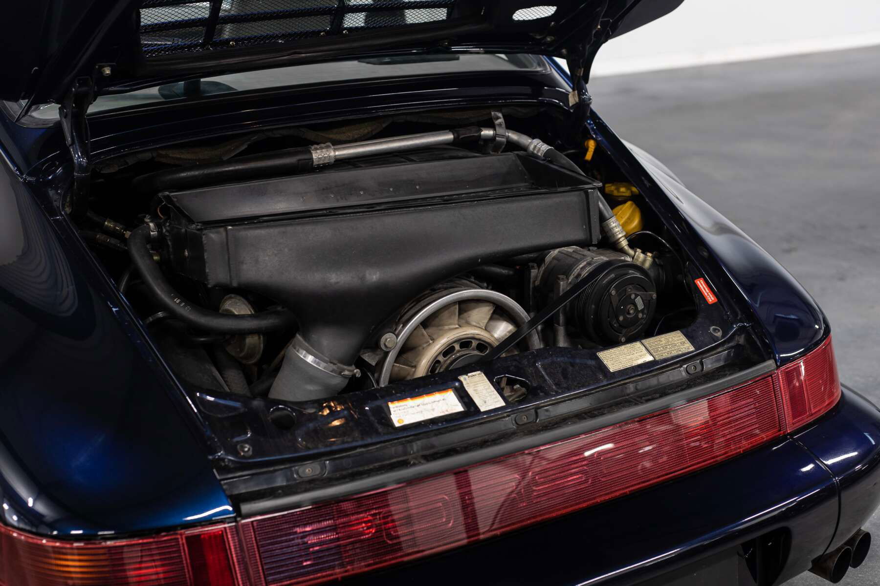 This featured 964 Turbo 3,3L has been bought new in Germany code C00 at the Osnabrück Porsche Dealer in July 1993 so it must be one of the last car produced, the car is matching numbers, the dark blue paint color code 37W has been resprayed not long ago so the paint is in very good condition for are the wheels, the grey leather interior upholstery and the carpet is in good condition too with no blemishes, it has been fully checked at our Porsche Dealer for peace of mind and the car is sold with a file of service receipts including the last service and work receipt from october 2022 totalizing more than 12 K € in total, it is coming with the original service book, 2 keys and remotes, owner manuals in pouch, original working Blaupunkt Symphony radio K7 manual (still in the car), radio identification card with code number and Porsche certificate of authenticity.