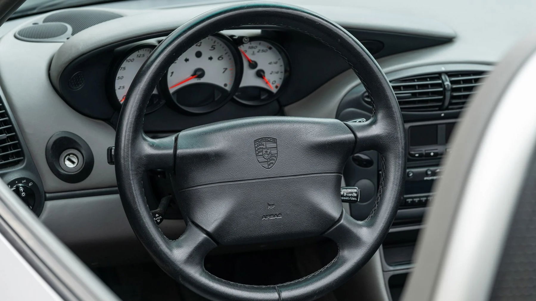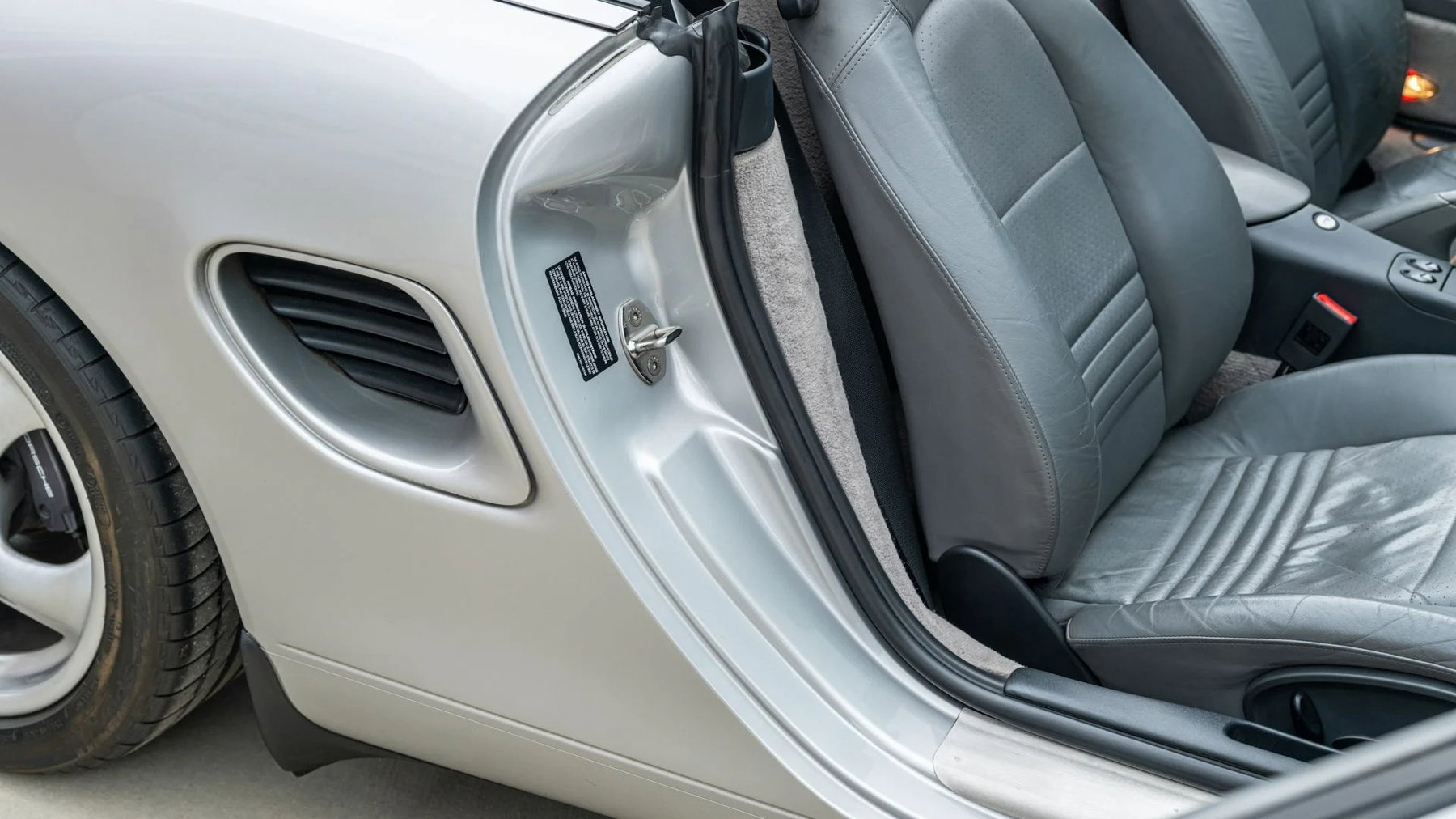 Dieser Typ 986 der ersten Generation wurde in der ersten Welle der frühen „Pre-S”-Boxster-Modelle gebaut und verfügt über die klassische Boxster-Ausstattung in Arctic Silver Metallic mit optionaler Lederausstattung in Graphite Grey und Sitzheizung. Laut dem Aufkleber mit den technischen Daten unter der Motorhaube verließ dieser spezielle Boxster das Porsche-Werk mit sechs „X-Code”-Optionen, darunter eine Boxster-Auspuffblende mit zentralem Auslass (XLA), eine arktissilber lackierte Überrollbügel (XMY), Edelstahl-Einstiegsleisten (X70), Instrumentenzifferblätter in Aluminiumoptik (X71), einen Schaltknauf aus Aluminium/Leder (X97) und eine Handbremse aus Aluminium/Leder (X98). Darüber hinaus war er ab Werk mit zahlreichen Katalogoptionen ausgestattet, darunter 17-Zoll-Räder, ein automatisches Sperrdifferenzial, ein Traktionskontrollsystem und ein im Kofferraum montierter CD-Wechsler.