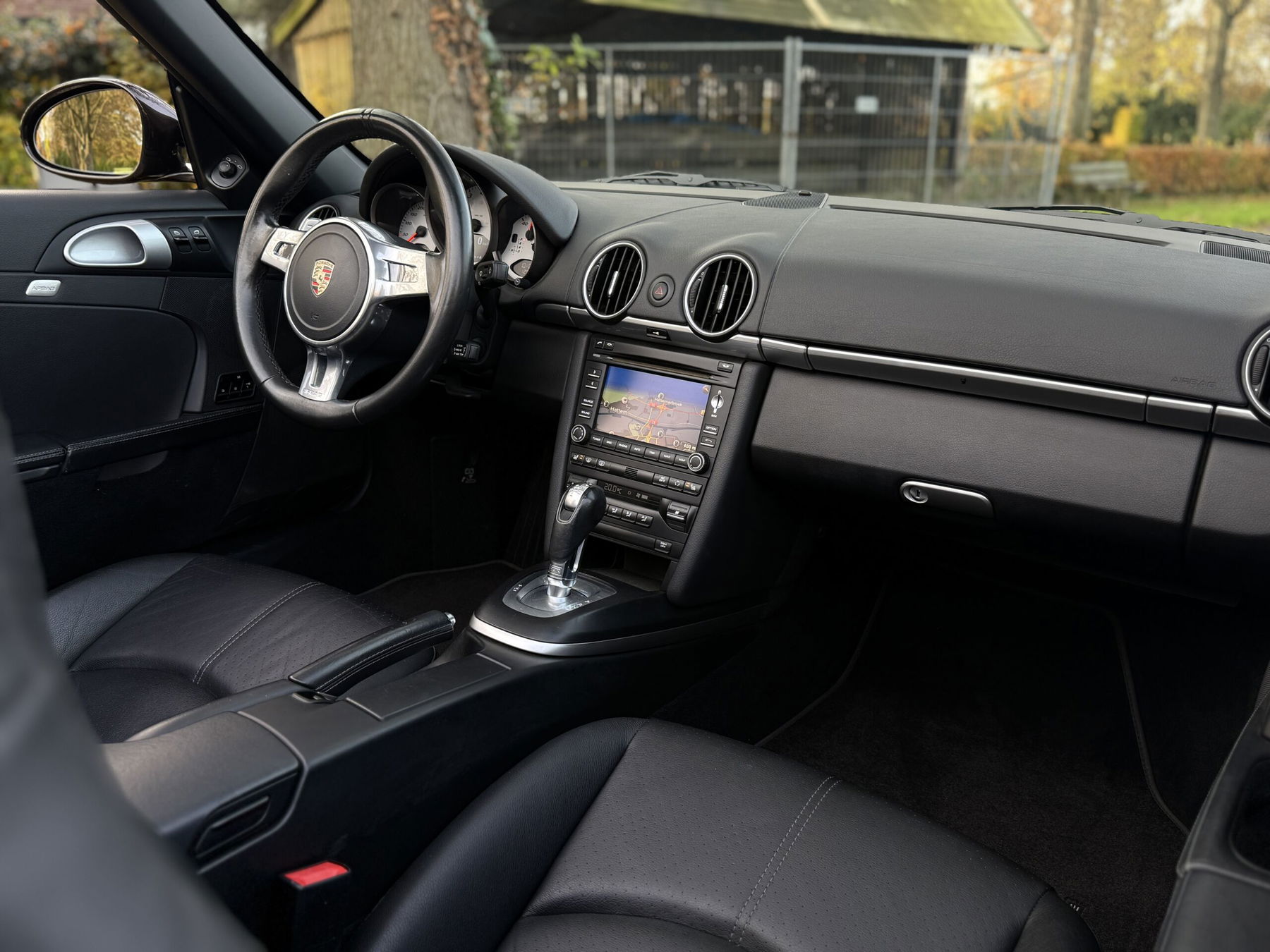 Die Facelift-Version der 987-Generation ist an ihren Bi-Xenon-Scheinwerfern mit dynamischem Kurvenlicht (PDLS), LED-Tagfahrleuchten, neu gestalteten Stoßfängern mit größeren Lufteinlässen und zusätzlichen Konfigurationsoptionen zu erkennen. Eine weitere Neuerung ist das PCM 3.0-Touchscreen-System, das eine wesentlich intuitivere Navigation mit integrierten Europakarten, Bluetooth-Telefonverbindung und einer Audio-Schnittstelle mit USB-, iPod- und Aux-Eingängen bietet. Die hier gewählte Exclusive-Ausstattung umfasst Sitze mit weicher Naturlederpolsterung, die mit dezenten Nähten und Perforationen versehen sind. Das dicke SportDesign-Lenkrad liegt gut in der Hand und lädt dazu ein, die Aluminium-Schaltwippen zu benutzen. Die Armaturenbretteinlage ist mattschwarz, die Zifferblätter des Kombiinstruments sind silberfarben und einige Bedienelemente sind mit eloxiertem Aluminium ummantelt. Die Velours-Teppiche sind mit grauen Keder und Porsche-Gravur versehen.