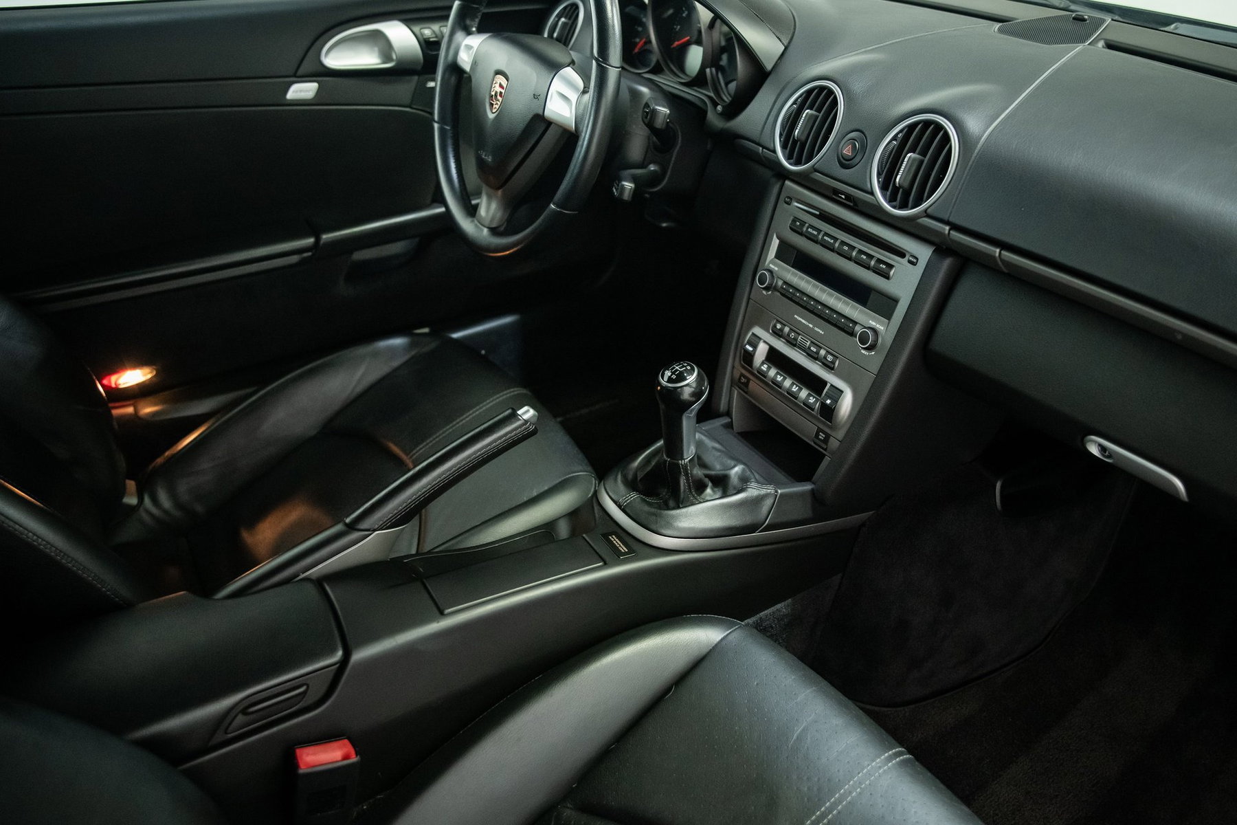2007 Porsche Cayman mit 55.000 Meilen seit Neuzulassung. Das angebotene Fahrzeug ist in Schwarz lackiert und verfügt über eine passende schwarze Lederausstattung. Es ist insbesondere mit dem BOSE High-End-Soundsystem und einem begehrten Fünfgang-Schaltgetriebe ausgestattet. Es handelt sich um ein sehr frühes Serienmodell, wie der im Fertigungsblatt angegebene „Launch Code“ 762 zeigt.