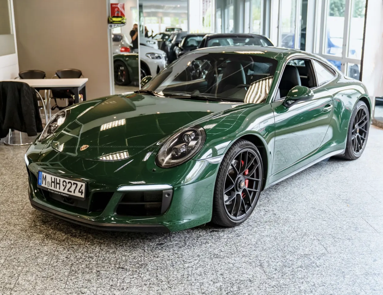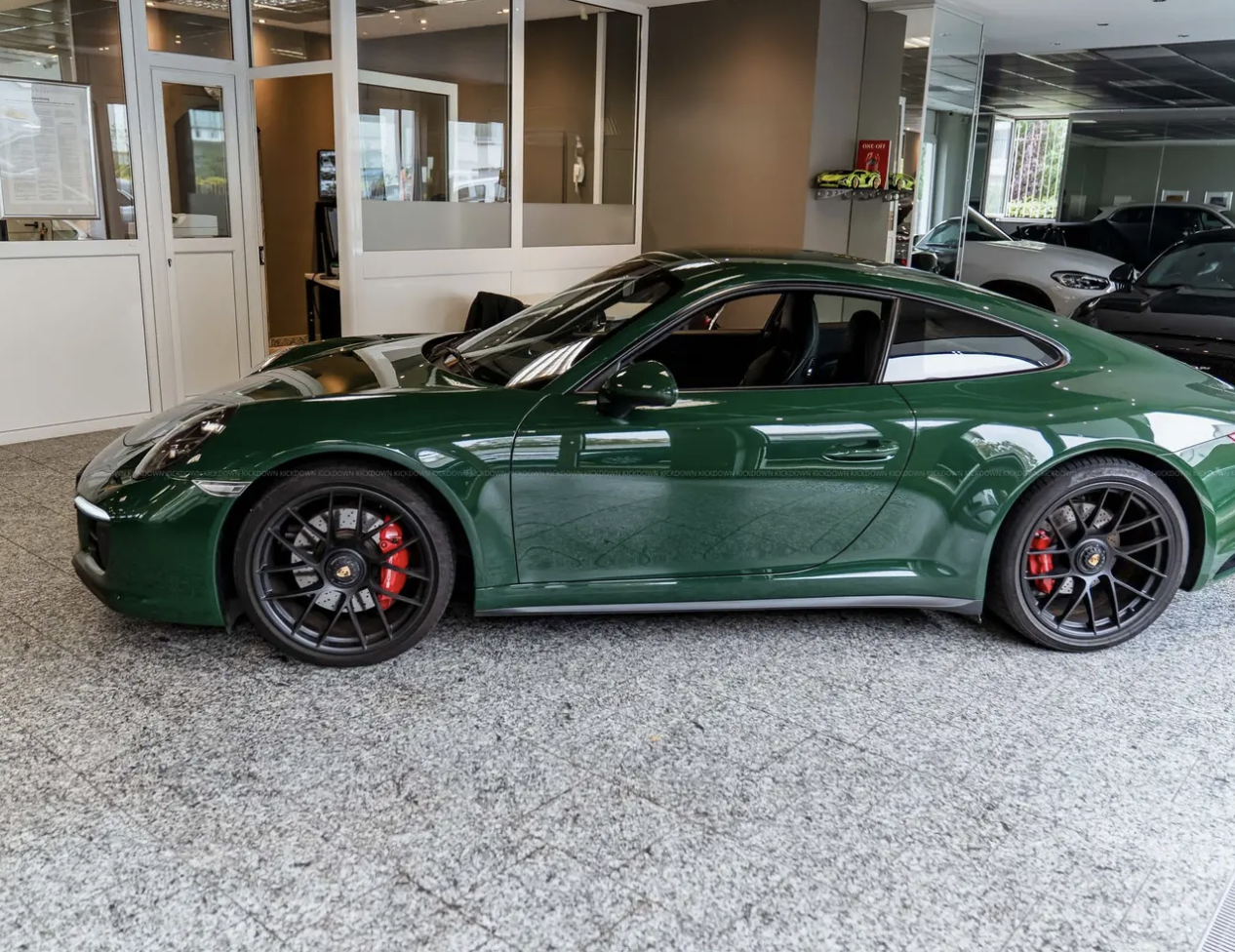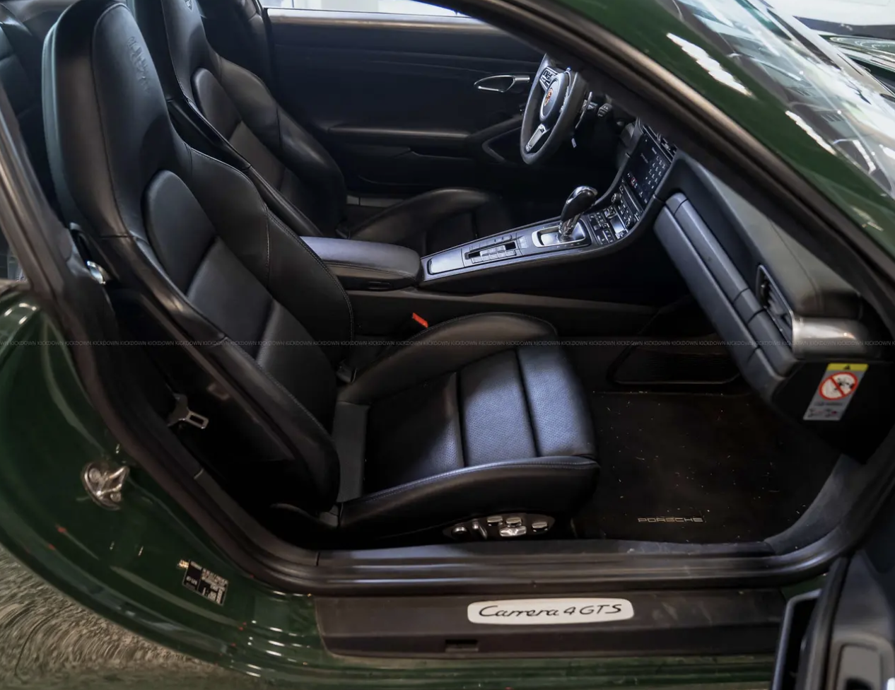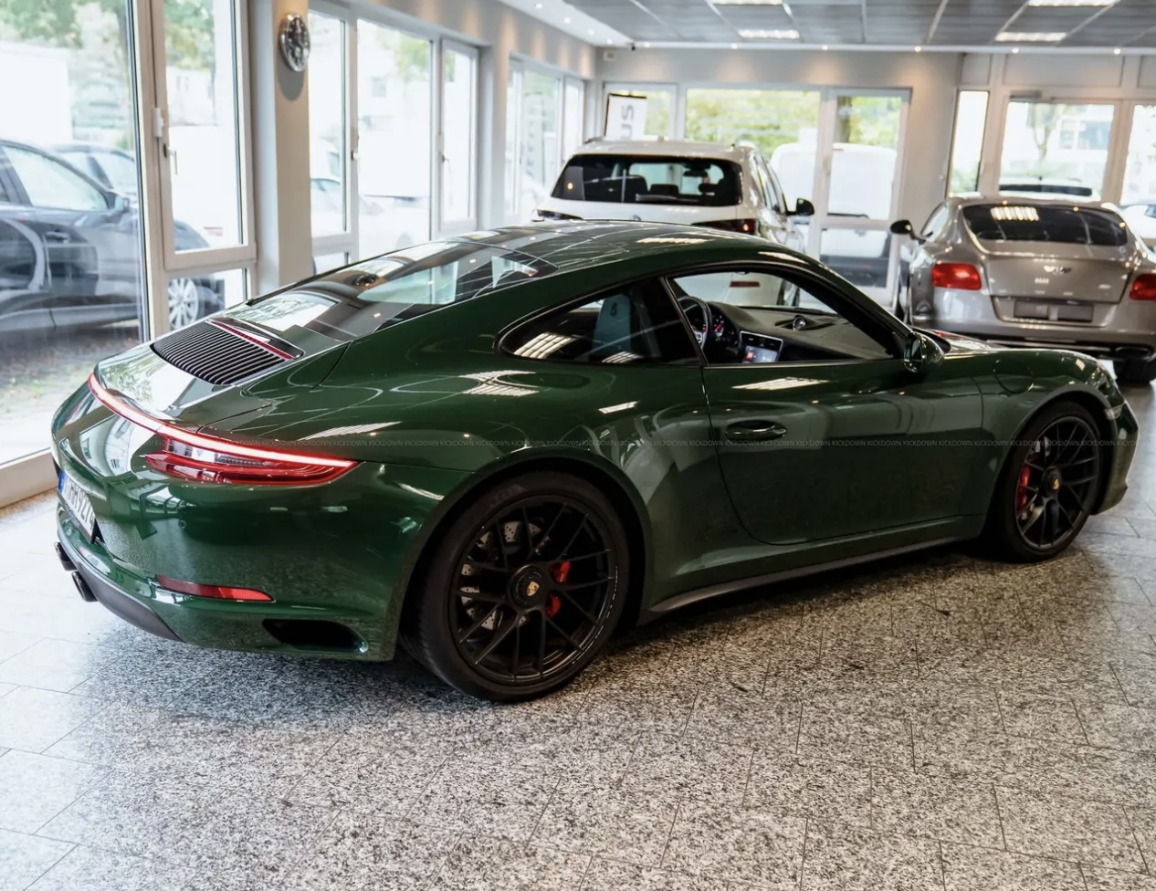 Zum Verkauf steht ein Porsche 911 991.2 Carrera 4 GTS aus dem Jahr 2017 in der Sonderfarbe British Racing Green und mit einer Innenausstattung aus schwarzem Leder.
