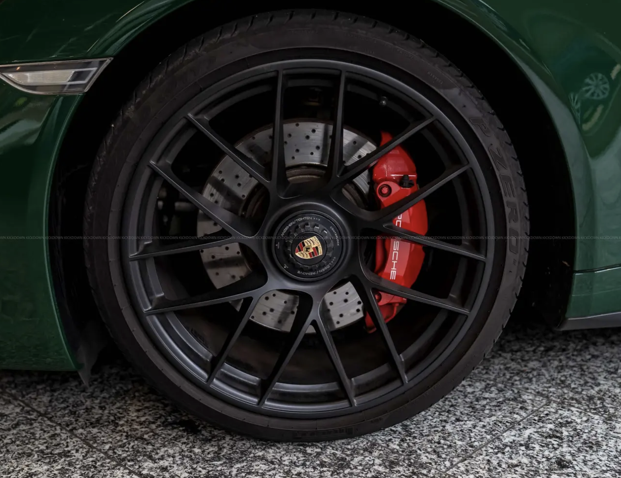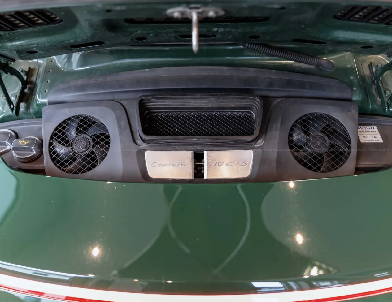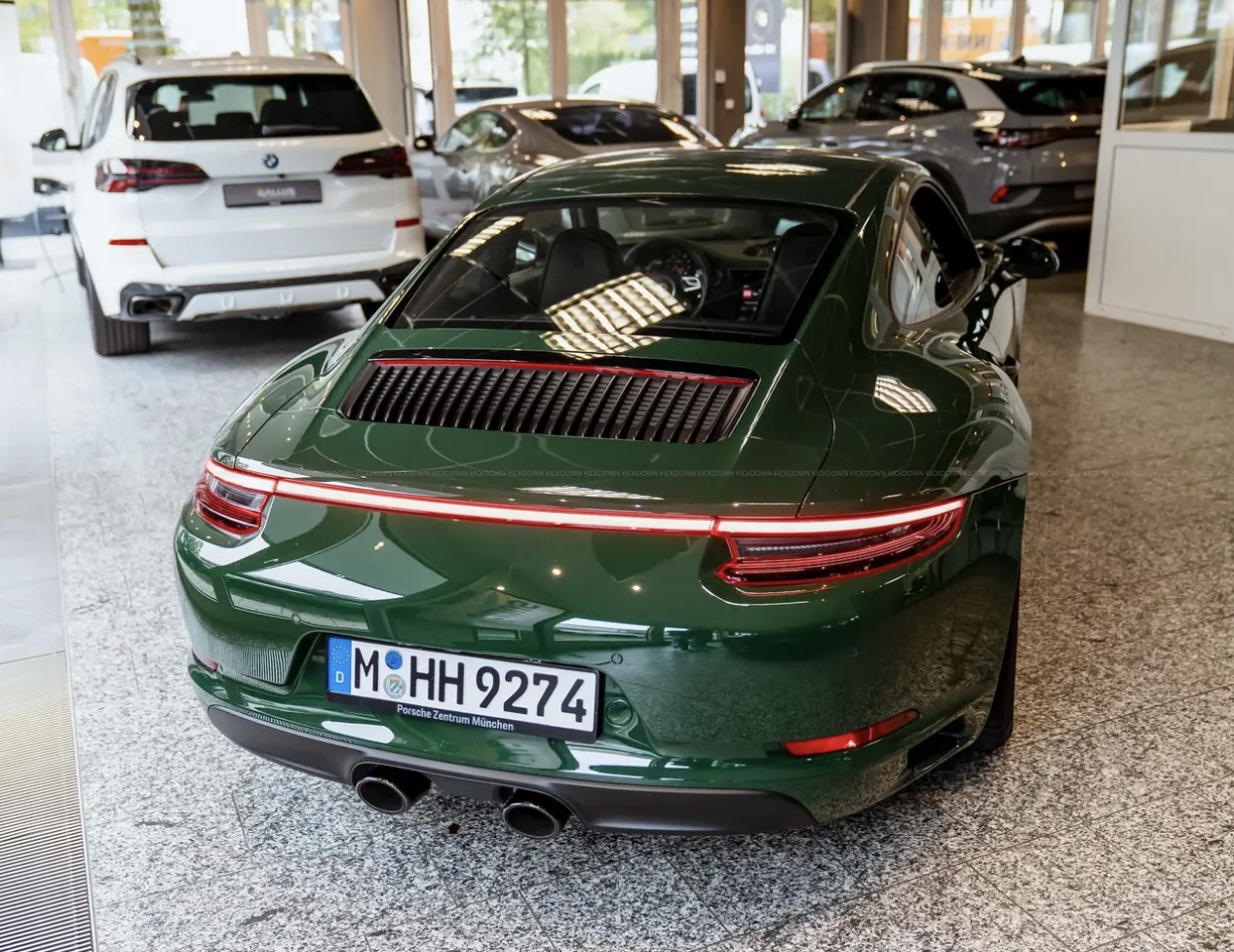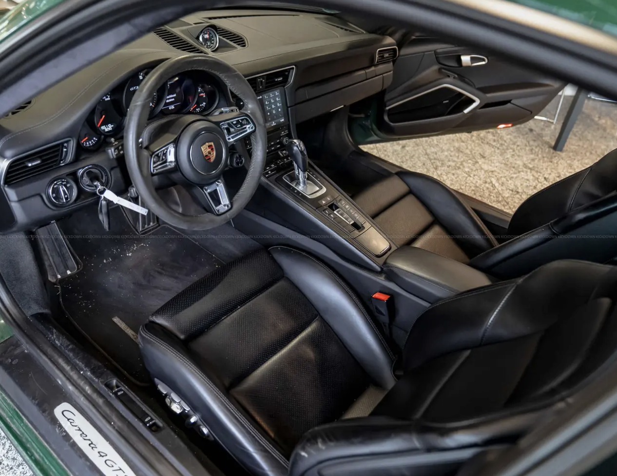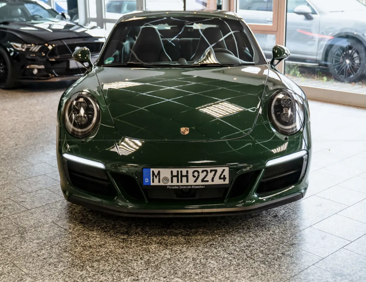 Zum Verkauf steht ein Porsche 911 991.2 Carrera 4 GTS aus dem Jahr 2017 in der Sonderfarbe British Racing Green und mit einer Innenausstattung aus schwarzem Leder.