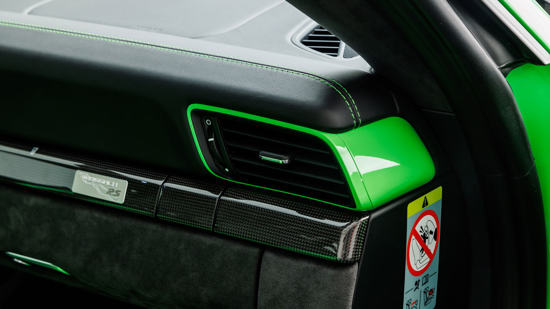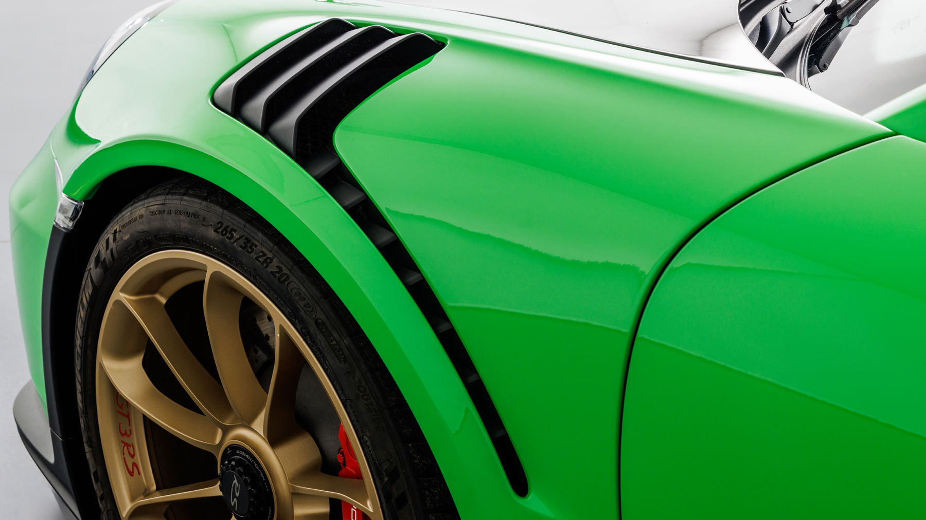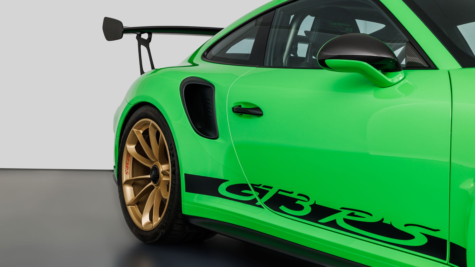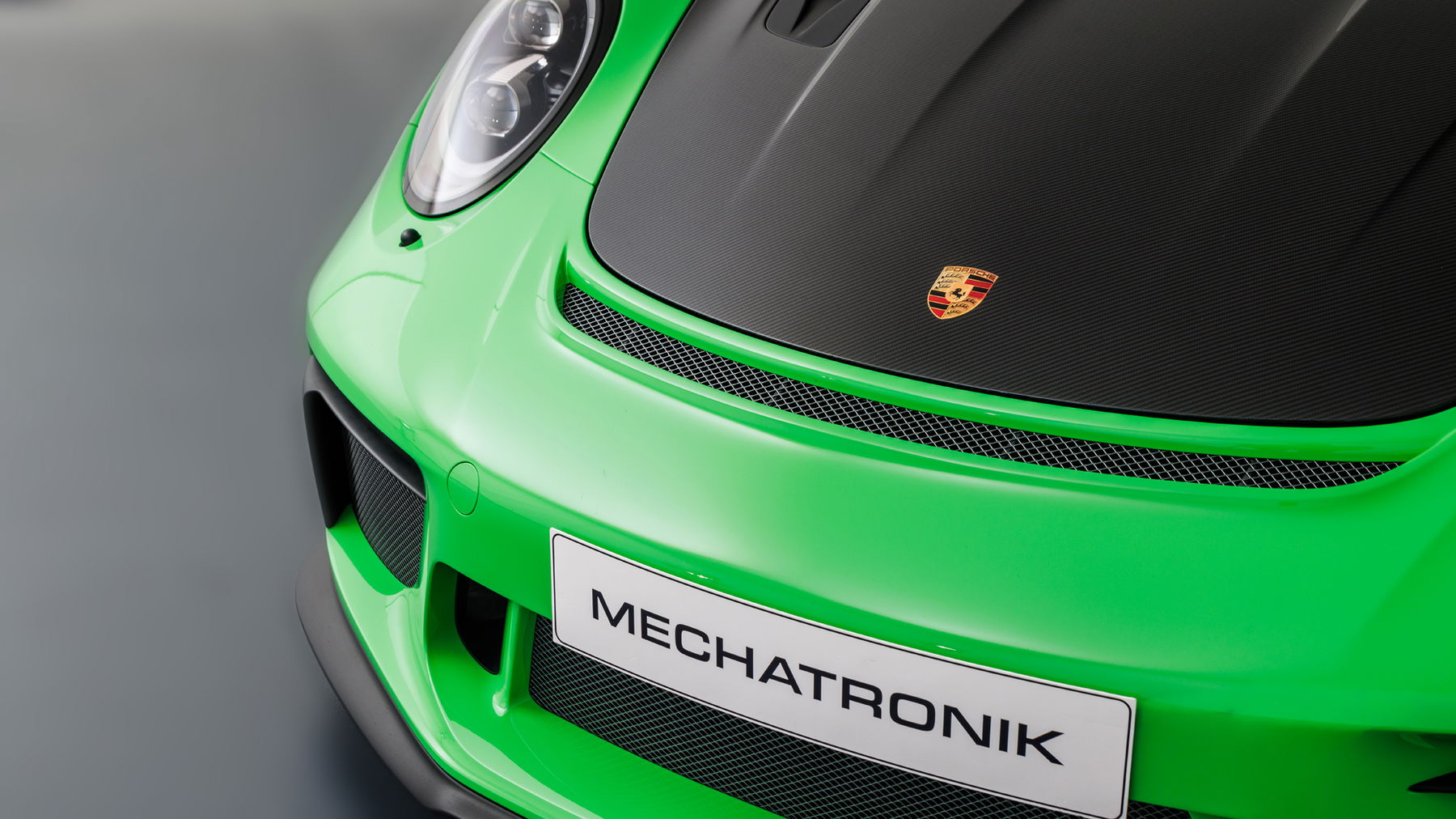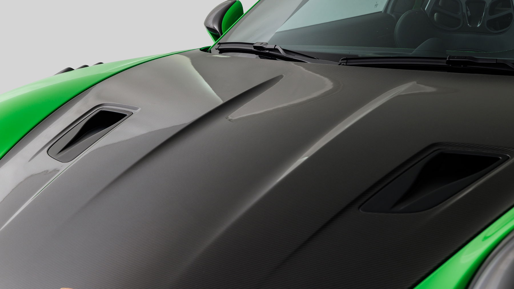 Mit dem 4.0 Liter Sechszylinder-Saugmotor ausgestattet, welcher eine Leistung von 520 PS bietet, ist dieser Hochleistungs-Elfer ein wahres Kraftpaket. Die zweite Generation des 991 RS umfasste eine ganze Reihe mechanischer und ästhetischer Upgrades, einschließlich des Weissach-Pakets, das das Gewicht um 18 kg reduzierte, durch einen Titan-Überrollkäfig, ein CFRP-Dach, eine CFRP-Motorhaube und einen Überrollbügel. Dieses Weissach-Paket der zweiten RS Generation sieht in seiner Farbe Lizard Green mit Carbon-Motorhaube, Dach und Aerolüftungen unglaublich aus und vermittelt auf den ersten Blick Rennwagen-für-die-Straße Dynamik. NACA-Lufteinlässe in der Motorhaube werden zum ersten Mal bei einem GT Porsche verwendet; sie optimieren die Luftbeschleunigung und sehen umso zweckmäßiger aus. Entwickelt von der renommierten Porsche Motorsportabteilung auf Basis des 911 GT3 und seines Rennsportbruders GT3 Cup, liegt der Fokus des GT3 RS klar auf bester Rundstrecken-Dynamik. Neben dem leistungsgesteigerten Vierliter-Boxermotor trägt auch die neu entwickelte Fahrwerksabstimmung wesentlich zur überragenden Performance bei. Die angepasste Hinterachse verbessert nicht nur die Agilität in Kurven, sondern sorgt auch für höhere Stabilität bei hohen Geschwindigkeiten. Die aerodynamische Auslegung mit einem ausgeprägten Abtriebs-Charakter verleiht dem Fahrzeug nicht nur ein imposantes Erscheinungsbild, sondern trägt auch maßgeblich zur Fahrstabilität bei hohen Geschwindigkeiten bei. Der Einsatz von leichtem Carbon für den großen Heckflügel, der Motorhaube, des Dach und die verbreiterten vorderen Kotflügel mit oberen Entlüftungsschlitzen unterstreicht die Konzentration auf Gewichtsreduktion und Performance.