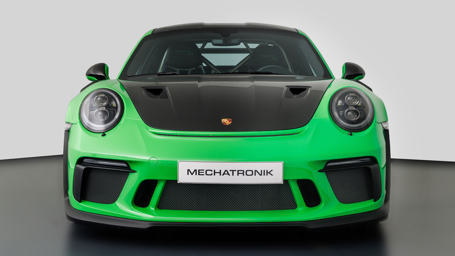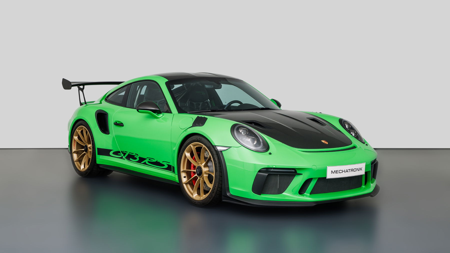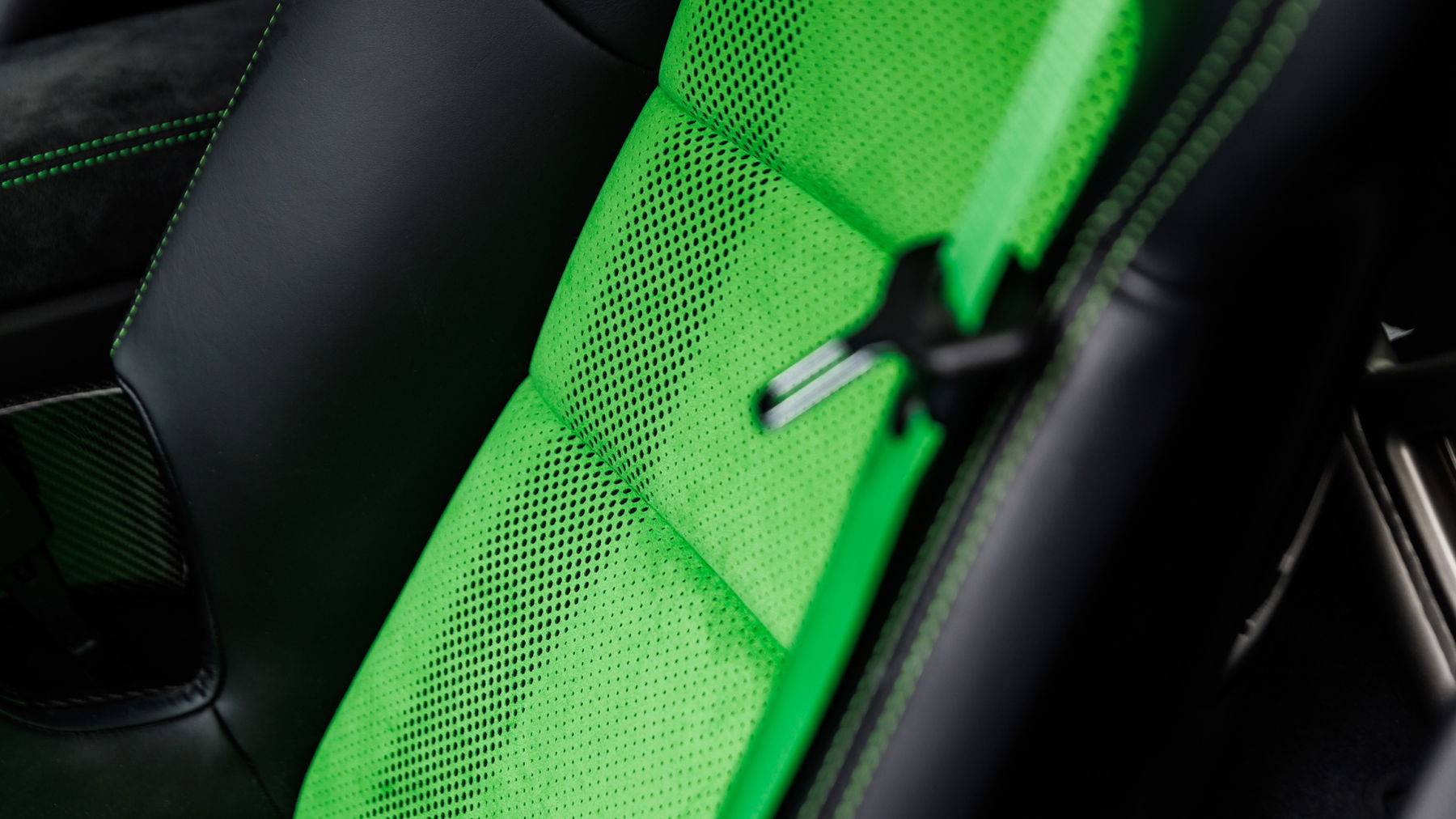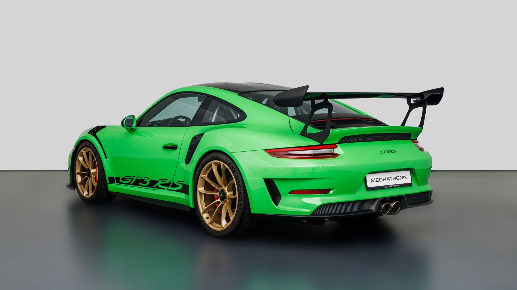 Mit dem 4.0 Liter Sechszylinder-Saugmotor ausgestattet, welcher eine Leistung von 520 PS bietet, ist dieser Hochleistungs-Elfer ein wahres Kraftpaket. Die zweite Generation des 991 RS umfasste eine ganze Reihe mechanischer und ästhetischer Upgrades, einschließlich des Weissach-Pakets, das das Gewicht um 18 kg reduzierte, durch einen Titan-Überrollkäfig, ein CFRP-Dach, eine CFRP-Motorhaube und einen Überrollbügel. Dieses Weissach-Paket der zweiten RS Generation sieht in seiner Farbe Lizard Green mit Carbon-Motorhaube, Dach und Aerolüftungen unglaublich aus und vermittelt auf den ersten Blick Rennwagen-für-die-Straße Dynamik. NACA-Lufteinlässe in der Motorhaube werden zum ersten Mal bei einem GT Porsche verwendet; sie optimieren die Luftbeschleunigung und sehen umso zweckmäßiger aus. Entwickelt von der renommierten Porsche Motorsportabteilung auf Basis des 911 GT3 und seines Rennsportbruders GT3 Cup, liegt der Fokus des GT3 RS klar auf bester Rundstrecken-Dynamik. Neben dem leistungsgesteigerten Vierliter-Boxermotor trägt auch die neu entwickelte Fahrwerksabstimmung wesentlich zur überragenden Performance bei. Die angepasste Hinterachse verbessert nicht nur die Agilität in Kurven, sondern sorgt auch für höhere Stabilität bei hohen Geschwindigkeiten. Die aerodynamische Auslegung mit einem ausgeprägten Abtriebs-Charakter verleiht dem Fahrzeug nicht nur ein imposantes Erscheinungsbild, sondern trägt auch maßgeblich zur Fahrstabilität bei hohen Geschwindigkeiten bei. Der Einsatz von leichtem Carbon für den großen Heckflügel, der Motorhaube, des Dach und die verbreiterten vorderen Kotflügel mit oberen Entlüftungsschlitzen unterstreicht die Konzentration auf Gewichtsreduktion und Performance.