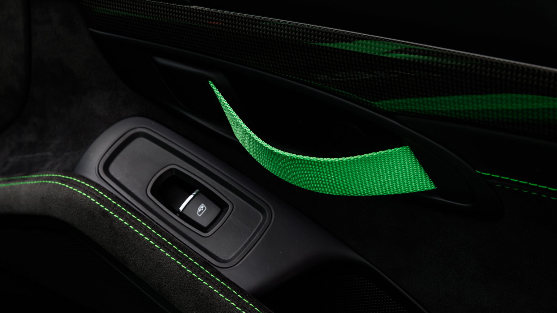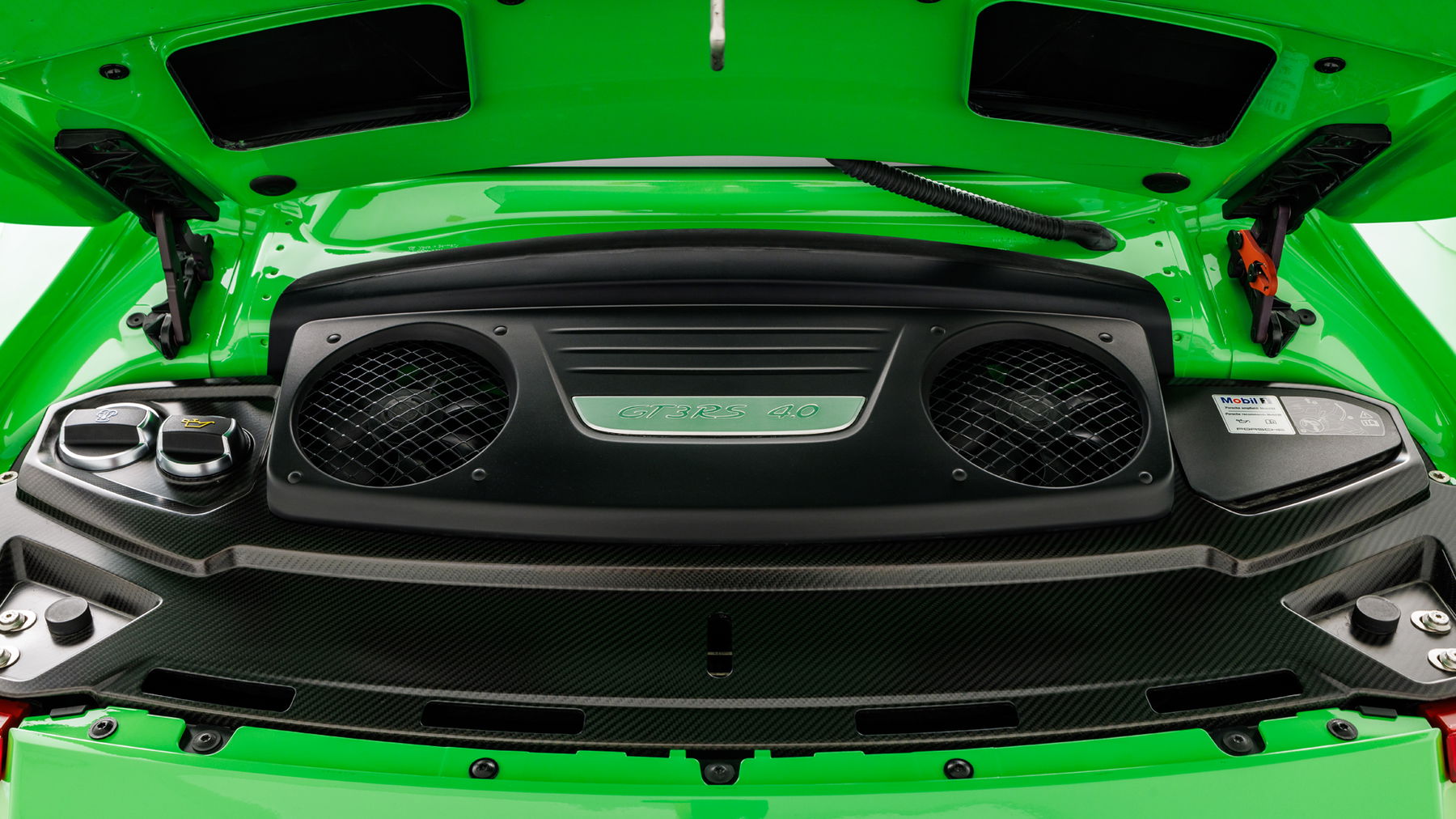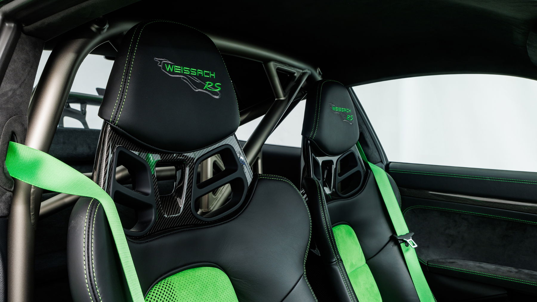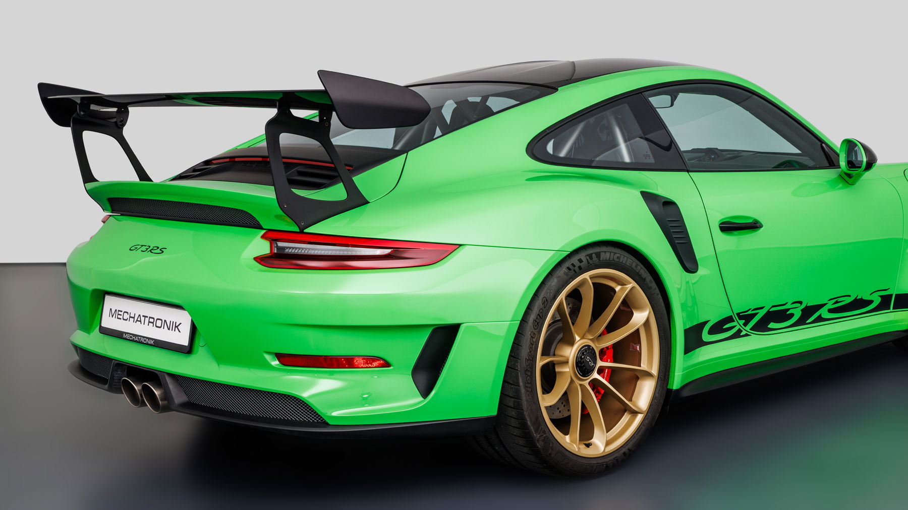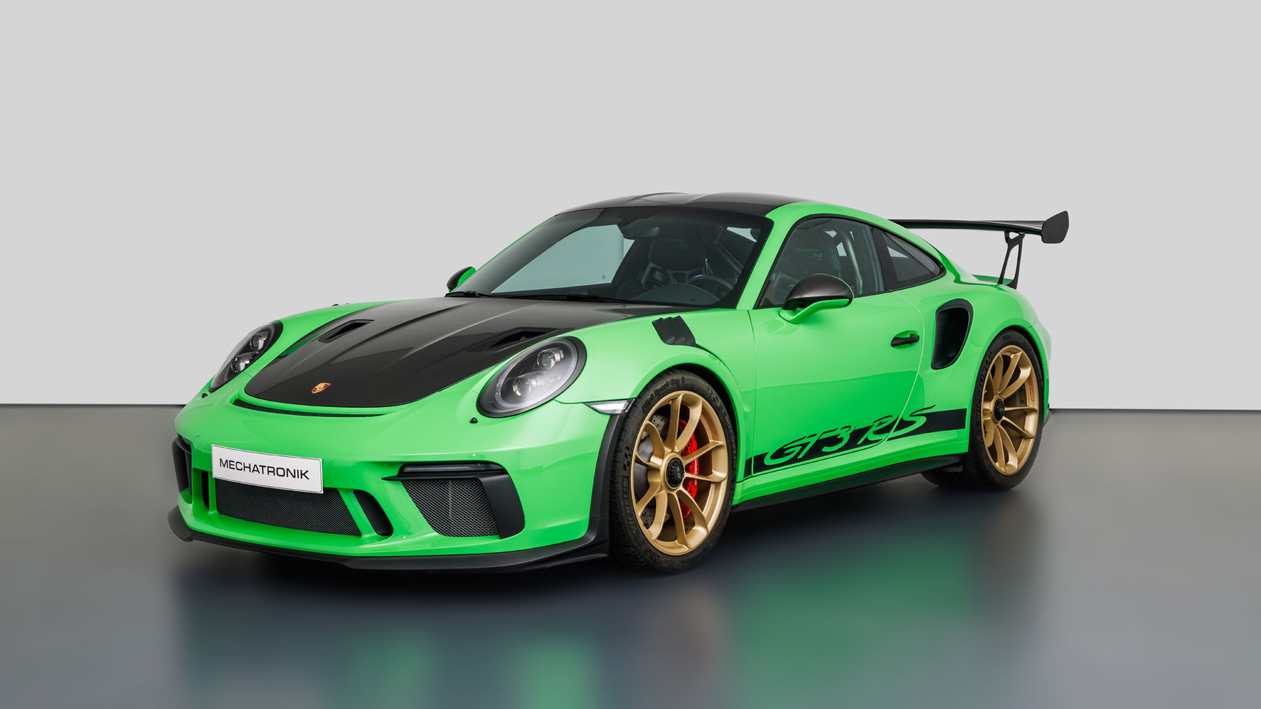 Mit dem 4.0 Liter Sechszylinder-Saugmotor ausgestattet, welcher eine Leistung von 520 PS bietet, ist dieser Hochleistungs-Elfer ein wahres Kraftpaket. Die zweite Generation des 991 RS umfasste eine ganze Reihe mechanischer und ästhetischer Upgrades, einschließlich des Weissach-Pakets, das das Gewicht um 18 kg reduzierte, durch einen Titan-Überrollkäfig, ein CFRP-Dach, eine CFRP-Motorhaube und einen Überrollbügel. Dieses Weissach-Paket der zweiten RS Generation sieht in seiner Farbe Lizard Green mit Carbon-Motorhaube, Dach und Aerolüftungen unglaublich aus und vermittelt auf den ersten Blick Rennwagen-für-die-Straße Dynamik. NACA-Lufteinlässe in der Motorhaube werden zum ersten Mal bei einem GT Porsche verwendet; sie optimieren die Luftbeschleunigung und sehen umso zweckmäßiger aus. Entwickelt von der renommierten Porsche Motorsportabteilung auf Basis des 911 GT3 und seines Rennsportbruders GT3 Cup, liegt der Fokus des GT3 RS klar auf bester Rundstrecken-Dynamik. Neben dem leistungsgesteigerten Vierliter-Boxermotor trägt auch die neu entwickelte Fahrwerksabstimmung wesentlich zur überragenden Performance bei. Die angepasste Hinterachse verbessert nicht nur die Agilität in Kurven, sondern sorgt auch für höhere Stabilität bei hohen Geschwindigkeiten. Die aerodynamische Auslegung mit einem ausgeprägten Abtriebs-Charakter verleiht dem Fahrzeug nicht nur ein imposantes Erscheinungsbild, sondern trägt auch maßgeblich zur Fahrstabilität bei hohen Geschwindigkeiten bei. Der Einsatz von leichtem Carbon für den großen Heckflügel, der Motorhaube, des Dach und die verbreiterten vorderen Kotflügel mit oberen Entlüftungsschlitzen unterstreicht die Konzentration auf Gewichtsreduktion und Performance.