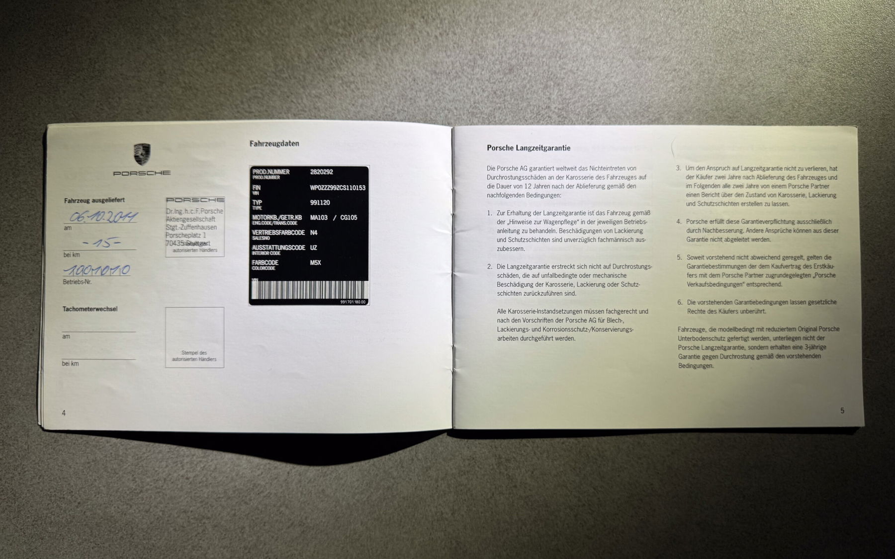 Die Ausstattung spiegelt den Status eines Werkswagen wider. Eine Gelegenheit für Sammler. Dieses Fahrzeug besticht durch seine tolle und seltene Farbkombination. Zusätzlich könnte dieser Porsche eine Gelegenheit für Sammler sein, denn dieses Fahrzeug wurde zur Markteinführung des Modell 991.1 zu Marketing-u. Präsentationszwecke eingesetzt, weshalb er zwei Jahre lang auf Porsche selbst zugelassen war. Das konnte mir Porsche schriftlich bestätigen. In der Zulassungsbescheinigung steht als Typschlüsselnummer 00000000.