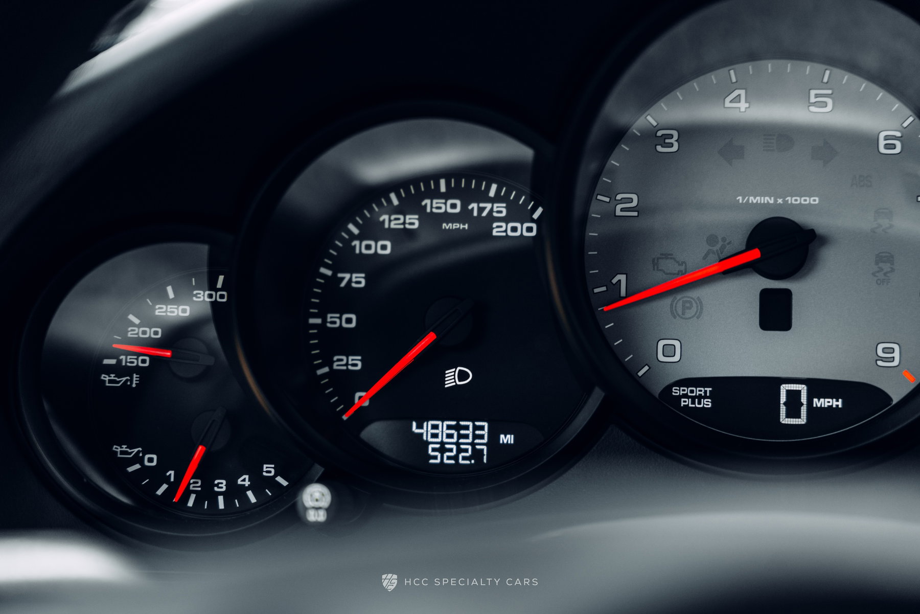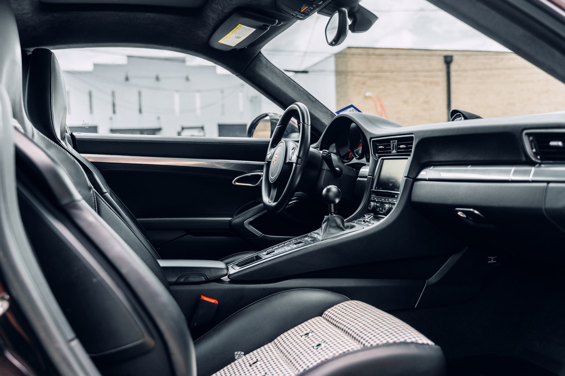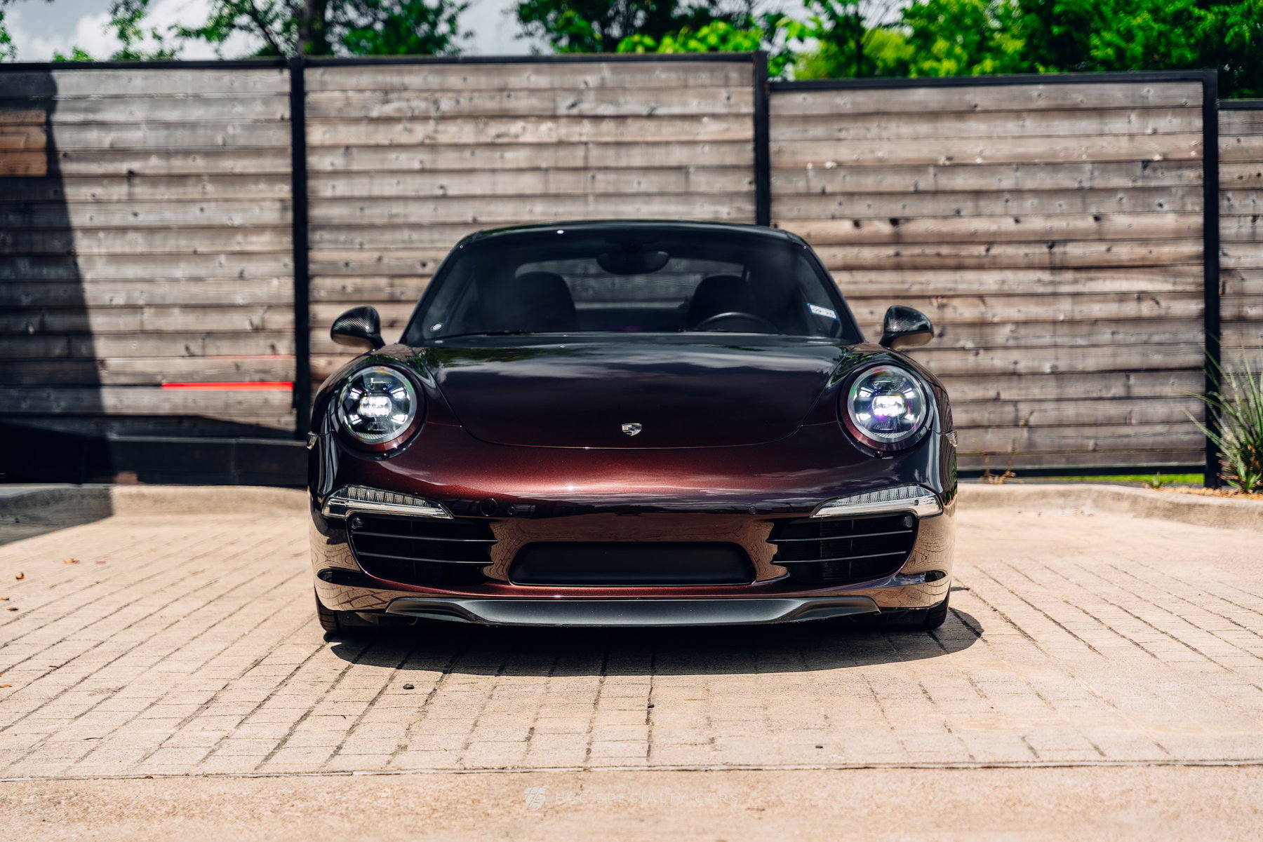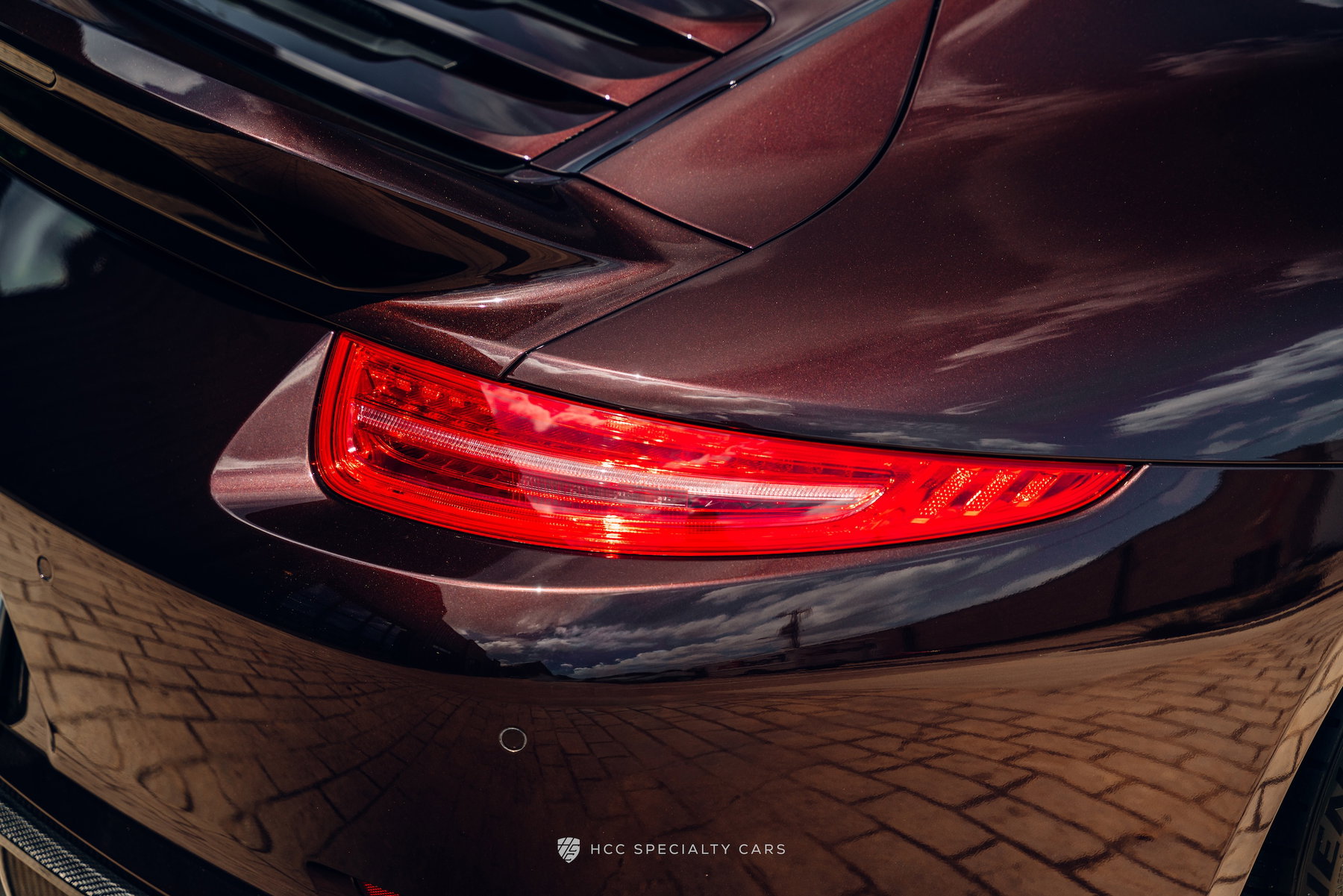 Ein Porsche 911 Carrera S aus dem Jahr 2013 in Mahagoni Metallic mit schwarzer Lederausstattung, einer Laufleistung von 48.000 Meilen und einem 3,8-Liter-Saugmotor mit Sechszylinder-Boxermotor, kombiniert mit einem Handschalter. Gut ausgestattet mit Sport Chrono, PDCC, Sportauspuff, Premium-Paket Plus, 18-fach verstellbaren adaptiven Sportsitzen und Burmester-Audiosystem sowie einem Schiebedach und ParkAssist. Zu den Upgrades gehören ein Club-Coupé-Ducktail, ein Heckdiffusor aus Carbon, TechArt-Endrohre, ein Numeric-Schalthebel und Scheinwerfer im 992-Stil, wobei an der Front PPF angebracht ist. Wird mit einem einwandfreien texanischen Fahrzeugbrief angeboten; geringfügige Schäden sind laut CARFAX vermerkt.