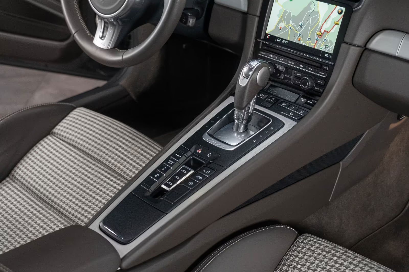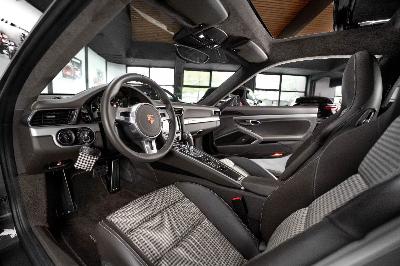 Innen: Leder-/Stoff Kombination mit klassischen „Pepita“ Akzenten in achatgrau Stoff/Leder-Kombination mit „911 50“ Einprägung an den Kopflehnen und heller Kontrastnaht; Lederbezogenes Cockpit-Armaturentafel und Türbrüstungen; Dachhimmel in Alcantara