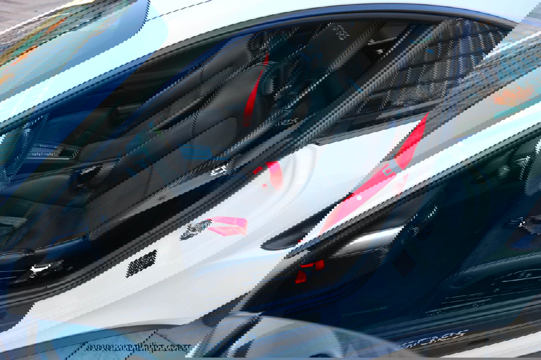 Dieser Porsche 991 GT3 RS wurde am 3. Oktober 2015 vom Porsche Zentrum Varese DELCAR ausgeliefert, in Weiß mit schwarzer Lederausstattung und roten Sicherheitsgurten, Bi-Xenon-Scheinwerfern mit PDLS, klaren Linsen an den Rückleuchten, Sound Plus-Paket, PCM mit Navigation, Frontlift-System und einem 90-Liter-Kraftstofftank.