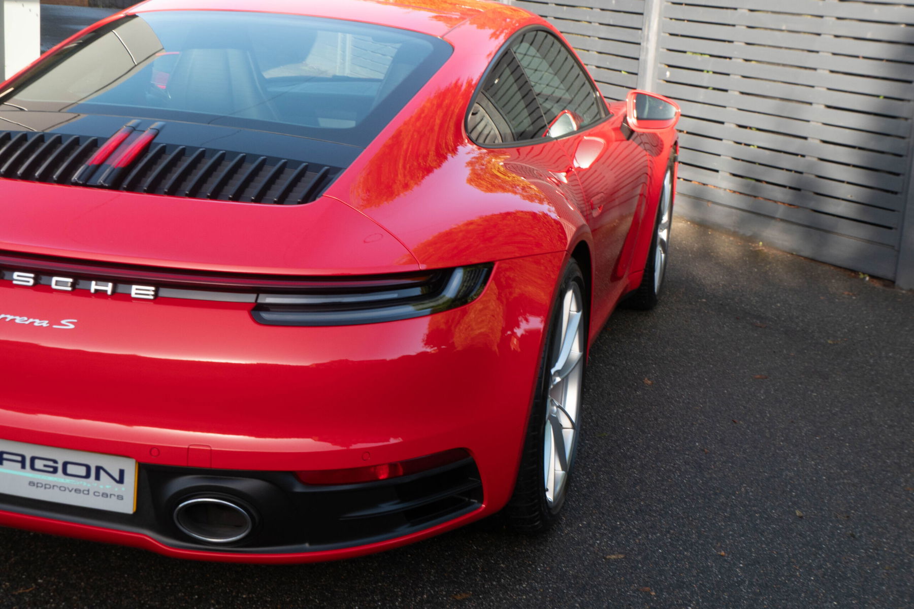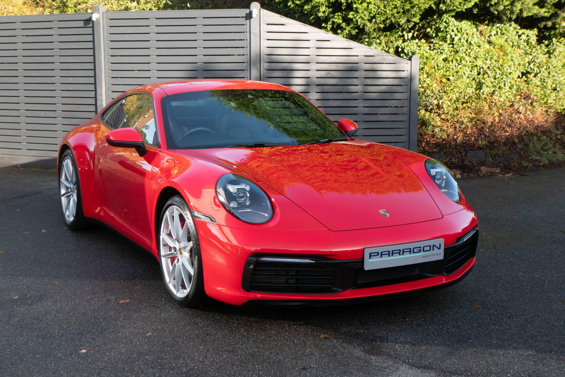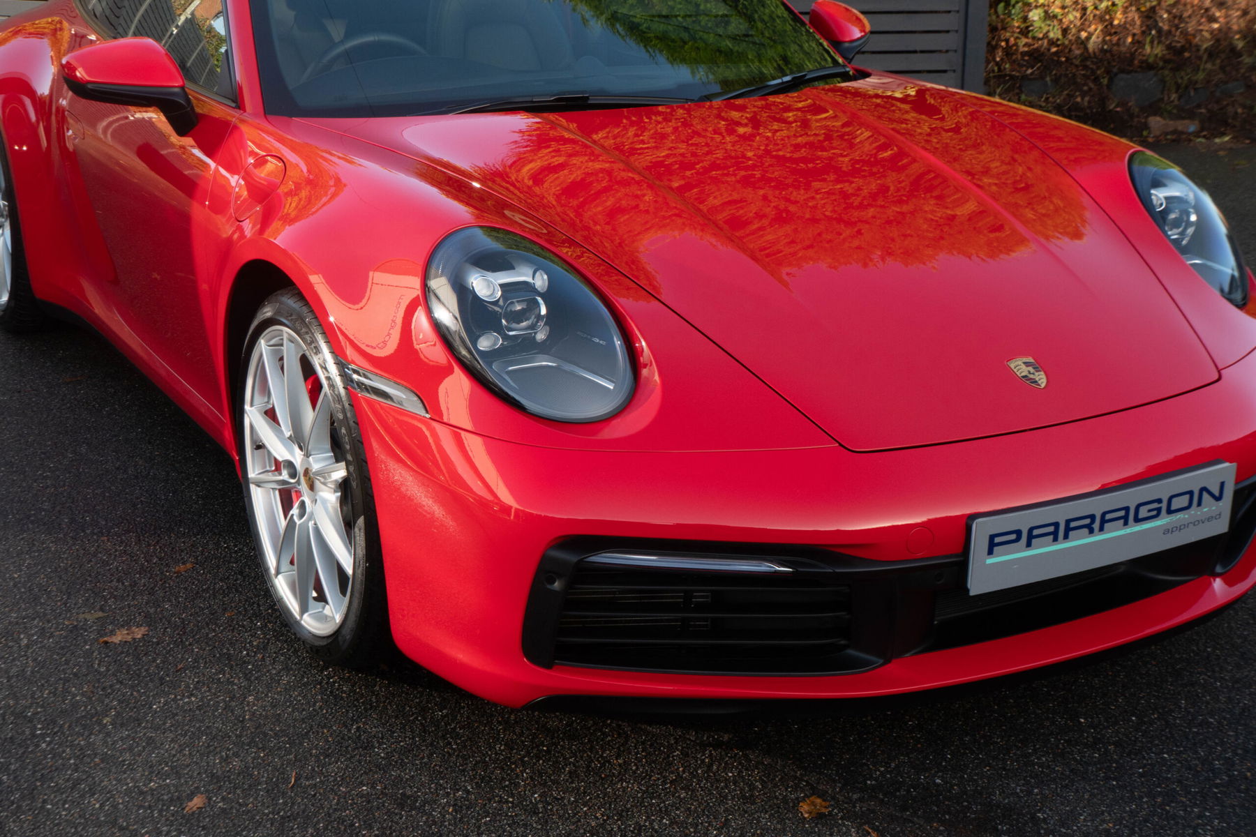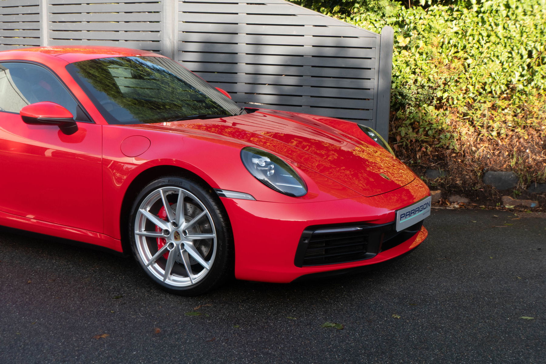 Porsche 911 Carrera 2 S Coupe (992) 8-Gang PDK, Indischrot, schwarze Ledersitze, Klimaanlage, Multifunktionslenkrad, sprachgesteuerter Computer, Porsche Active Suspension Management & Porsche Stability Management, Touchscreen-Satellitennavigation mit Apple Car Play, Bluetooth-Telefon & DAB-Radio, Bi-Xenon-Scheinwerfer, LED-Tagfahrlicht, automatisches Fahrlicht, Stopp/Start-Funktion.