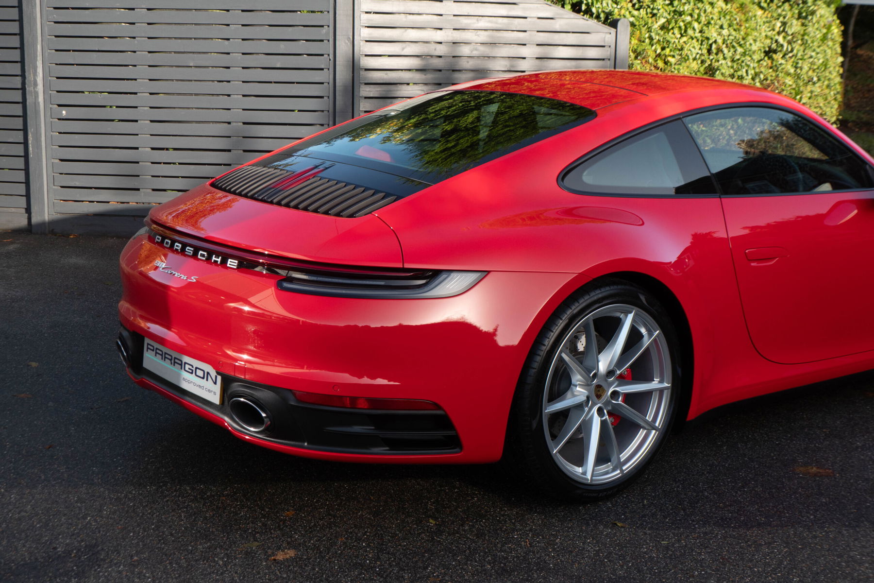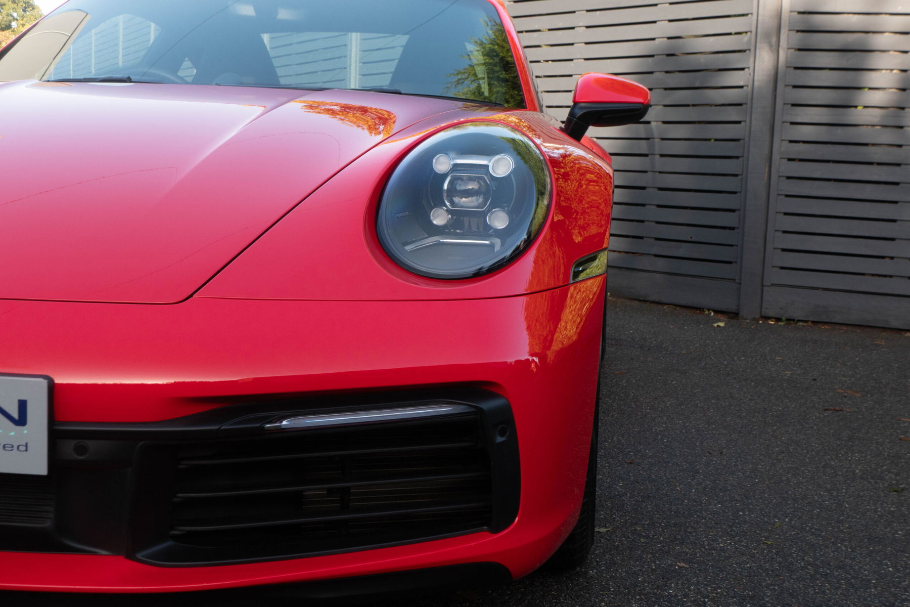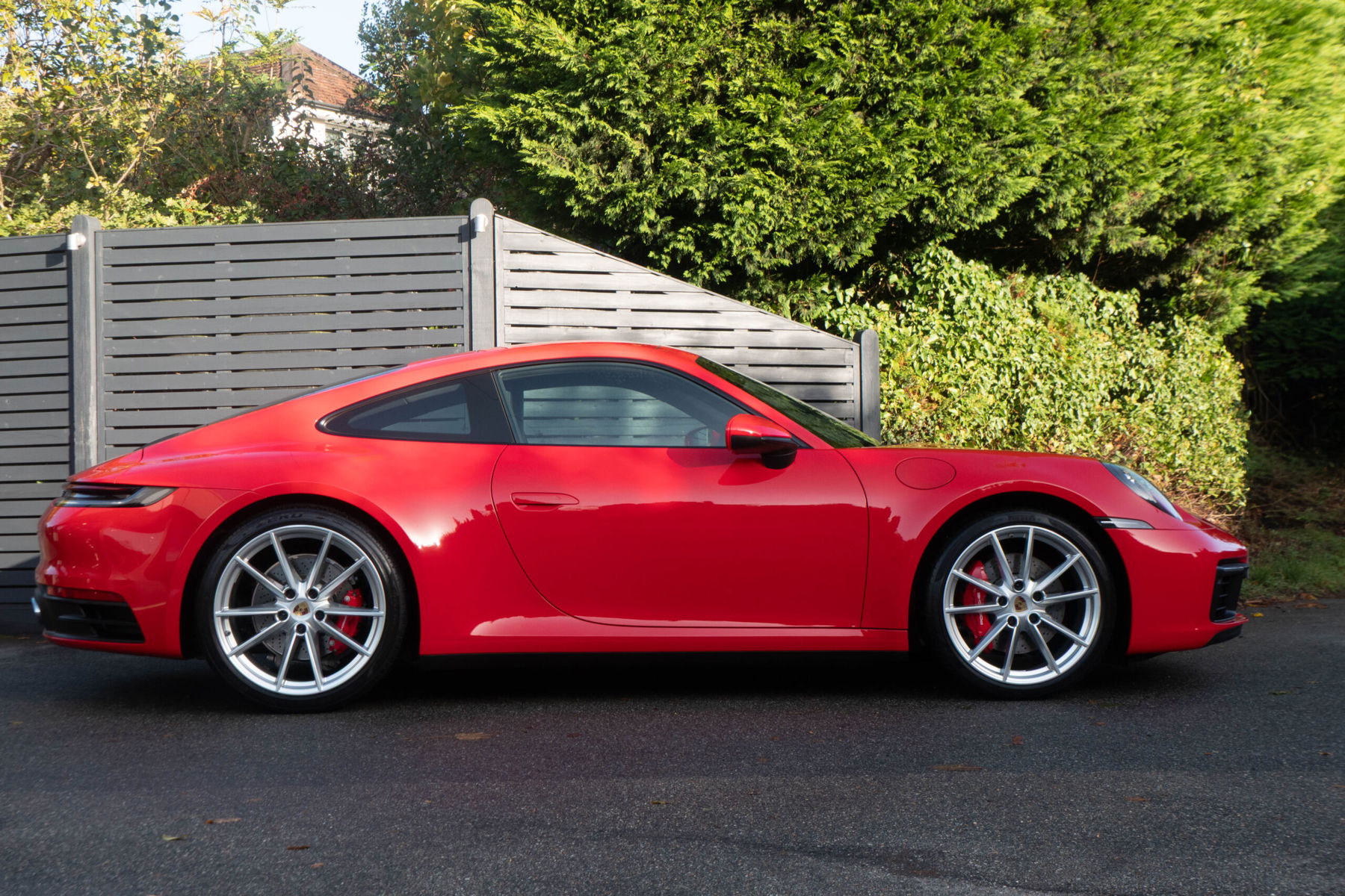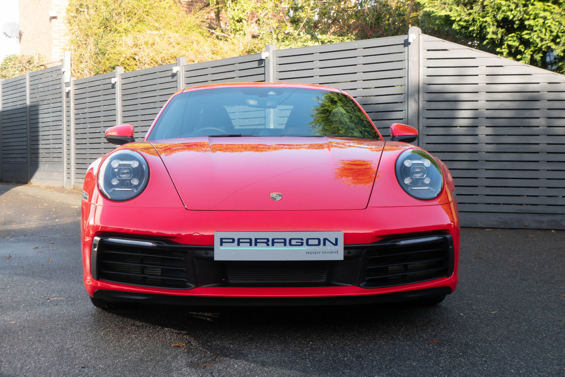 Porsche 911 Carrera 2 S Coupe (992) 8-Gang PDK, Indischrot, schwarze Ledersitze, Klimaanlage, Multifunktionslenkrad, sprachgesteuerter Computer, Porsche Active Suspension Management & Porsche Stability Management, Touchscreen-Satellitennavigation mit Apple Car Play, Bluetooth-Telefon & DAB-Radio, Bi-Xenon-Scheinwerfer, LED-Tagfahrlicht, automatisches Fahrlicht, Stopp/Start-Funktion.