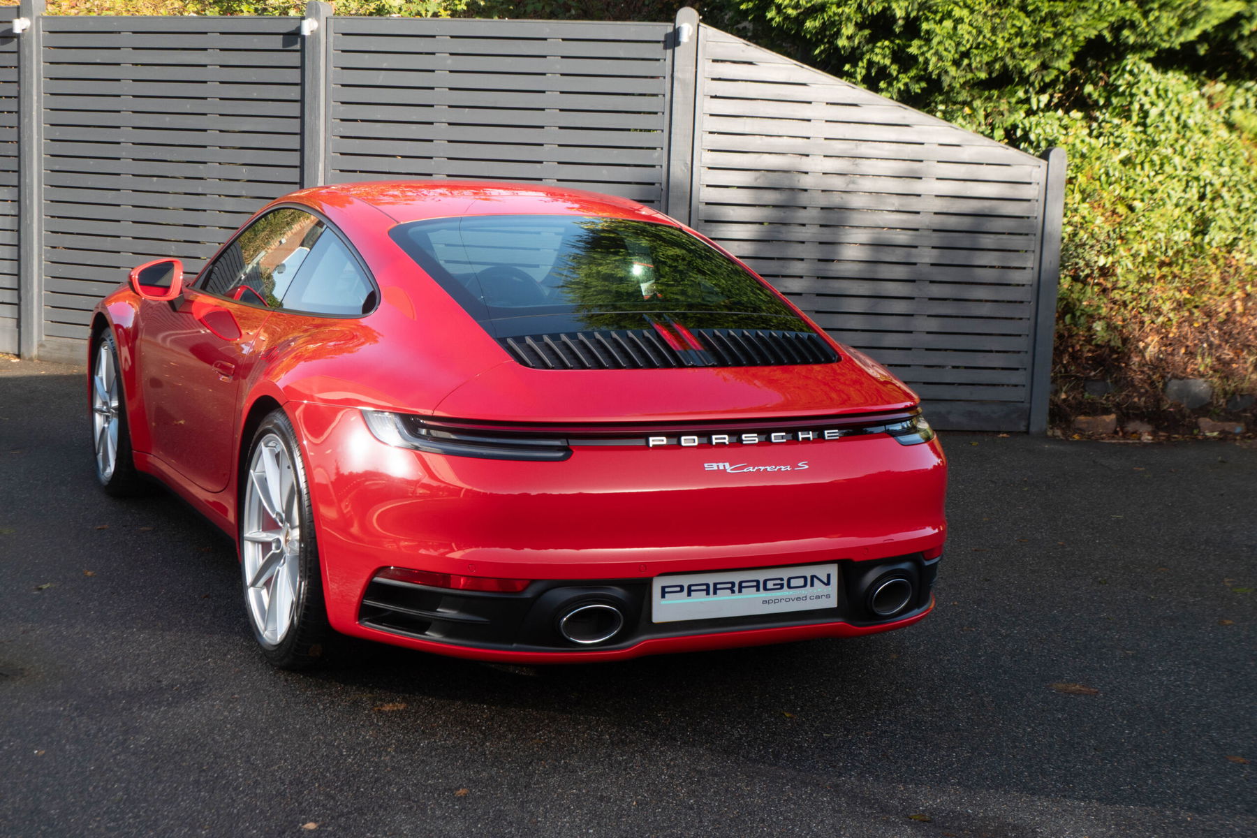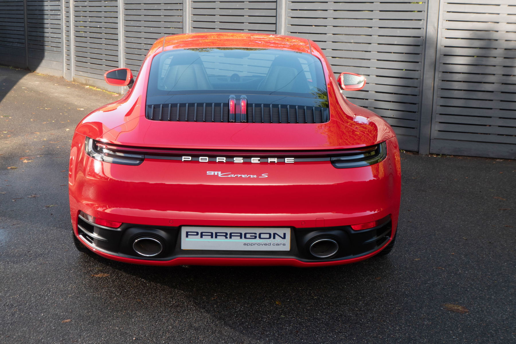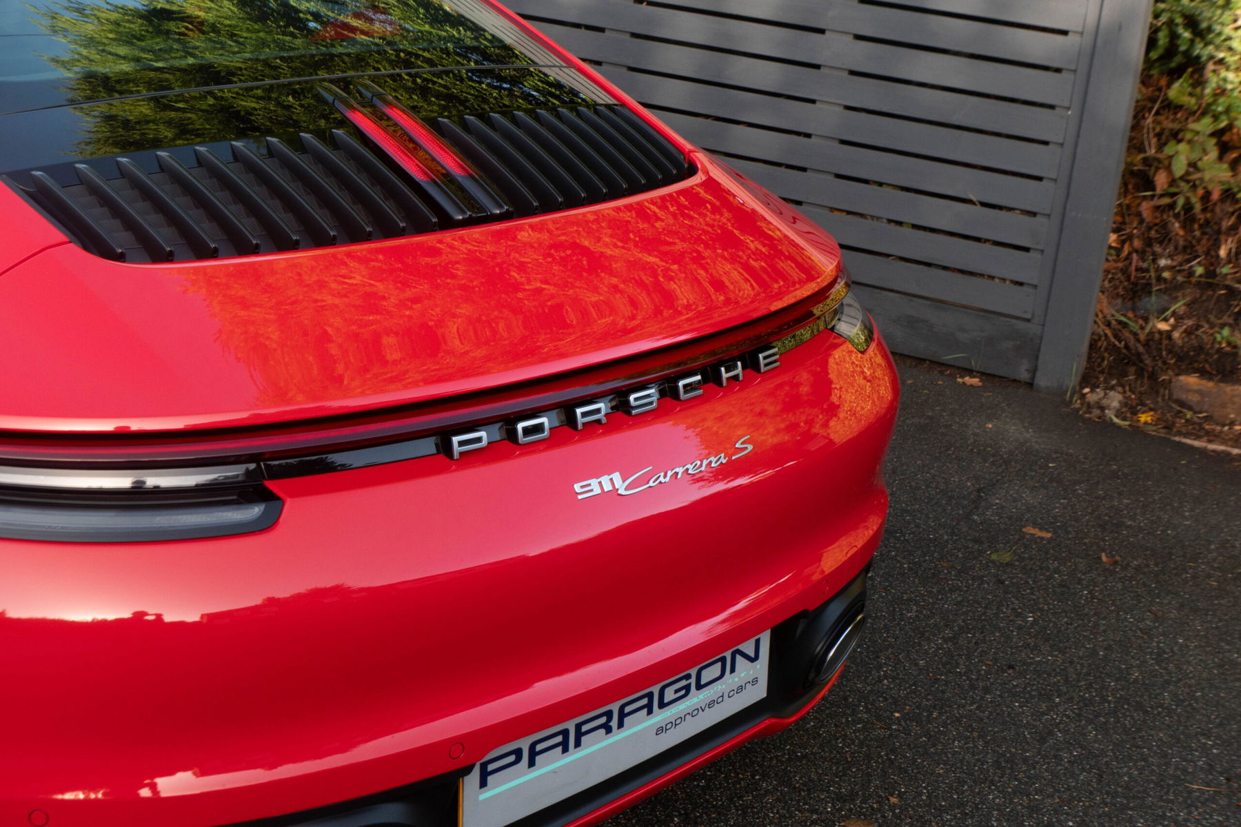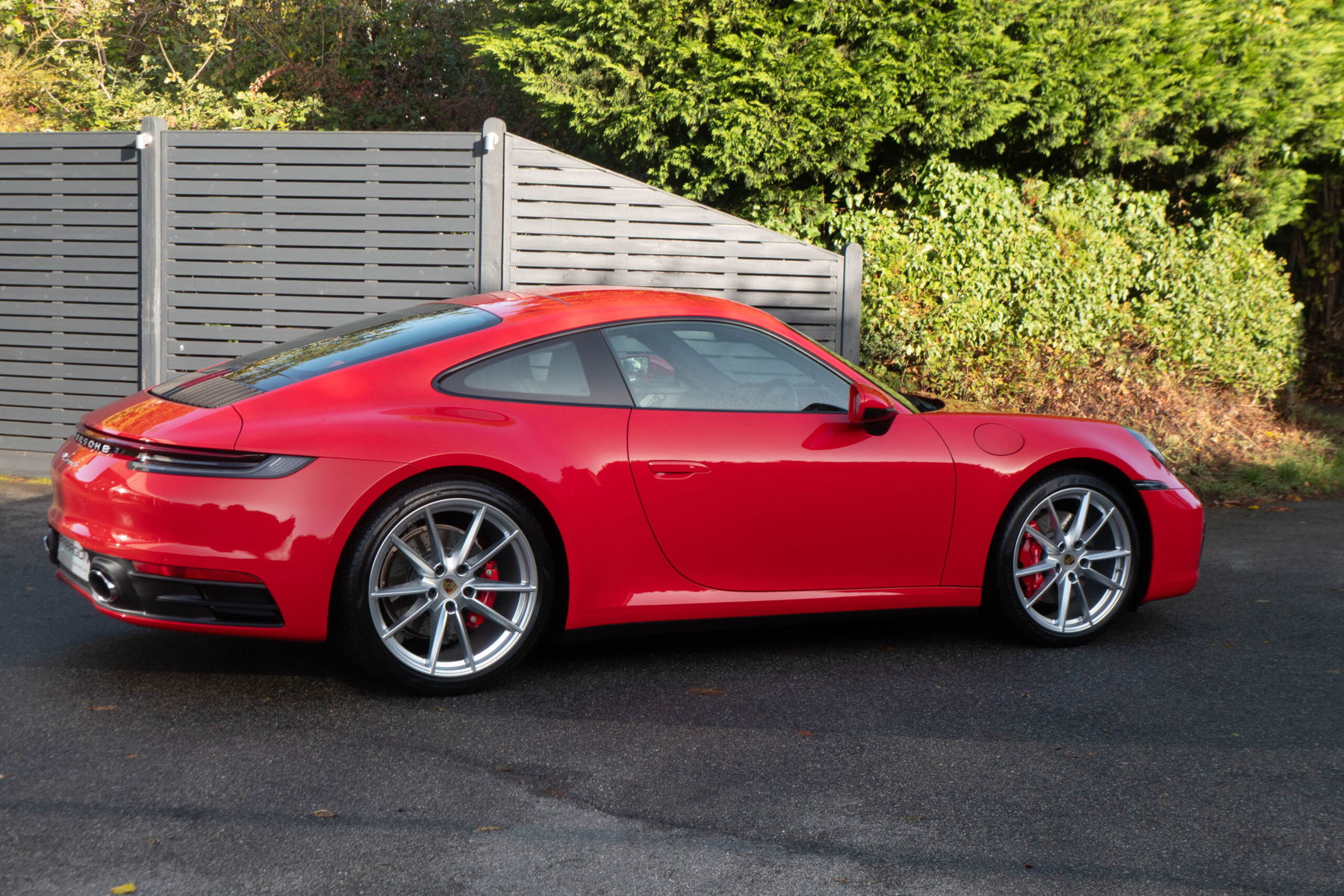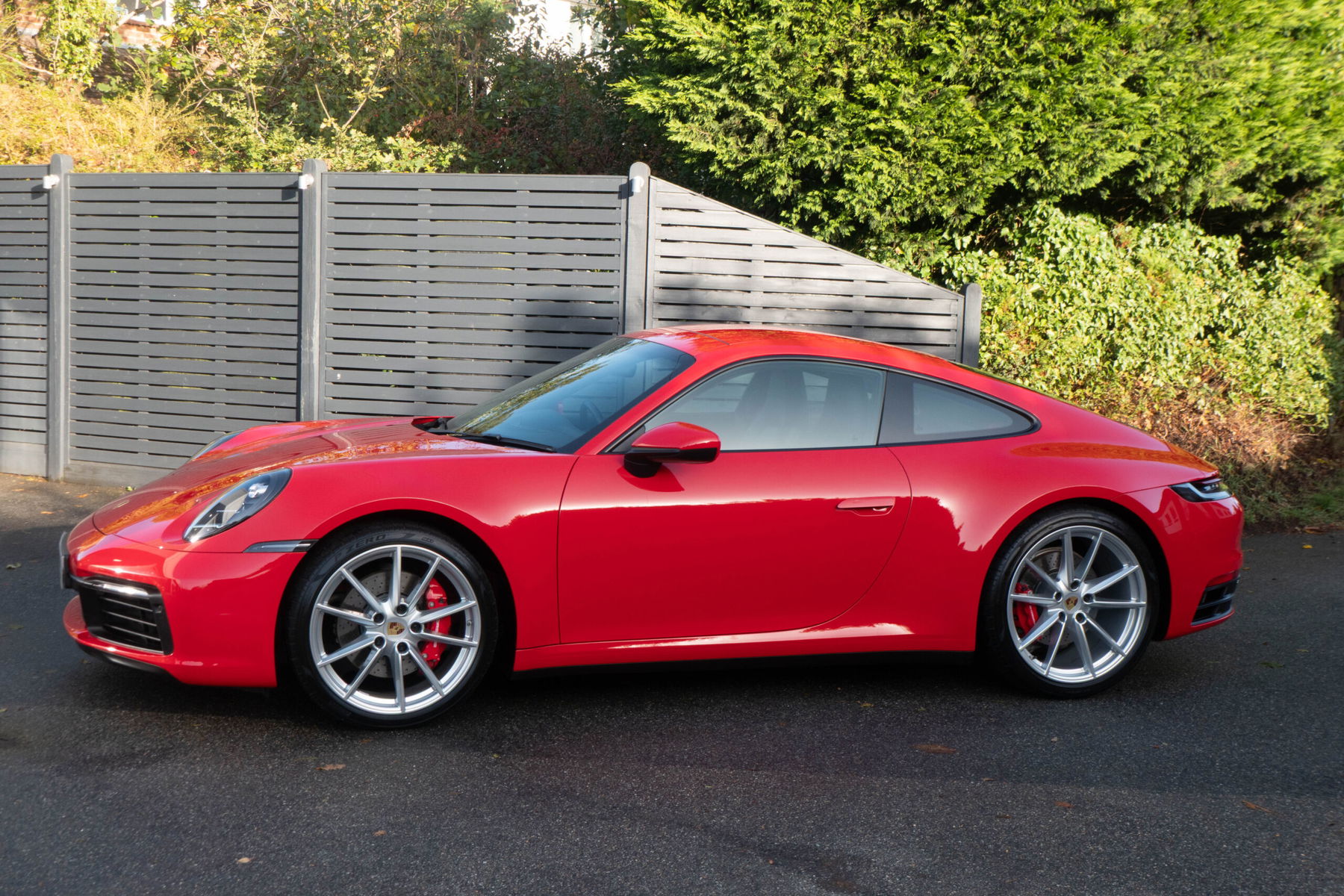 Porsche 911 Carrera 2 S Coupe (992) 8-Gang PDK, Indischrot, schwarze Ledersitze, Klimaanlage, Multifunktionslenkrad, sprachgesteuerter Computer, Porsche Active Suspension Management & Porsche Stability Management, Touchscreen-Satellitennavigation mit Apple Car Play, Bluetooth-Telefon & DAB-Radio, Bi-Xenon-Scheinwerfer, LED-Tagfahrlicht, automatisches Fahrlicht, Stopp/Start-Funktion.
