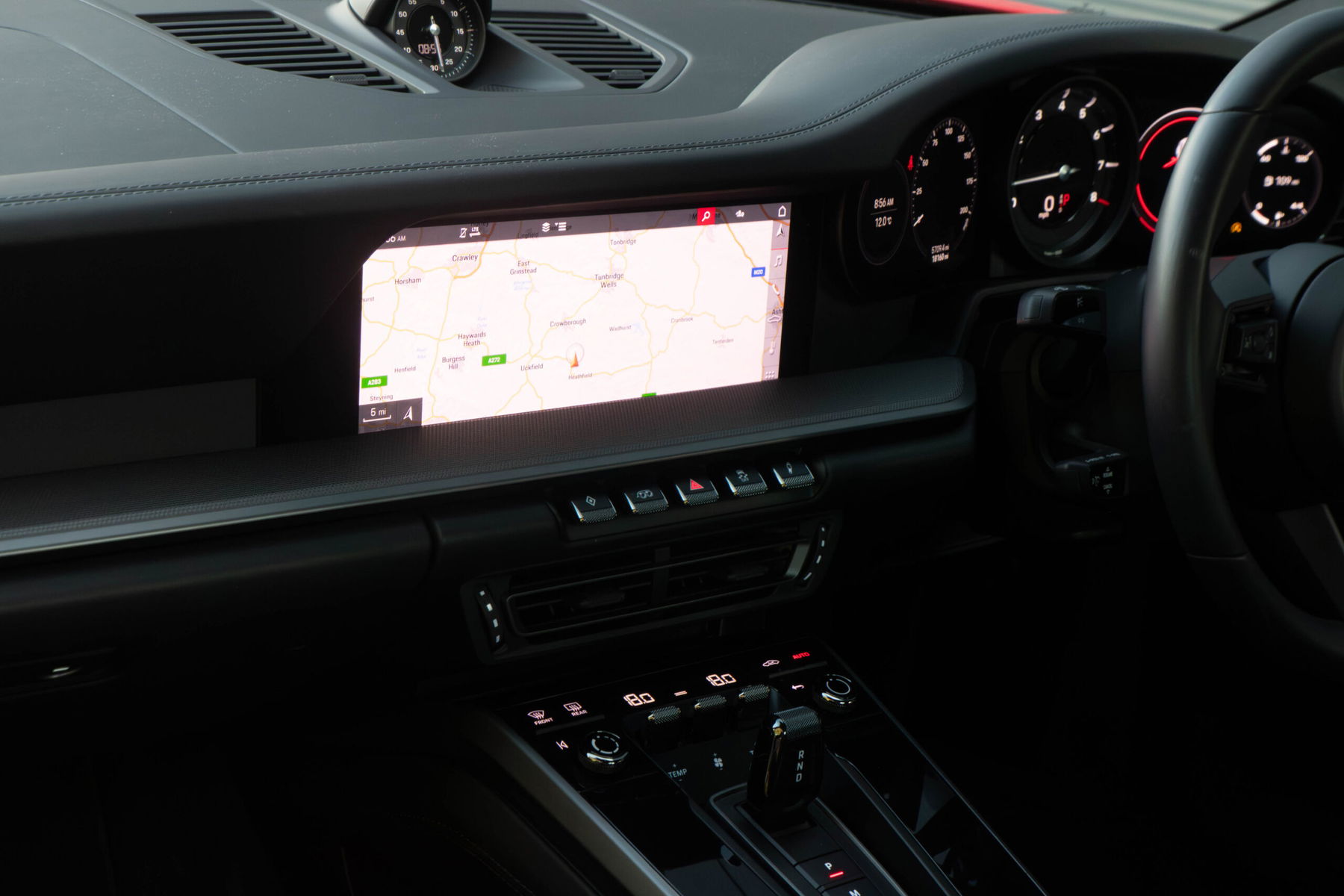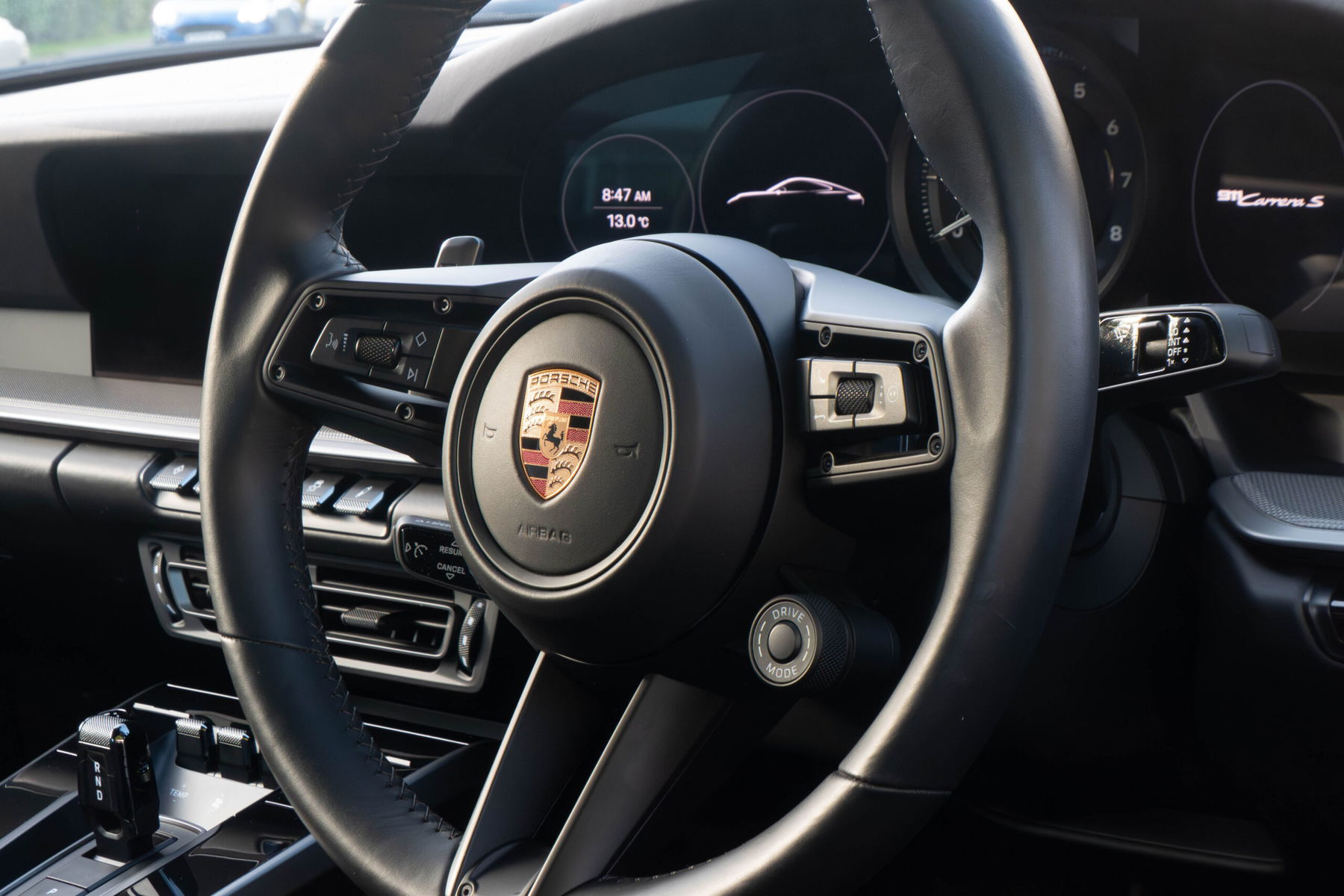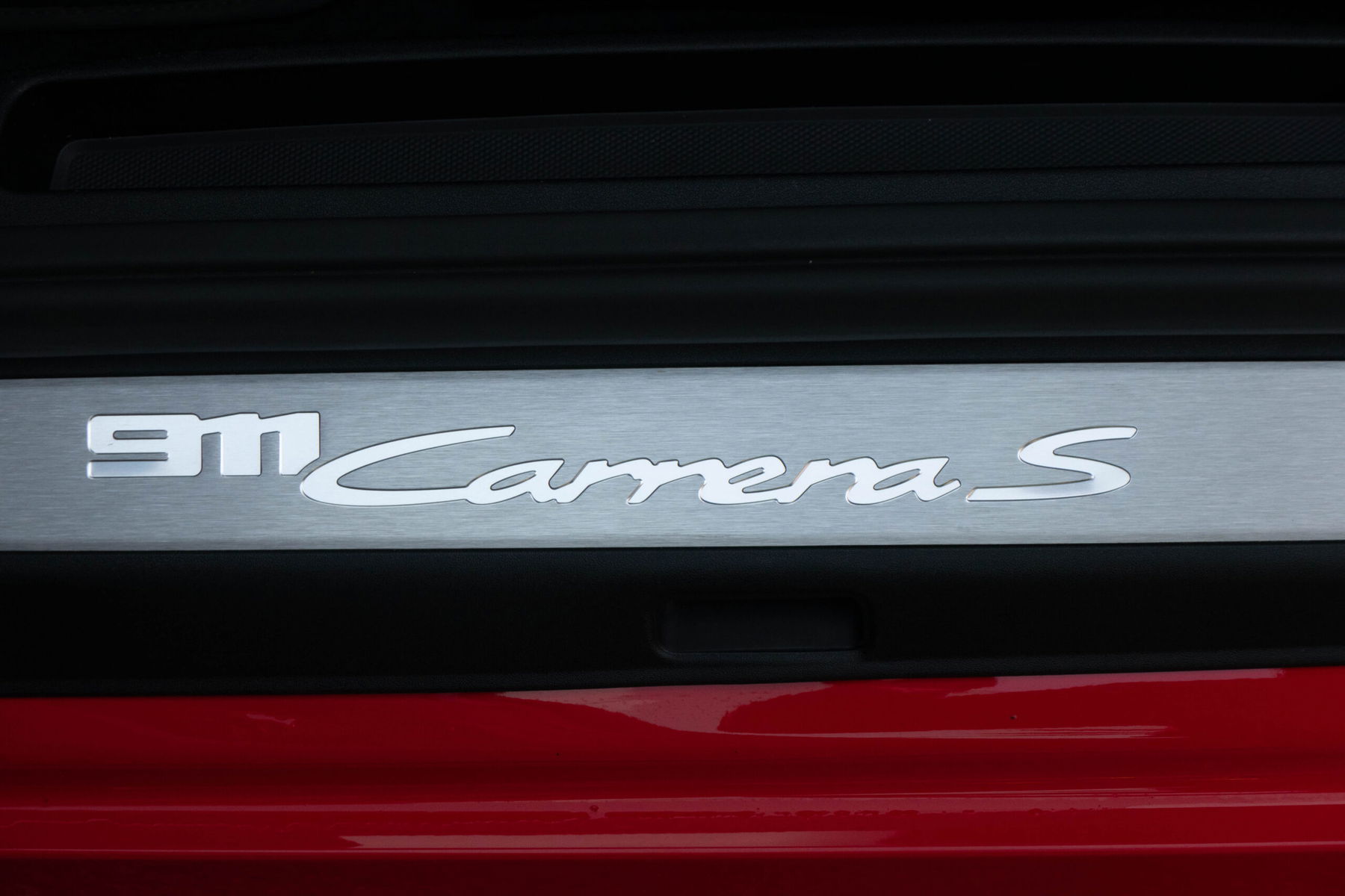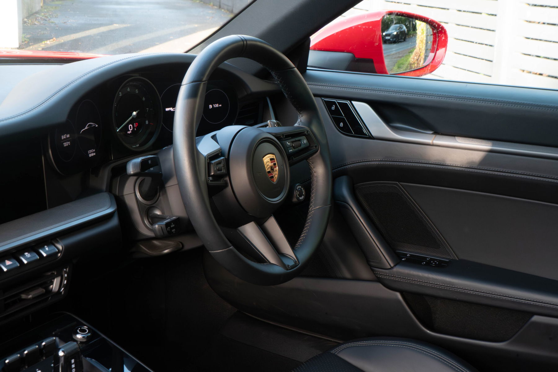 Zu den Optionen gehören: 20/21″ Carrera S Räder, zuschaltbarer Sportauspuff, Indischrote Sicherheitsgurte, elektrisches Schiebedach, Servotronic-Lenkung, Sitzheizung, Tempomat, Sport Chrono mit Sport Plus, Parksensoren vorne und hinten, 8-Gang PDK-Getriebe.