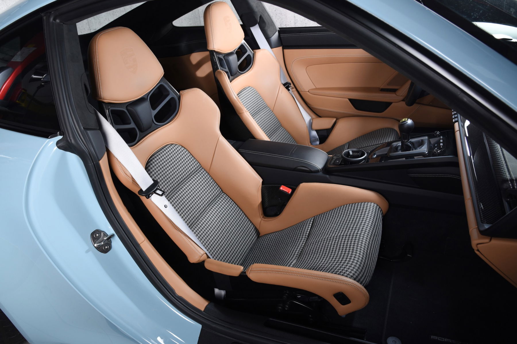 2022 Porsche 911 GT3 (992.1) Touring 6-Gang-Coupé: Ausgestattet mit den für die 992 GT3-Generation charakteristischen 20- und 21-Zoll-Mittellock- und Mehrspeichenrädern, die sich von den gelben Bremssätteln des renommierten Porsche Carbon-Keramik-Bremssystems abheben, und einer Karosserie in der unglaublich attraktiven und retro-angehauchten Sonderlackierung Meissen Blue, einem sanften und raffinierten Pastellblau, das unter bestimmten Lichtverhältnissen einen fast gedämpften violettgrauen Ton annehmen kann. Der Innenraum ist mit cognacbraunem Leder ausgekleidet und wird optisch durch Karbonfaser-Zierleisten und silbergraue Sicherheitsgurte, einen weißen Drehzahlmesser und ein Sport Chrono-Zifferblatt sowie einen gelb lackierten Schaltknauf des berühmten 6-Gang-GT-Sport-Getriebes aufgewertet.