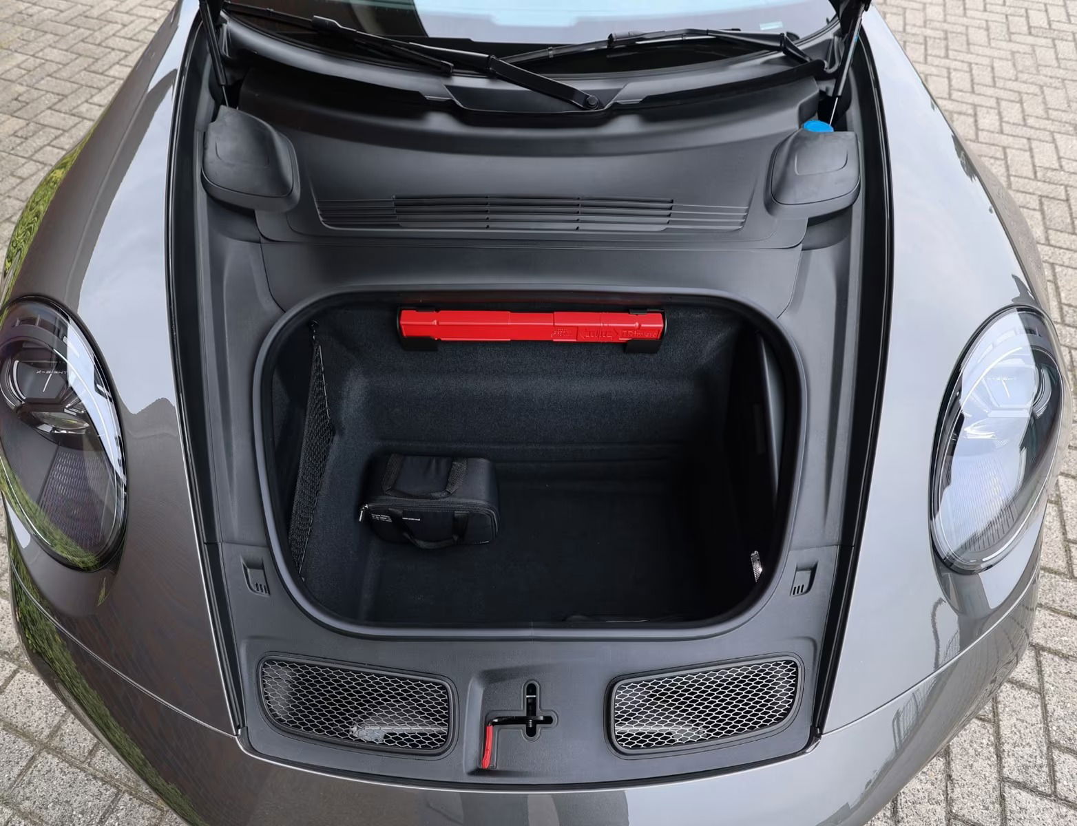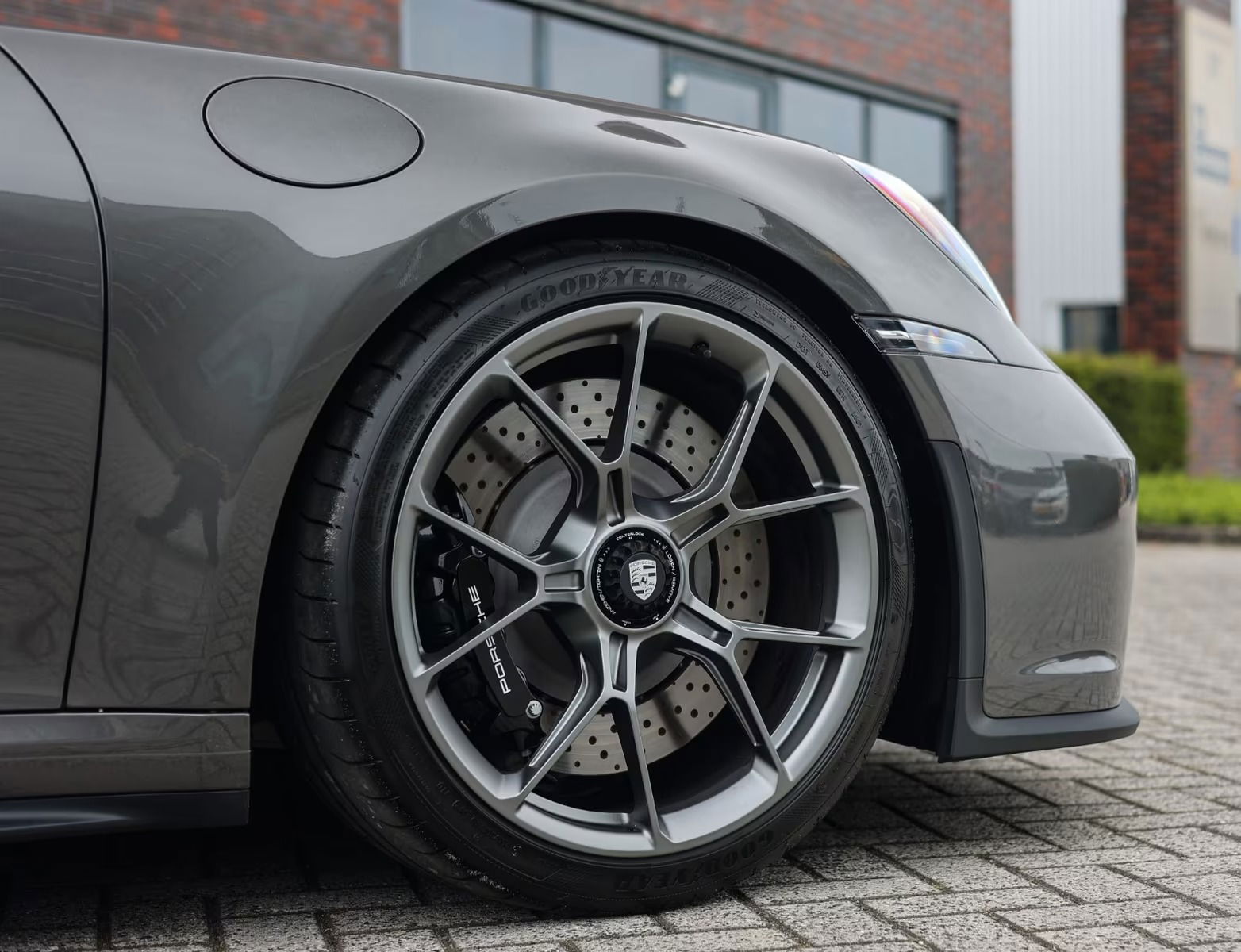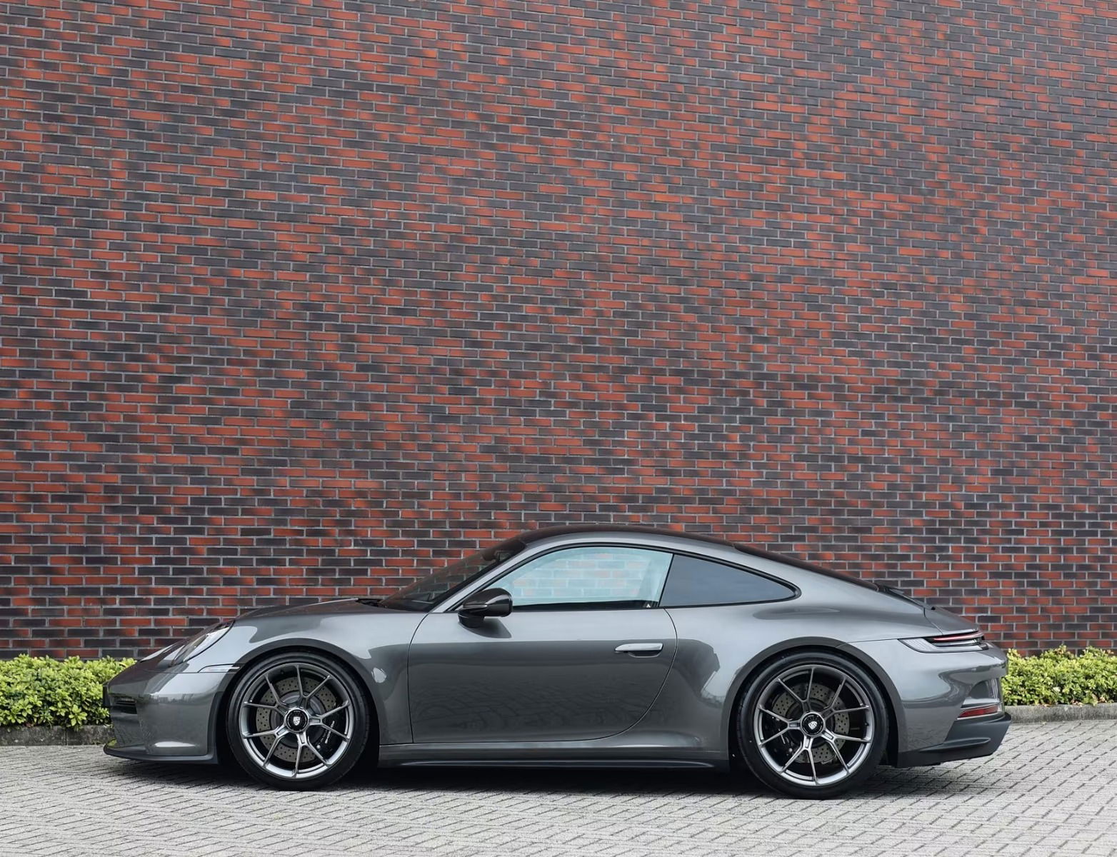 This Dutch-delivered example is finished in Agate Grey Metallic with carbon roof and mirror caps. The cabin is dressed in exclusive grey and black leather by Porsche Exclusive Manufaktur, complemented by a black Alcantara headliner.