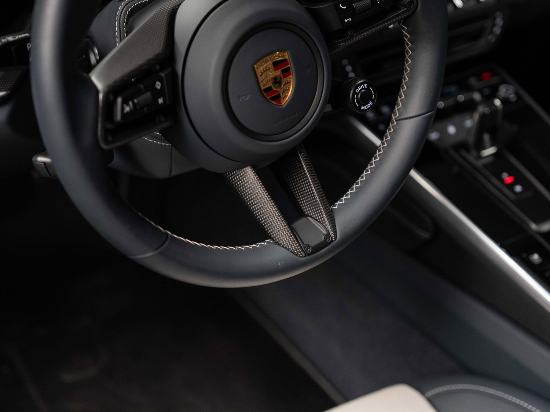 Er ist in Ice Grey Metallic lackiert und verfügt über eine exklusive Graphite Blue-Lederausstattung, ergänzt durch umfangreiche Alcantara/Race-Tex- und Exclusive Manufaktur-Details aus Carbon und Leder, die dem Fahrzeug einen einzigartigen und stimmigen Charakter verleihen.