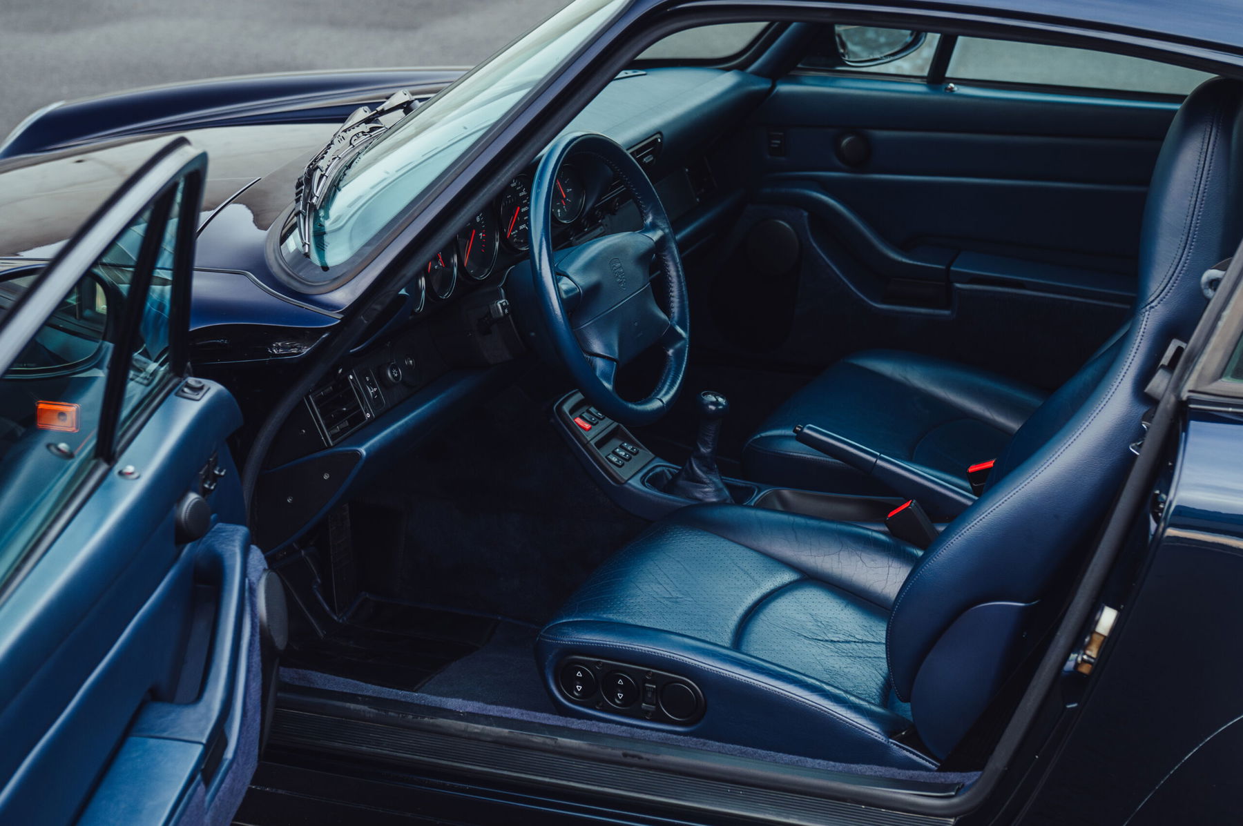 Dieser Porsche 993 Carrera aus dem Jahr 1994 ist in dem seltenen und eleganten Farbton Midnight Blue Metallic (L39C) lackiert und verfügt über eine komplette Innenausstattung in Marine Blue Leder (FJ). Der tiefe Metallic-Farbton stellt die zeitlosen Kurven des 993 perfekt heraus, während das dunkle Interieur für eine raffinierte und zweckmäßige Atmosphäre sorgt.