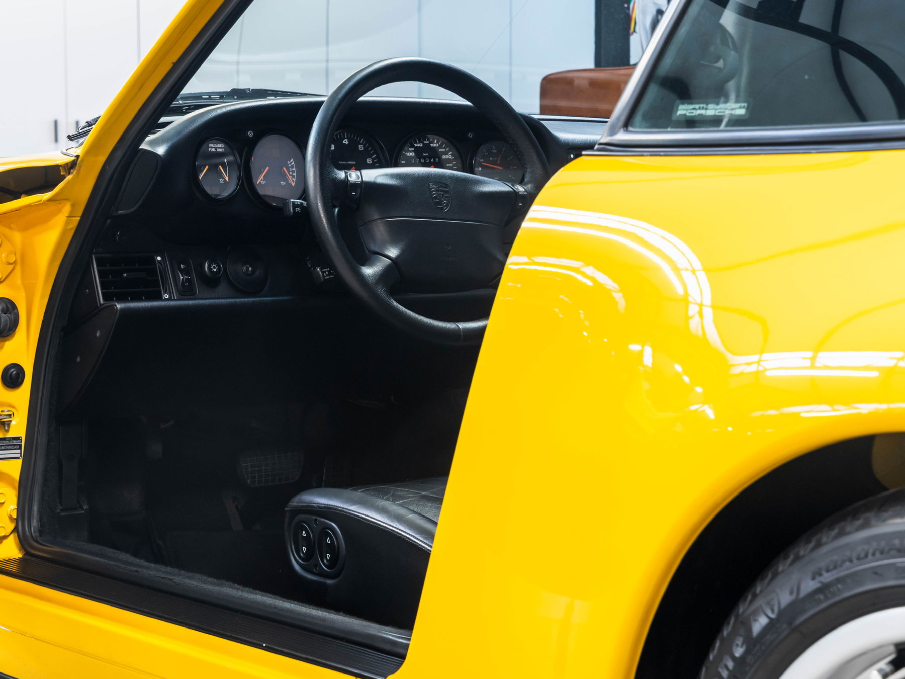 Das Fahrzeug wurde ursprünglich in speedgelb ausgeliefert, einer Farbe, die zu einem echten Symbol für das Porsche-Design der 1990er Jahre geworden ist. Die Lackierung weist auch heute noch einen ausgezeichneten Glanz und einen sehr schönen Gesamteindruck auf. Das Fahrzeug wurde in der Vergangenheit zwar weitgehend neu lackiert, ist jedoch unfallfrei und weist korrekte und gleichmäßige Lackdickenwerte auf. Ein vollständiger Lackmessbericht kann vorgelegt werden.