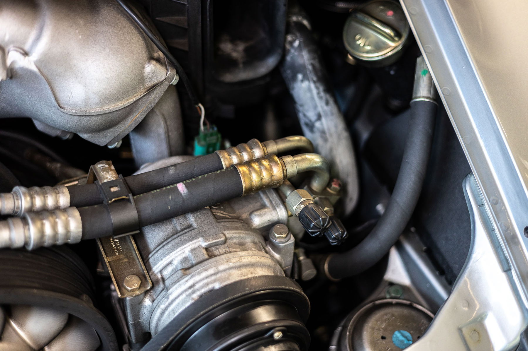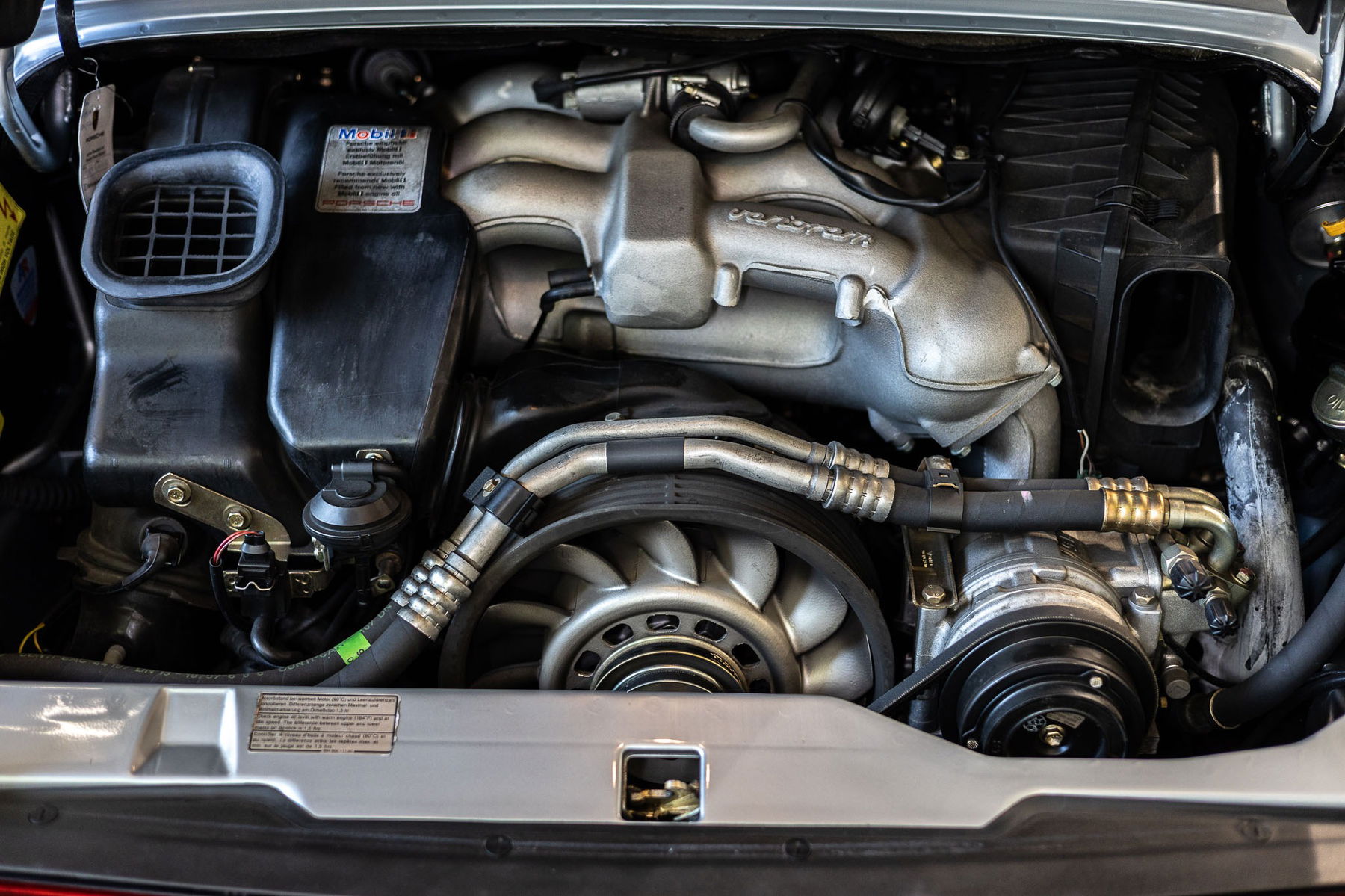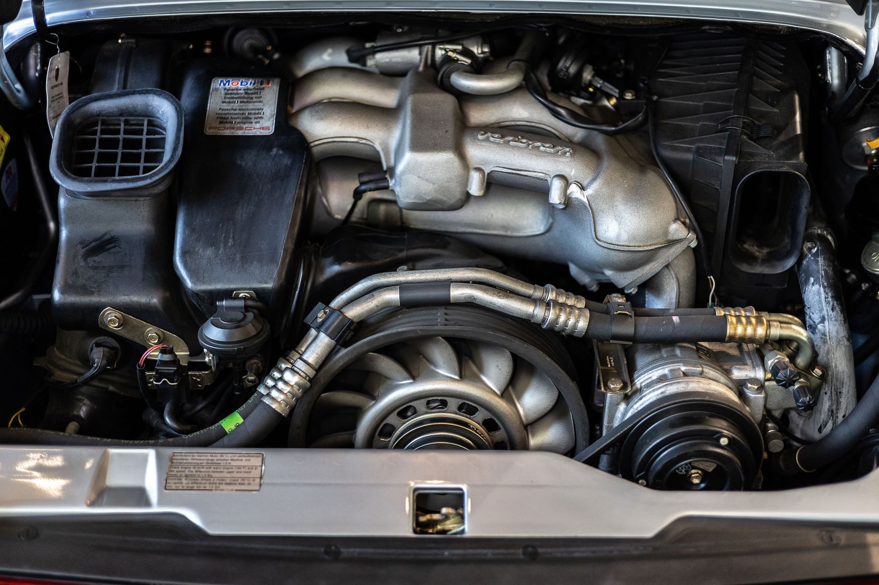 Aufgrund der lückenlos nachvollziehbaren Historie gehen wir davon aus, dass es sich bei Motor und Getriebe um die originalen Aggregate des Fahrzeuges handelt. Revisionen waren bisher nicht erforderlich, jedoch wurden regelmäßig Wartungsmaßnahmen durchgeführt, so dass der Motor in allen Temperatur-, Drehzahl- und Lastbereich einwandfrei funktioniert. Verdächtige Geräusche oder Rauchentwicklung liegen nicht vor. Der gesamte Motorraum, einschließlich Motor und dessen Anbauteile, befinden sich in sehr gutem Zustand. Das Kaltstartverhalten und der Motorlauf über den gesamten Temperaturbereich bis hin zur konstant gehaltenen Betriebstemperatur sind tadellos.
