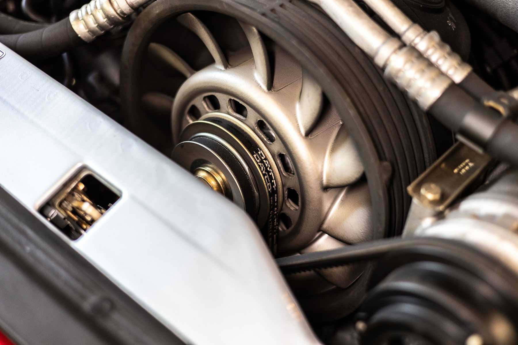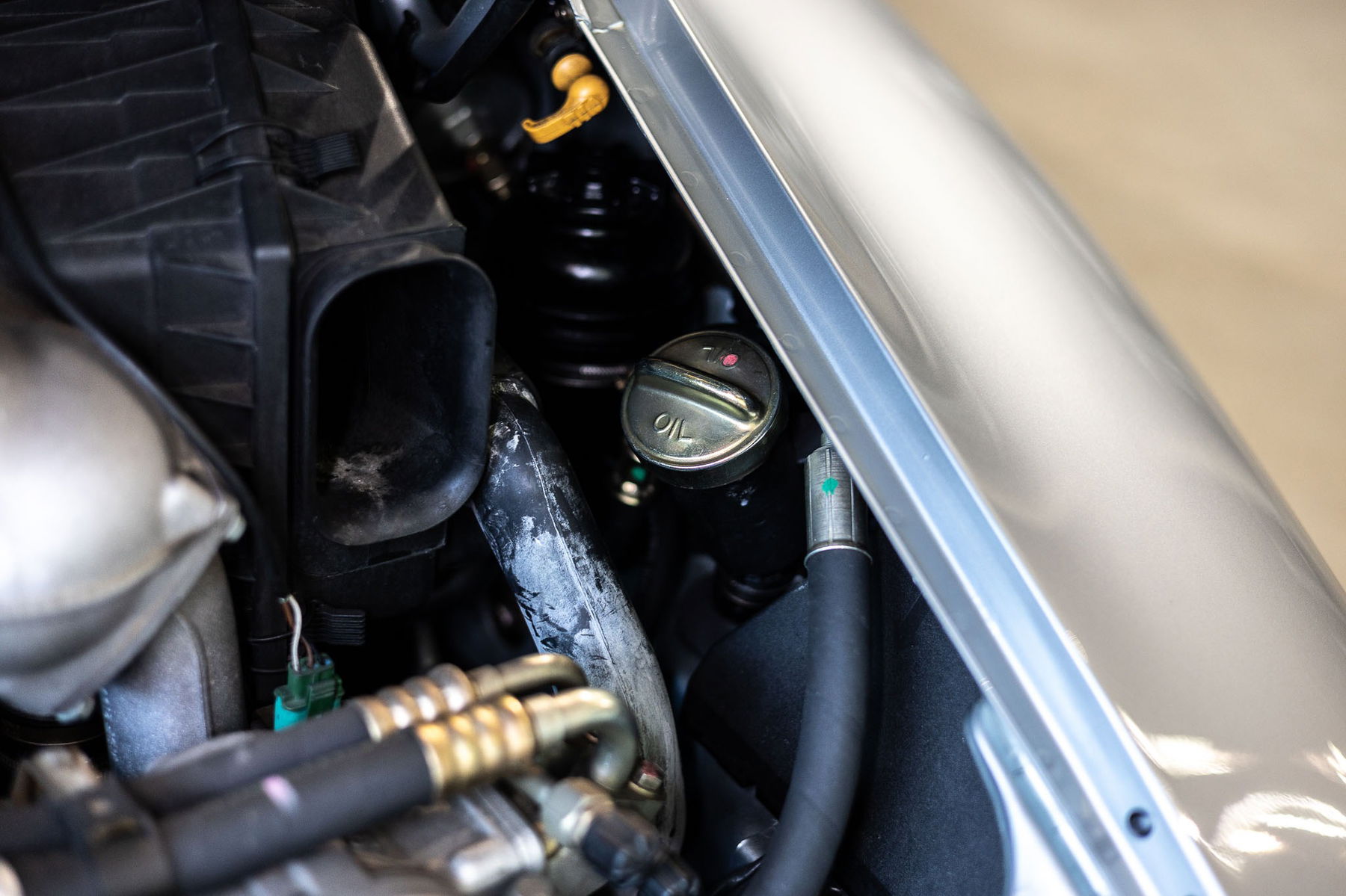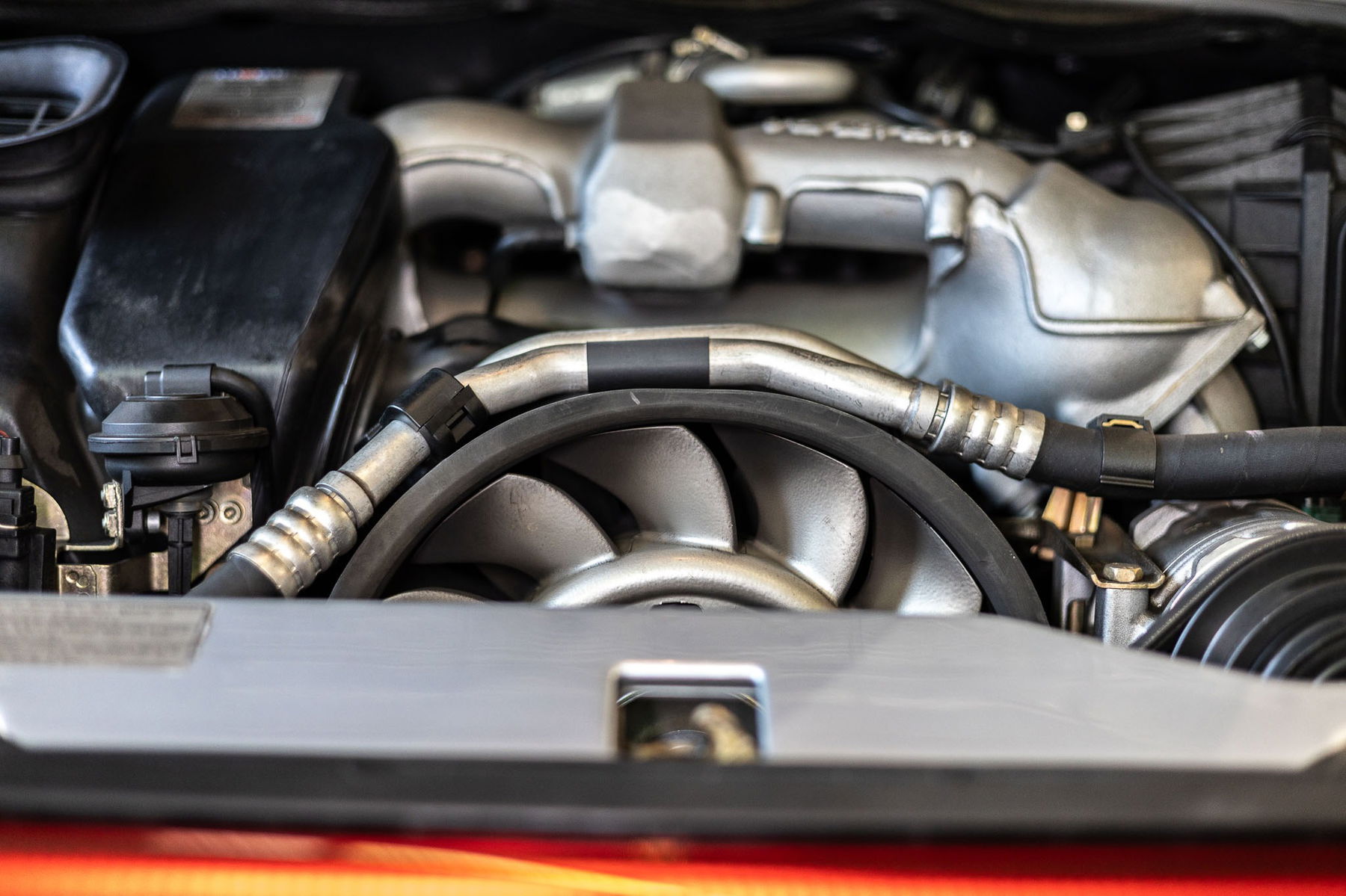 Aufgrund der lückenlos nachvollziehbaren Historie gehen wir davon aus, dass es sich bei Motor und Getriebe um die originalen Aggregate des Fahrzeuges handelt. Revisionen waren bisher nicht erforderlich, jedoch wurden regelmäßig Wartungsmaßnahmen durchgeführt, so dass der Motor in allen Temperatur-, Drehzahl- und Lastbereich einwandfrei funktioniert. Verdächtige Geräusche oder Rauchentwicklung liegen nicht vor. Der gesamte Motorraum, einschließlich Motor und dessen Anbauteile, befinden sich in sehr gutem Zustand. Das Kaltstartverhalten und der Motorlauf über den gesamten Temperaturbereich bis hin zur konstant gehaltenen Betriebstemperatur sind tadellos.