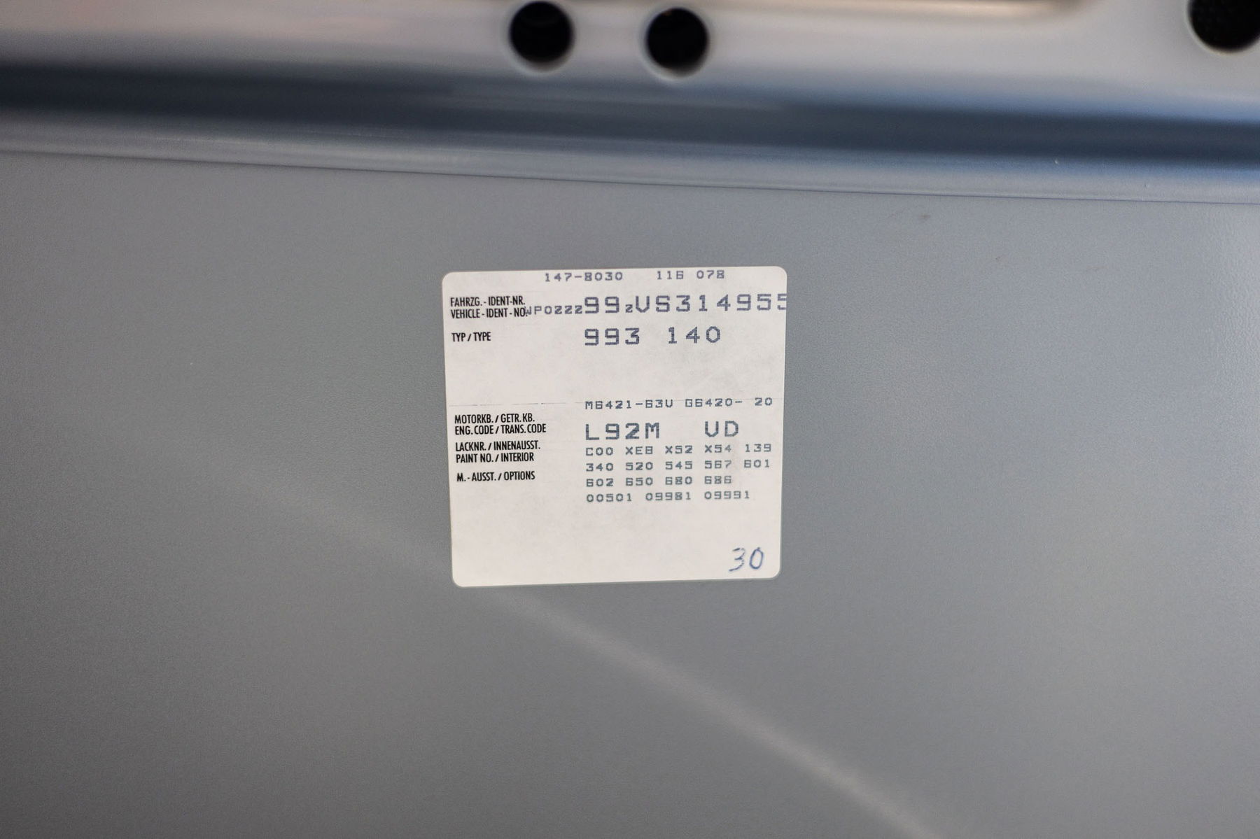 Alle Werksaufkleber sind am gesamten Fahrzeug ohne Abnutzungsspuren noch vorhanden. Die Ausstattungsliste der gewählten Extras ist lang und beinhaltet darüberhinaus Sonderwünsche – die mit den sogenannten X-Optionen gekennzeichnet sind.