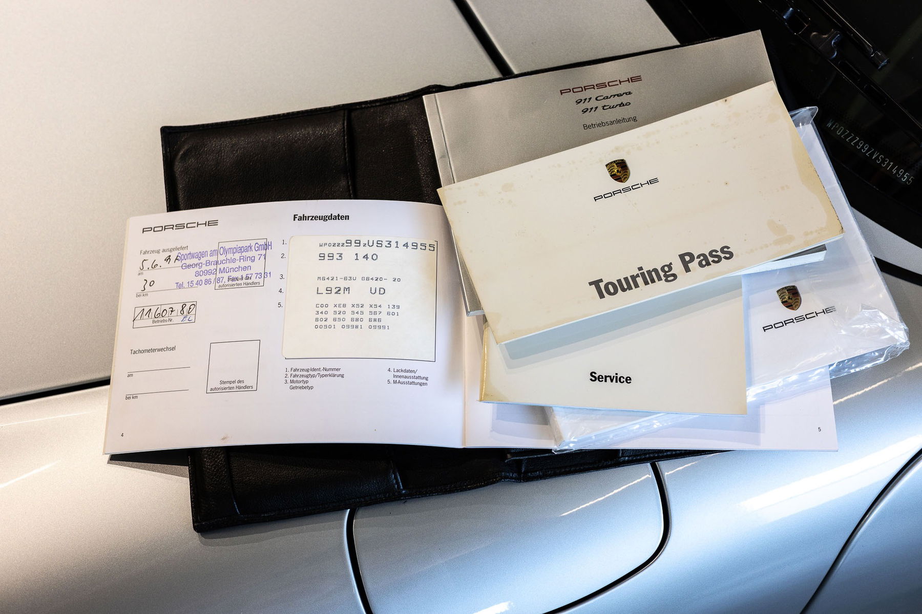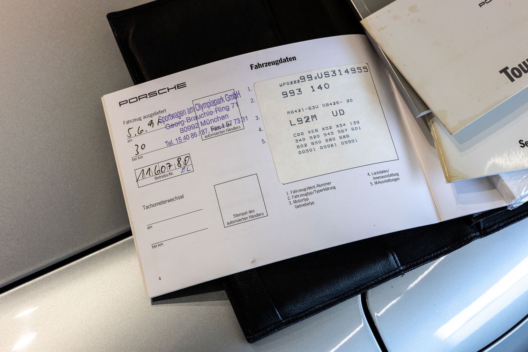 Der originale Fahrzeugbrief mit den Unterlagen seit Auslieferung ist wie die gesamte Bordmappe einschließlich Betriebsanleitung, Wartungsheft, Touring Pass, Radioanleitung, sowie das komplette Schlüsselset und das zum Teil ungeöffnete und noch original verschweißte Werkzeugset Bestandteil dieses umfangreichen „Full Sets“.