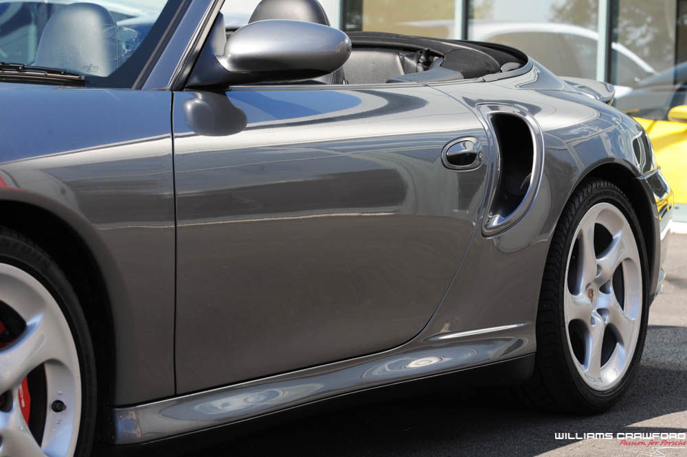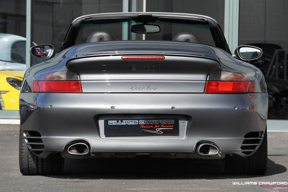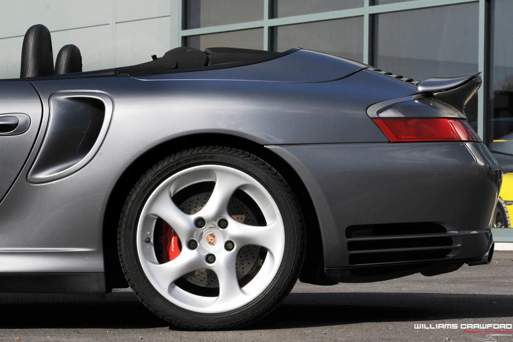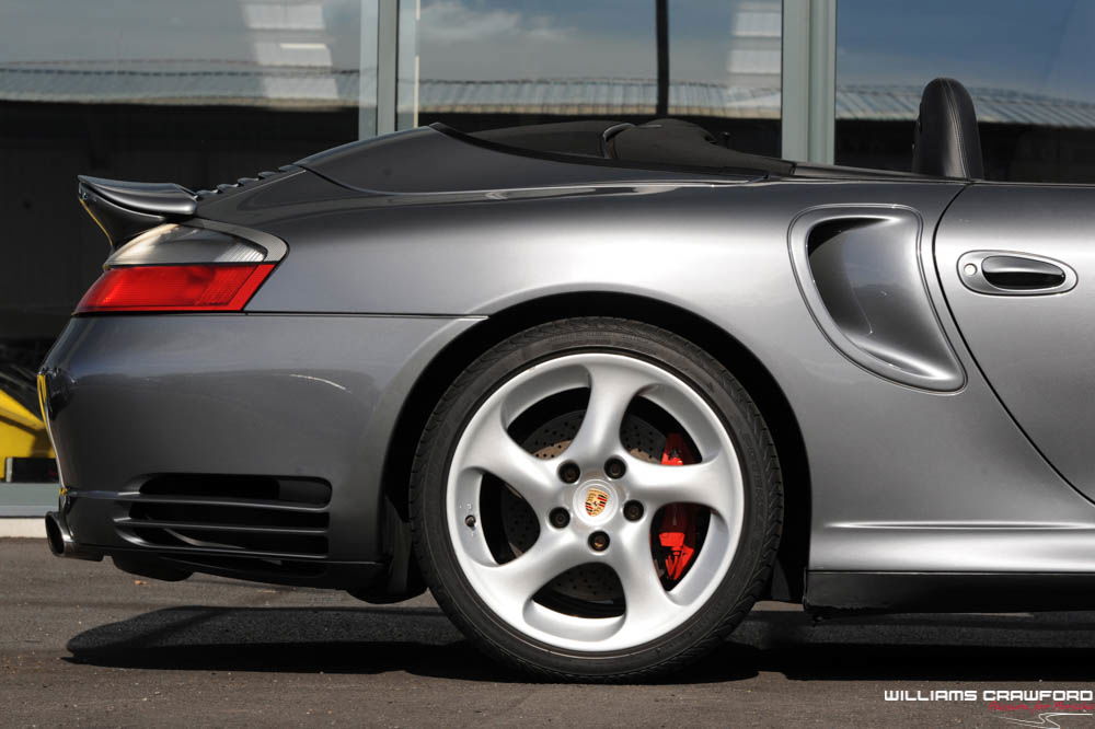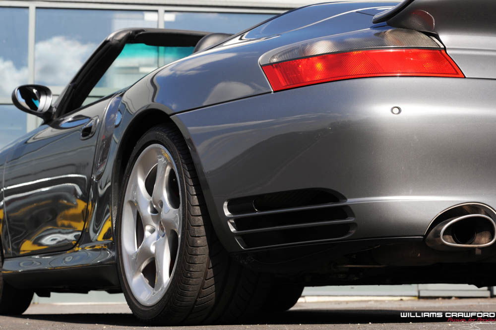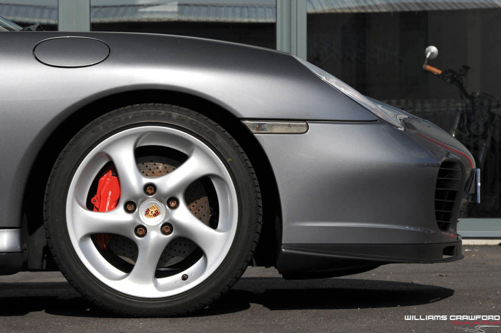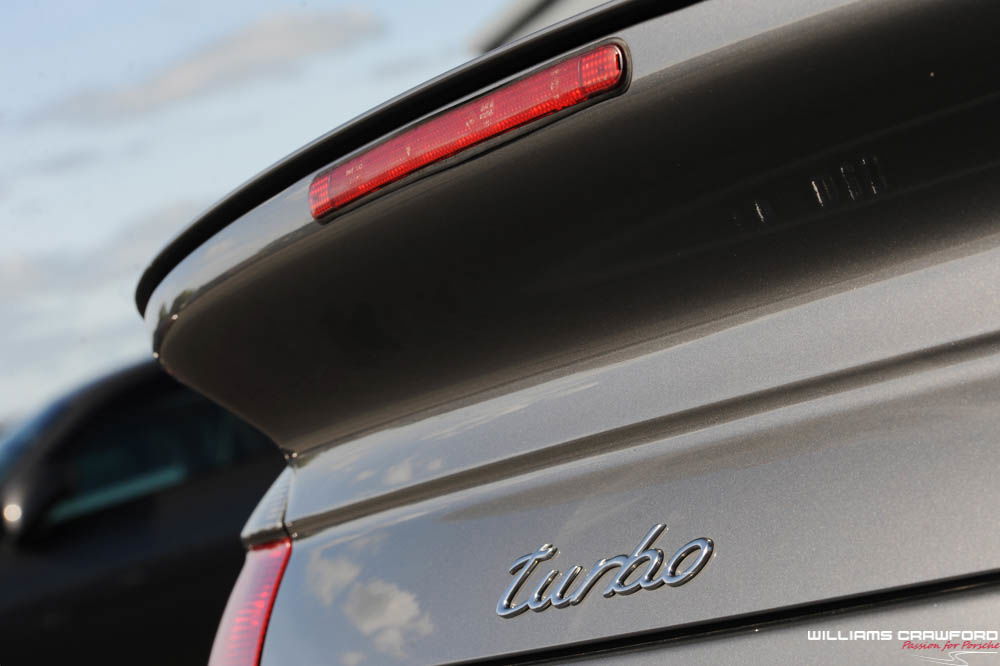 * Siegel grau metallic mit schwarzer Motorhaube und 18 ″ Turbo II-Legierungen mit farbigen Porsche Wappen-Mittelkappen.