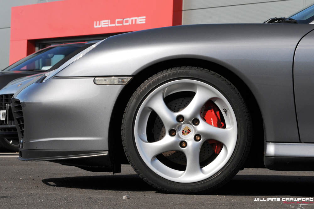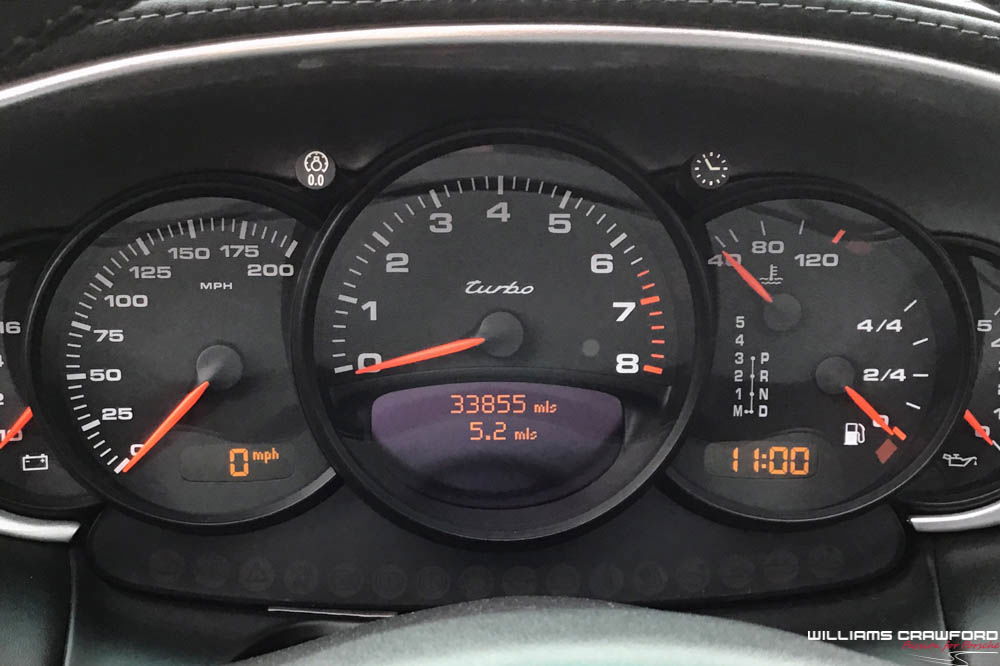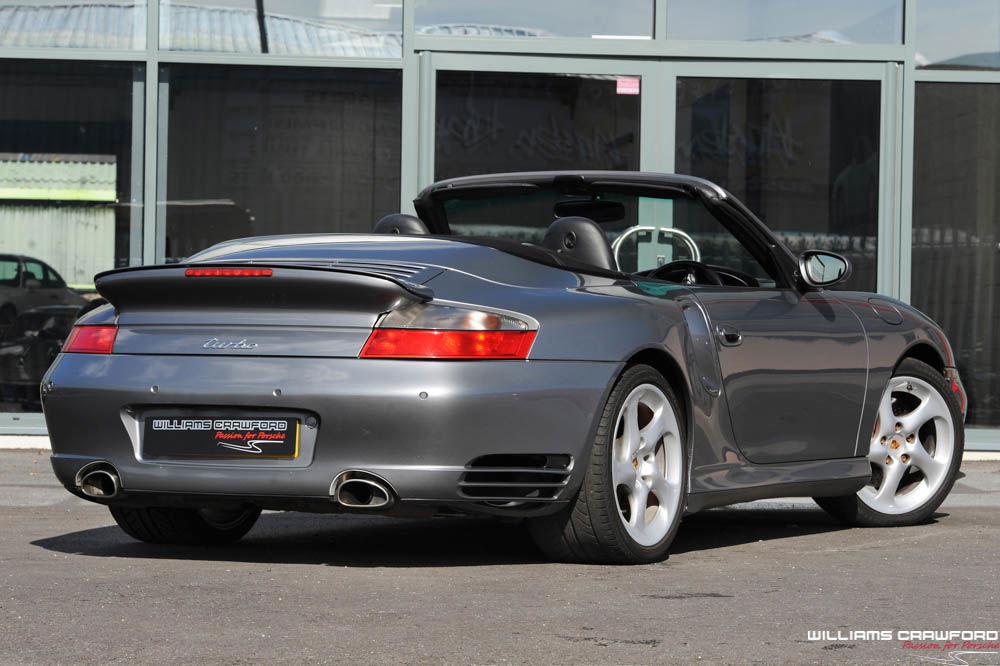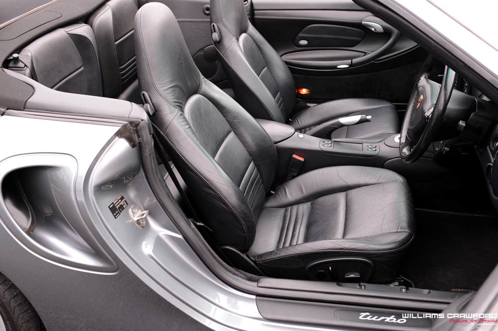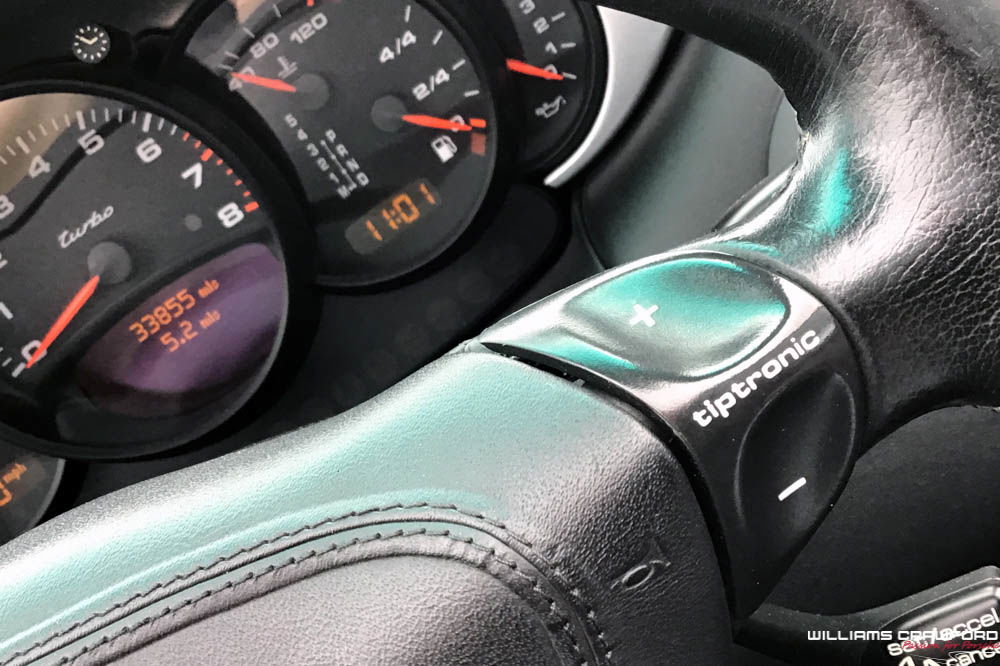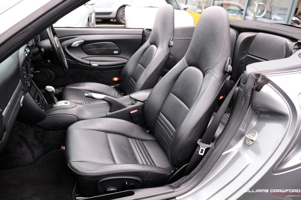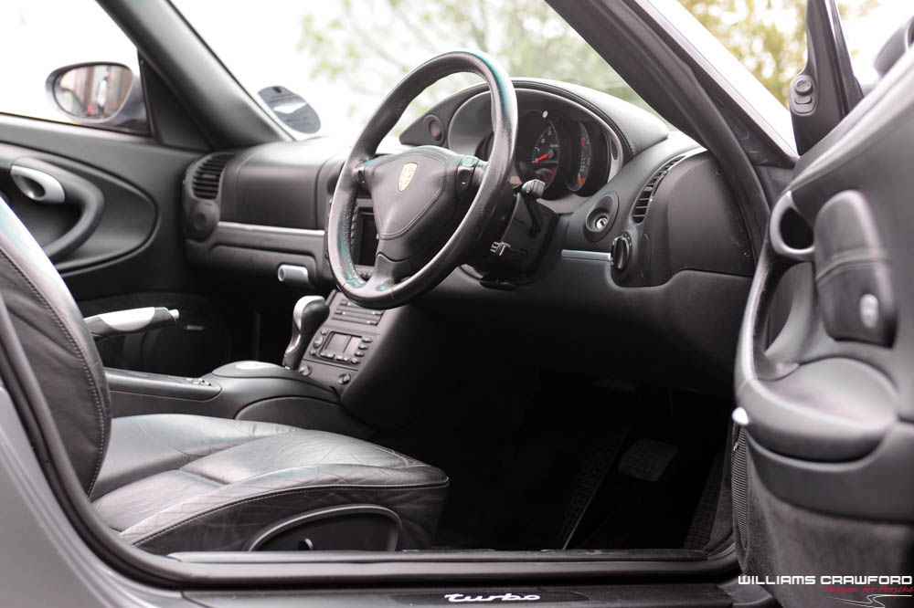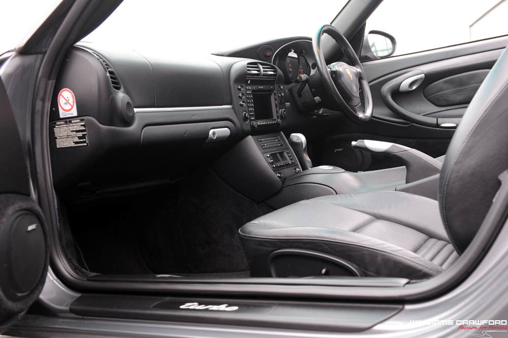 * Siegel grau metallic mit schwarzer Motorhaube und 18 ″ Turbo II-Legierungen mit farbigen Porsche Wappen-Mittelkappen.