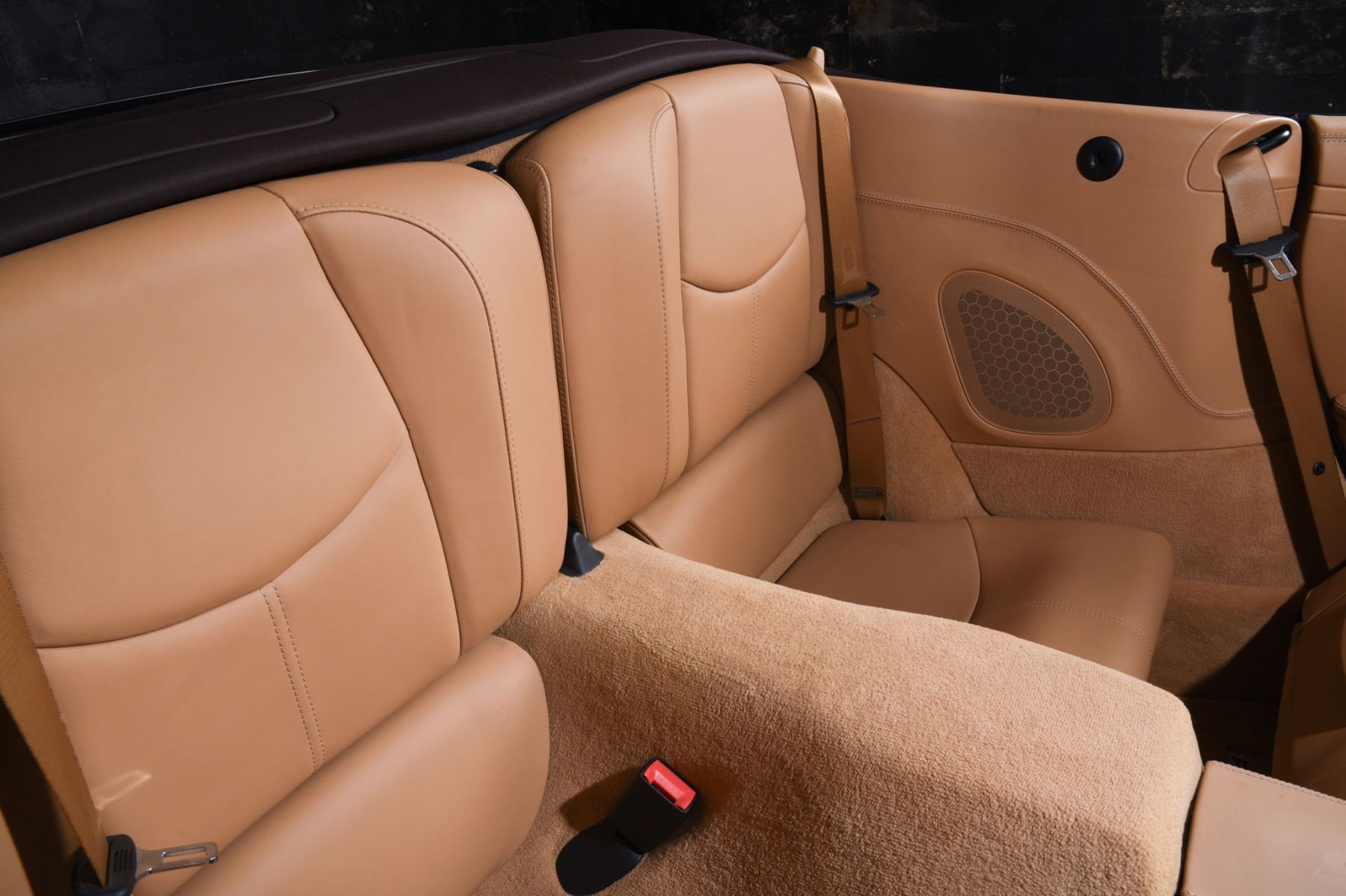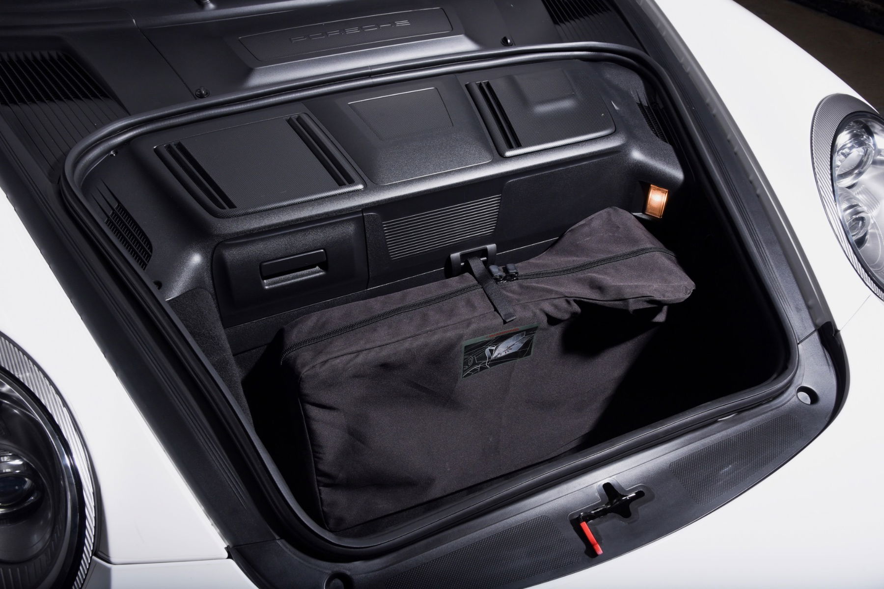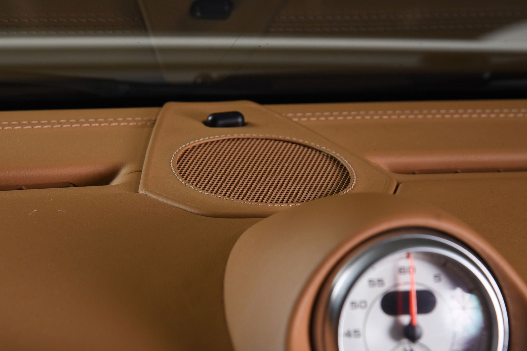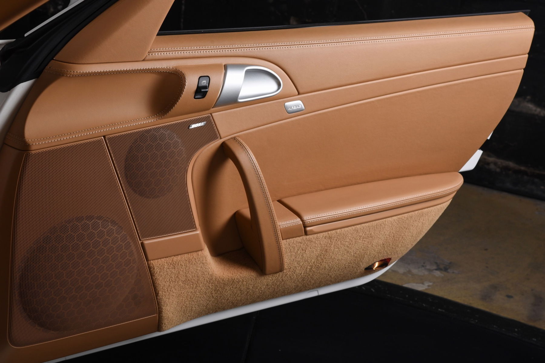 die Karosserie ist in Carrara-Weiß gehalten und mit sandbeigem Vollleder ausgekleidet, das durch sandbeige Sicherheitsgurte, carrara-weiße Ziffernblätter, helle Nähte, das geprägte Porsche-Wappen auf den Kopfstützen, das Modelllogo auf der Ablageklappe und die Lederausstattung auf ausgewählten Flächen ästhetisch aufgewertet wird.