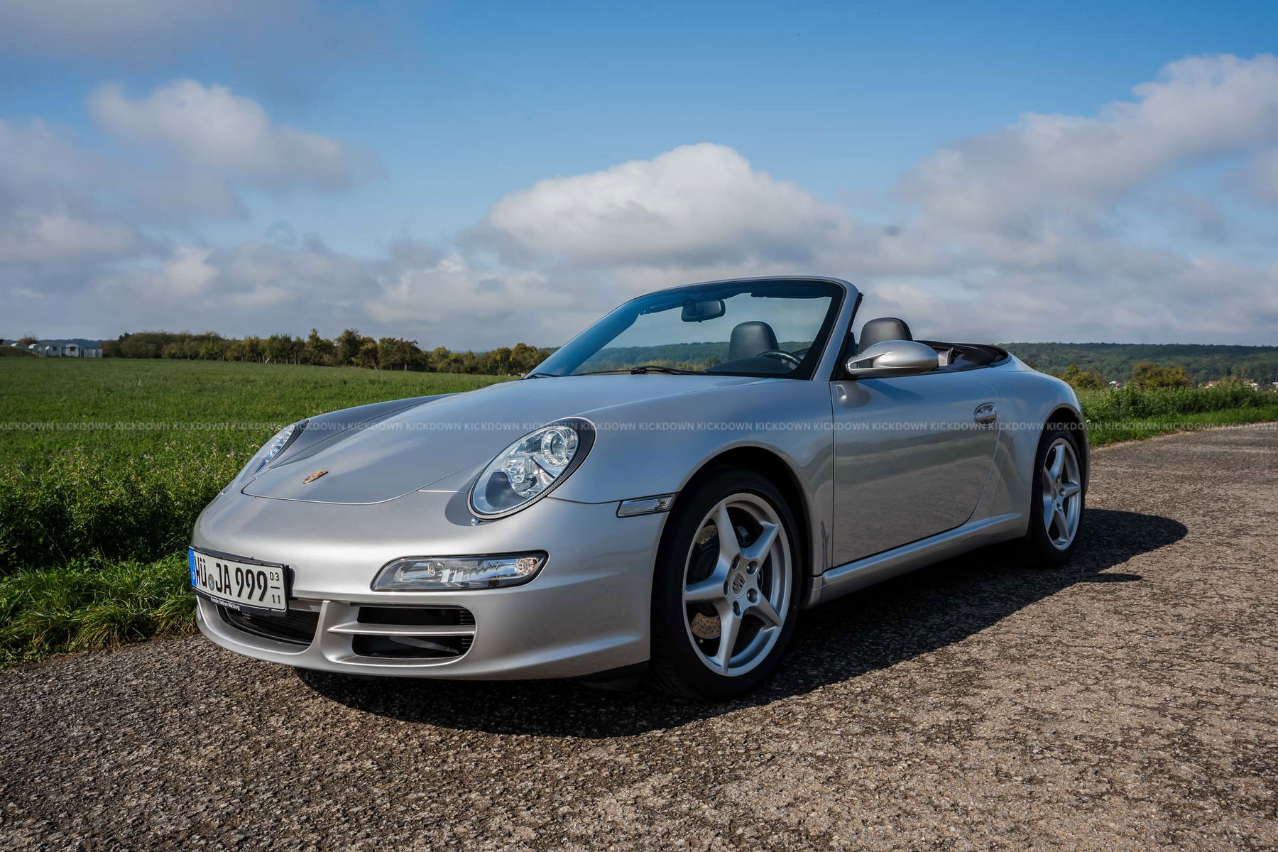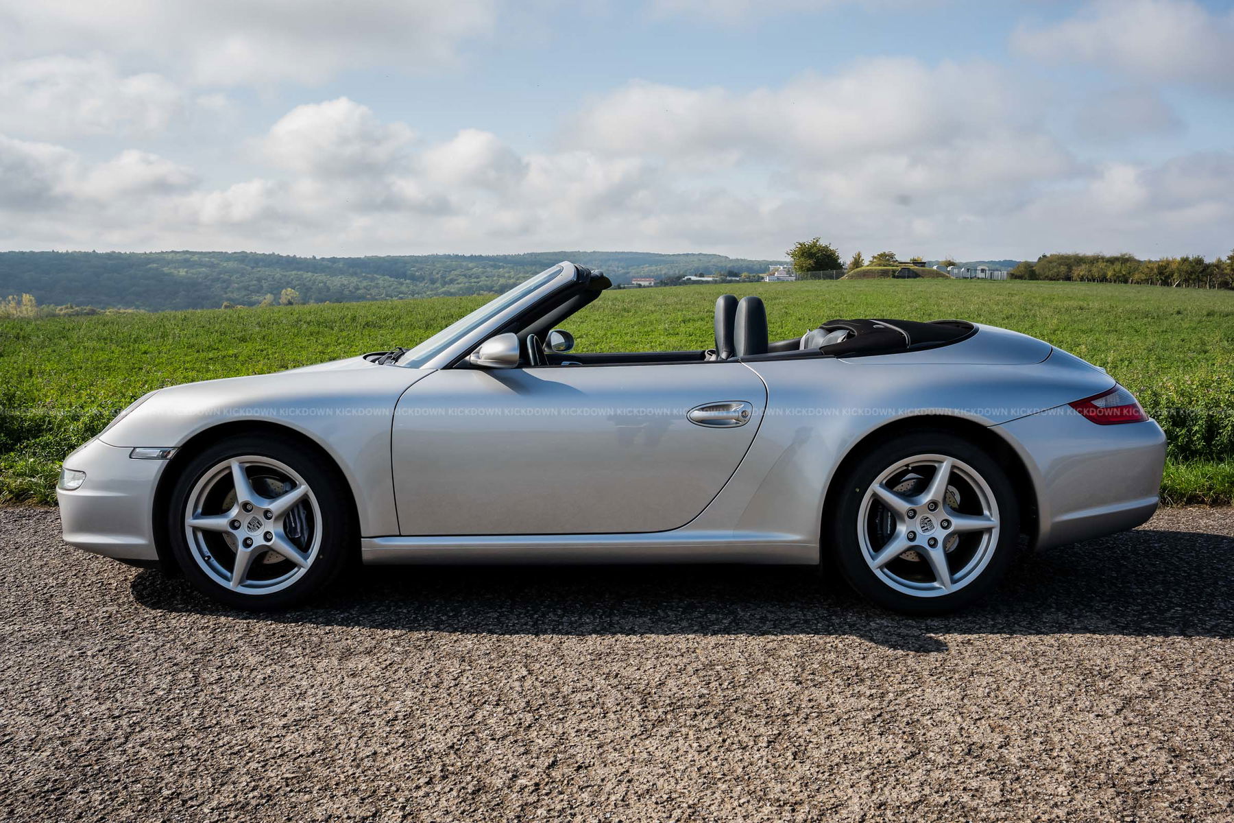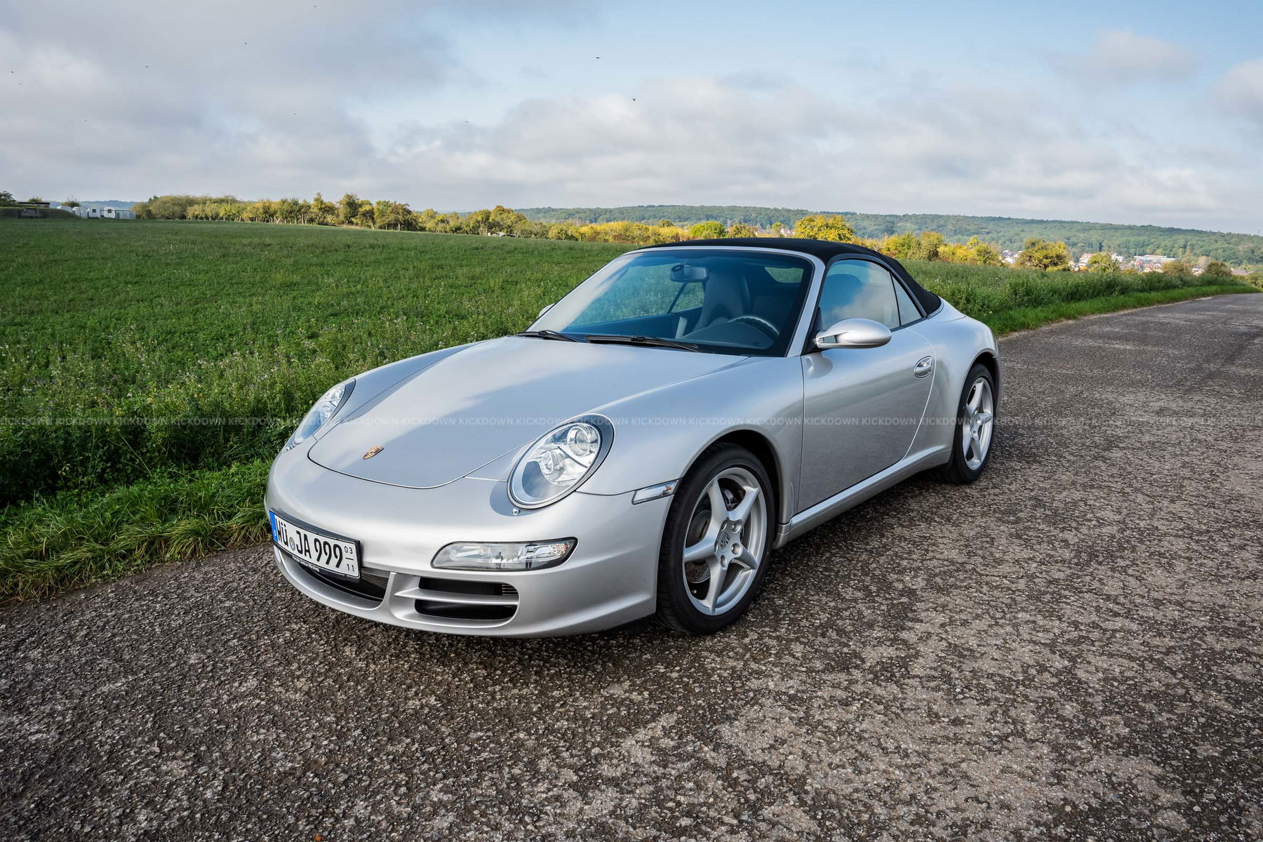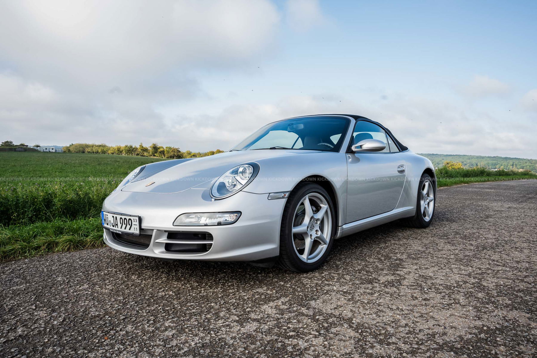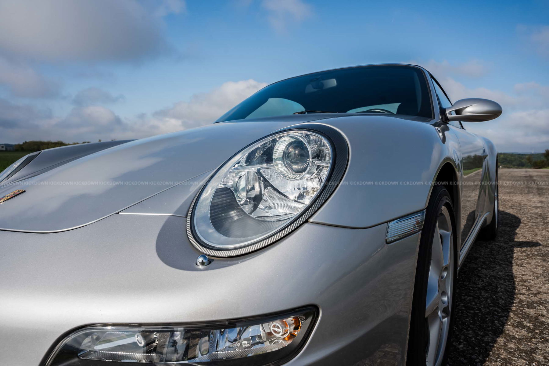 Zum Verkauf steht ein Porsche 911 (997) Carrera aus dem Jahr 2008 in klassischem Silber.