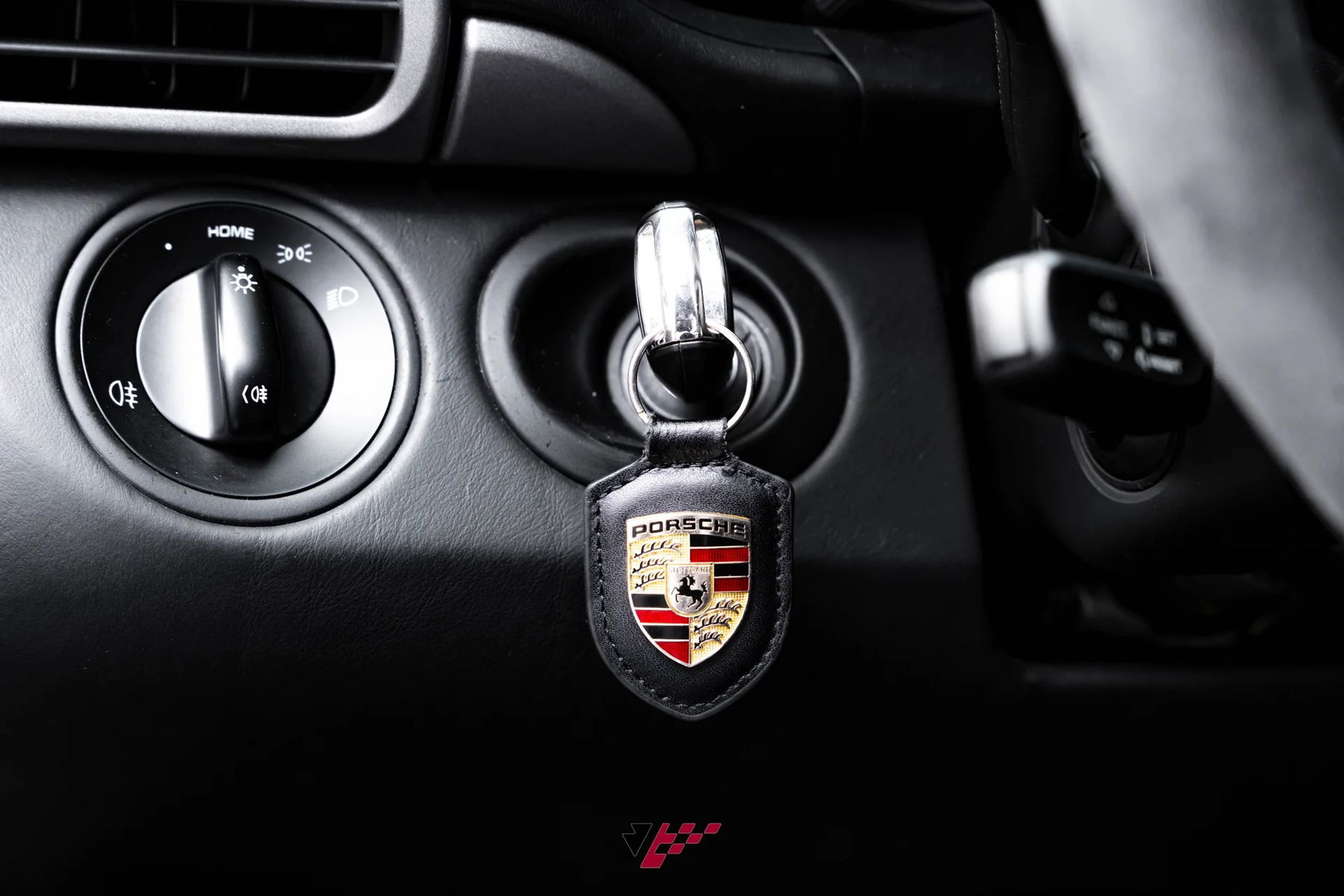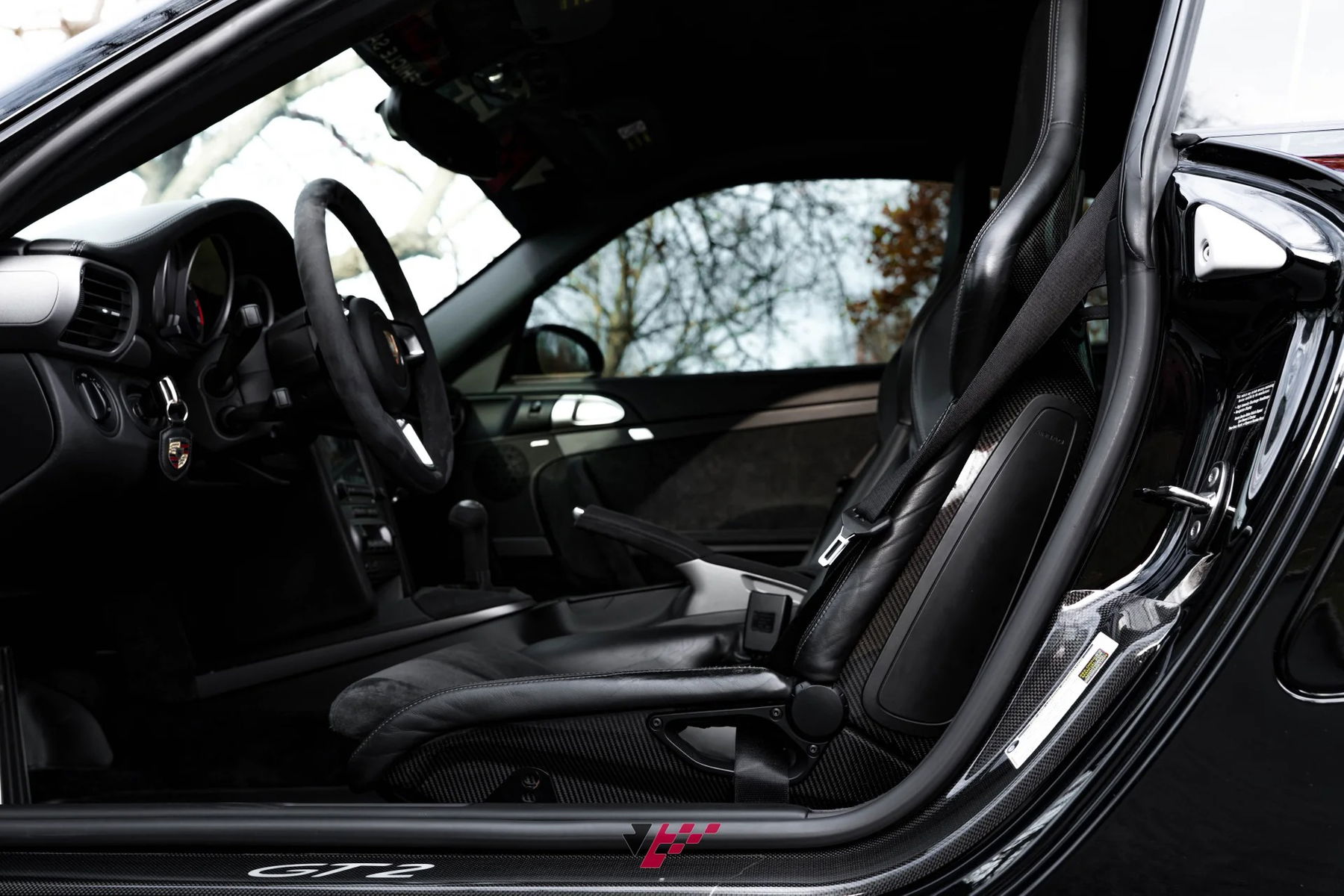 Ausgestattet mit den für die 997 GT2-Generation typischen 19-Zoll-Mehrspeichenrädern in Silber, die vor den gelben Bremssätteln des begehrten PCCB-Systems positioniert sind. Komplett mit Leder gepolsterter Innenraum.