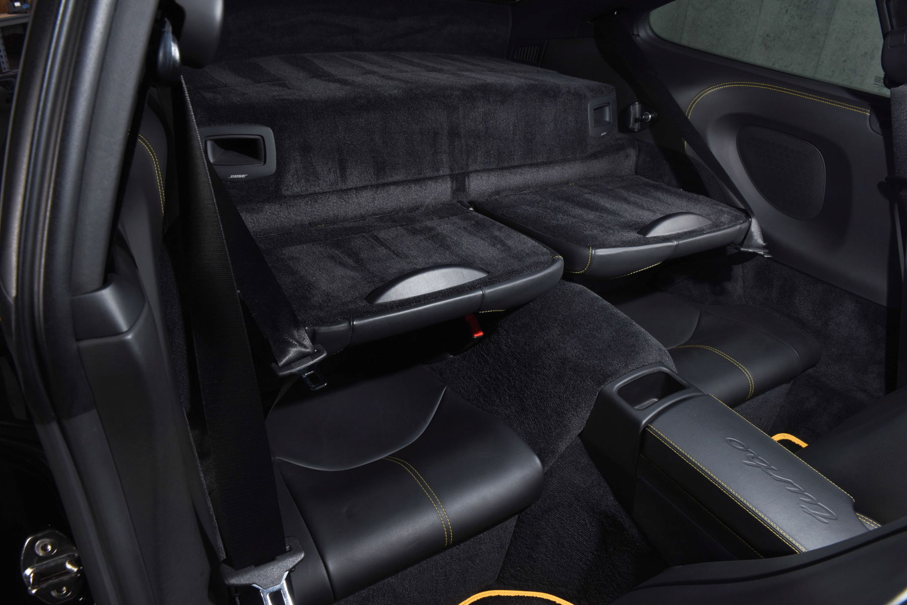 auf den charakteristischen 19-Zoll-Turbo-Schmiederädern mit zweifarbigem Finish und unlackierten Wappen, die vor den gelben Bremssätteln des pccb-Systems mit schwarzem "Porsche"-Schriftzug präsentiert werden.die Karosserie des turbo ist in einem klassischen schwarzen Farbton gehalten, der durch speedgelbe Nähte und Ziffernblätter der Instrumente, Leder in ausgewählten Bereichen (hintere Mittelkonsole, Lenksäule, Entfrosterverkleidung, Sonnenblenden und weitere Bereiche), das geprägte turbo-Logo auf dem Deckel der Mittelkonsole und das geprägte porsche-Wappen auf den Kopfstützen der adaptiven Sportsitze ästhetisch aufgewertet wird.