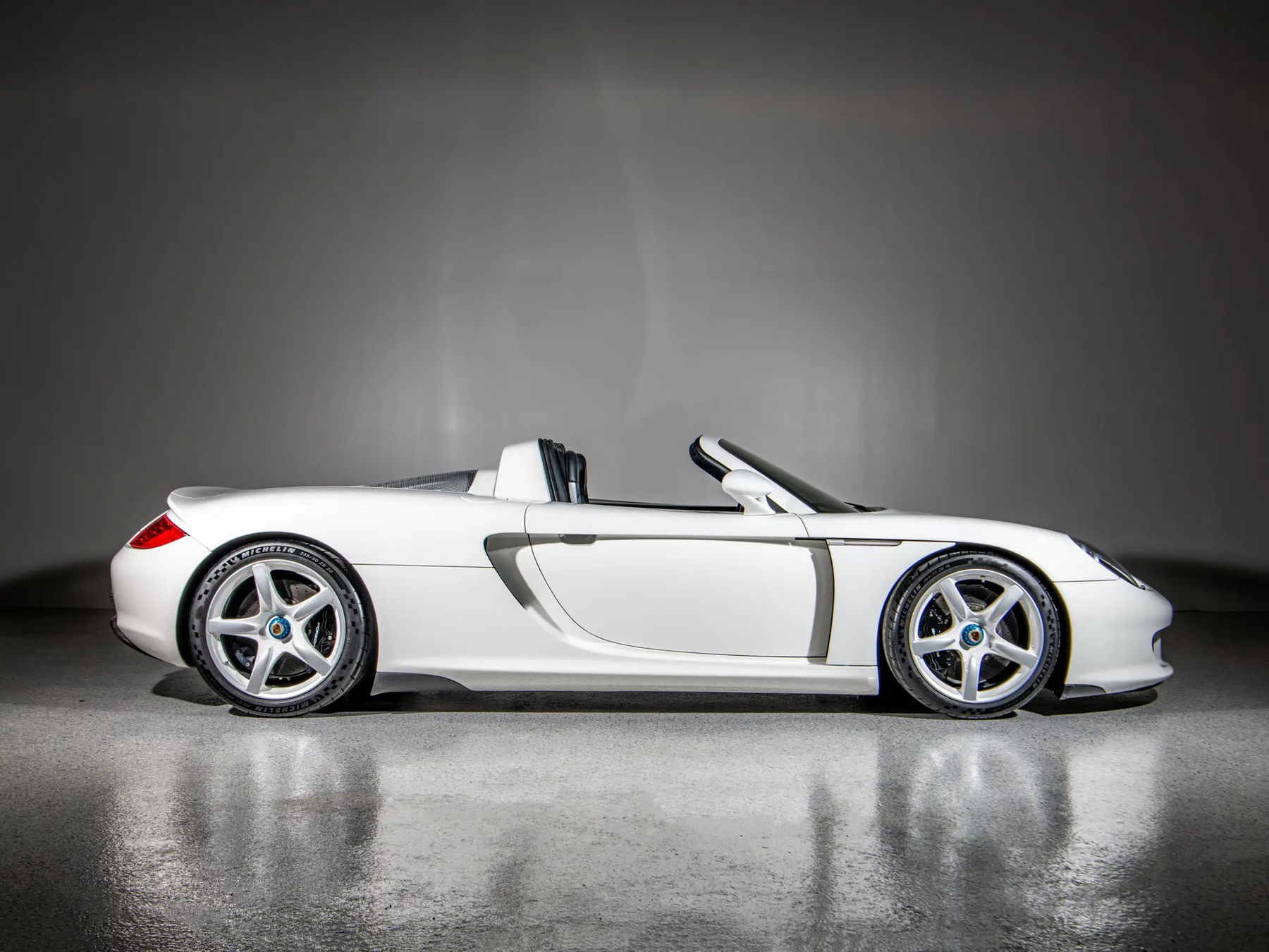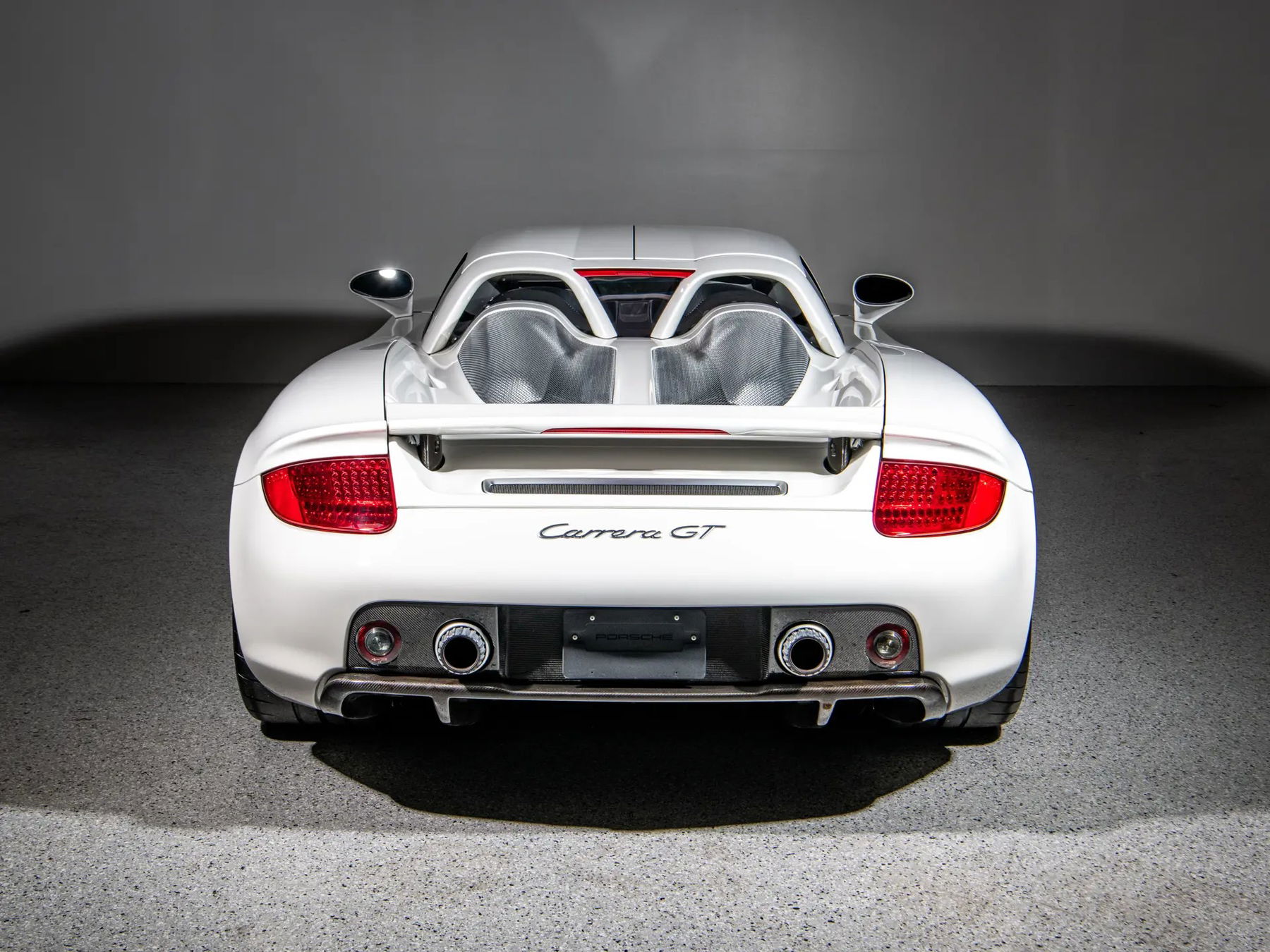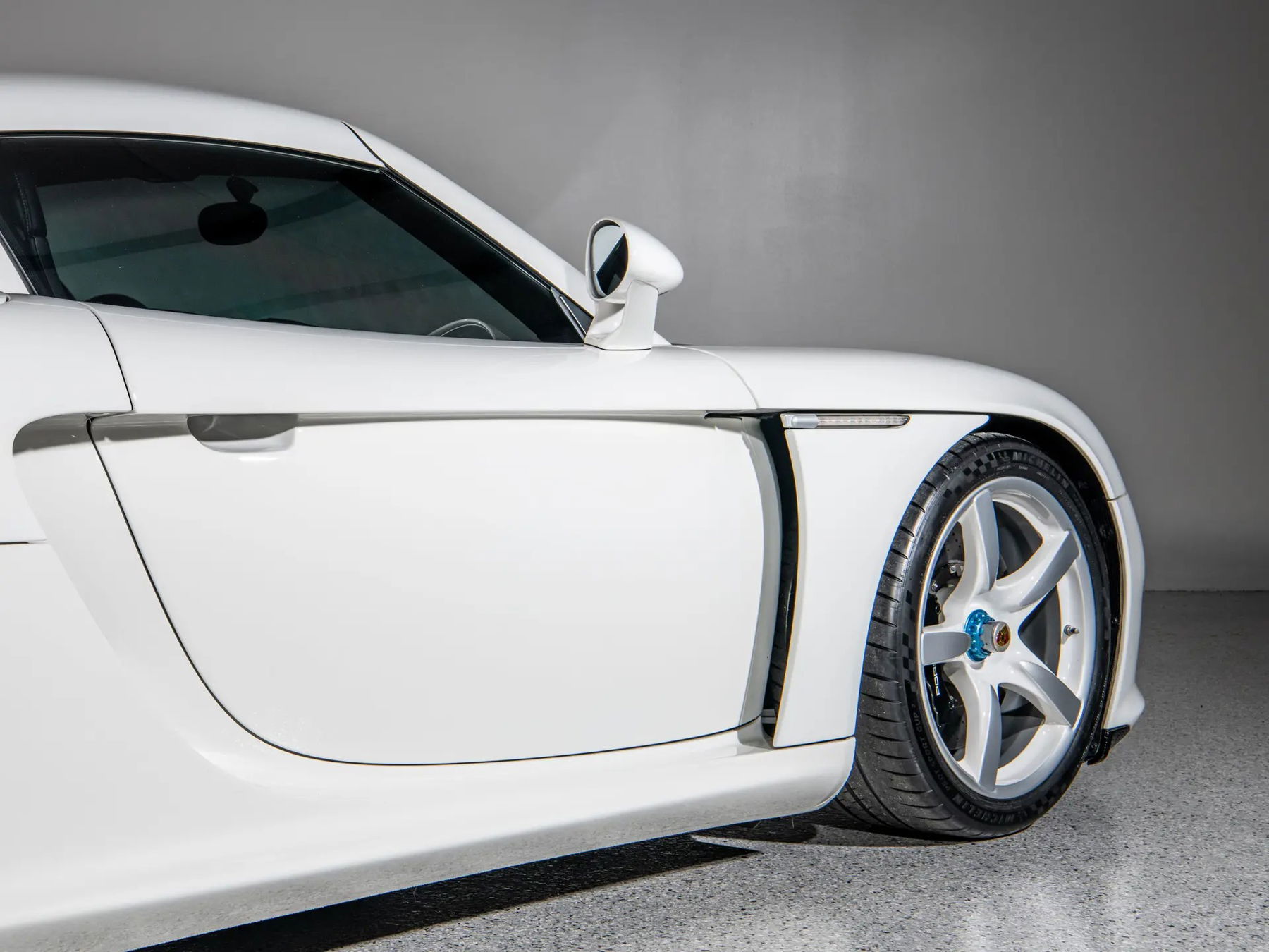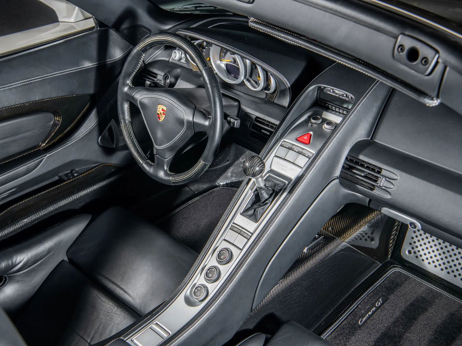 Für diesen Carrera GT mit der Seriennummer 1080 wurde die Farbe Carraraweiß gewählt, und man geht davon aus, dass er einer von nur einer Handvoll Carrera GTs ist, die ursprünglich in diesem Farbton lackiert wurden. Die Außenseiten der Radspeichen sind passend zur Karosserie in Carrara-Weiß lackiert, zusammen mit schwarz lackierten Bremssätteln anstelle der standardmäßig kontrastierenden rot und gelb lackierten Bremssättel. Die Lackierung wird durch eine dunkelgraue Lederausstattung kompensiert, die im gesamten Innenraum mit abweichenden Nähten versehen ist, einschließlich des Lenkrads mit optionaler Kohlefaserverkleidung. Der Wagen ist außerdem mit dem seltenen Kohlefaser-Schaltknauf ausgestattet, der in Anlehnung an den Porsche 917 normalerweise aus Birke und Esche gefertigt wird. Schließlich wurde der Carrera GT mit dem seltenen, passenden Kofferset ausgestattet und wird derzeit von einem Aktenkoffer mit Holzgriff, einer Reisetasche, einem Anzugträger, einem Seesack, einer Tasche für die Mittelkonsole und zwei kleinen Taschen für die Türfächer begleitet (Fotos der zugehörigen Gegenstände finden Sie in der digitalen Historiendatei). Alles in allem belief sich der UVP dieses Carrera GT auf 504.060 $, was vermutlich einer der höchsten UVP eines Carrera GT ist.