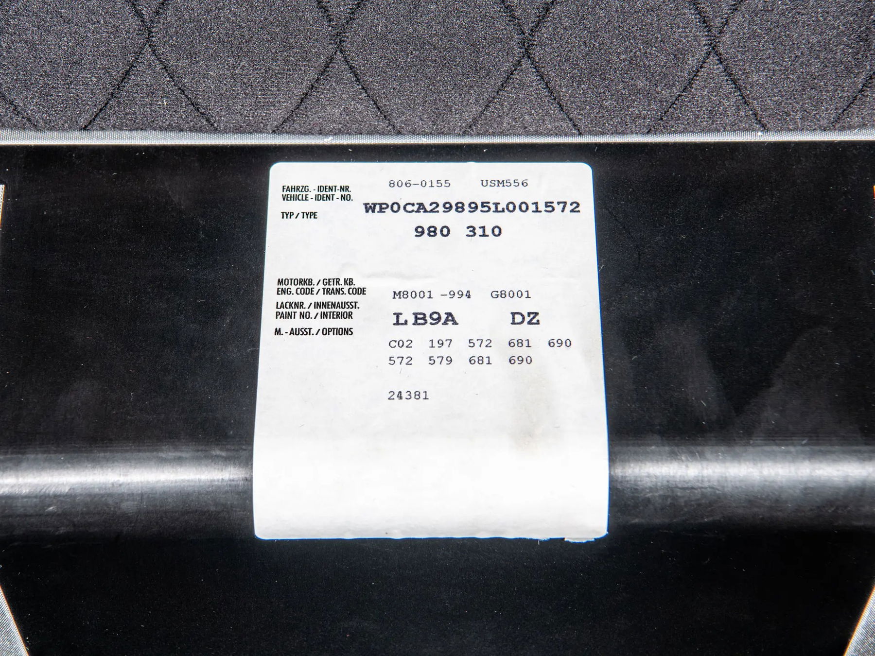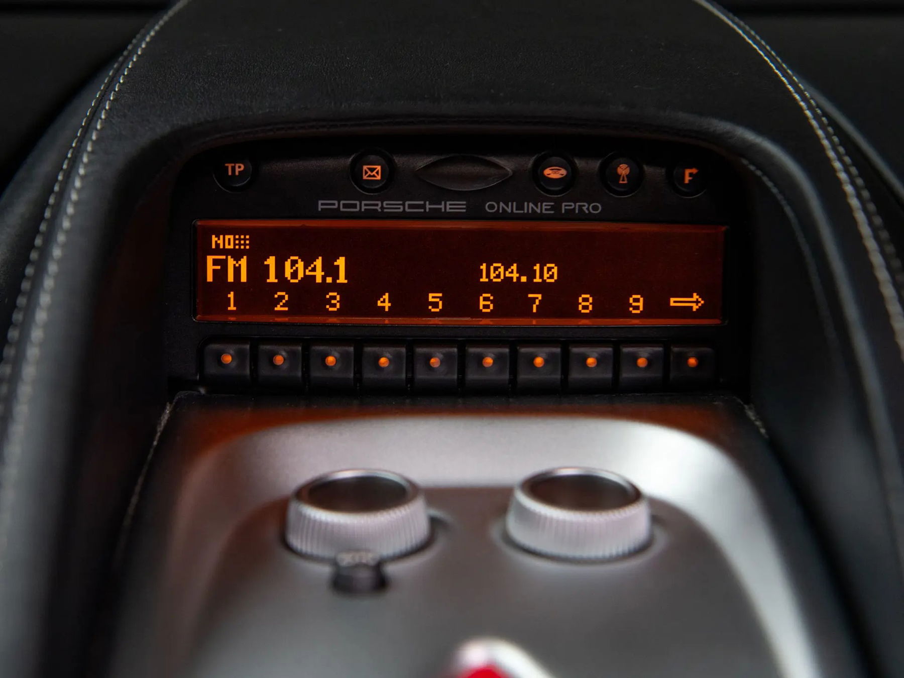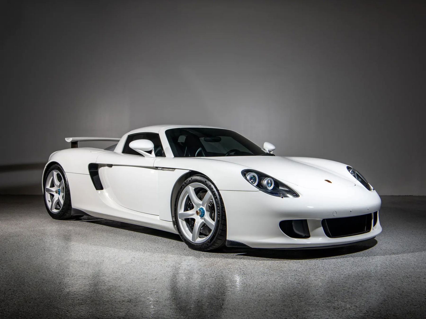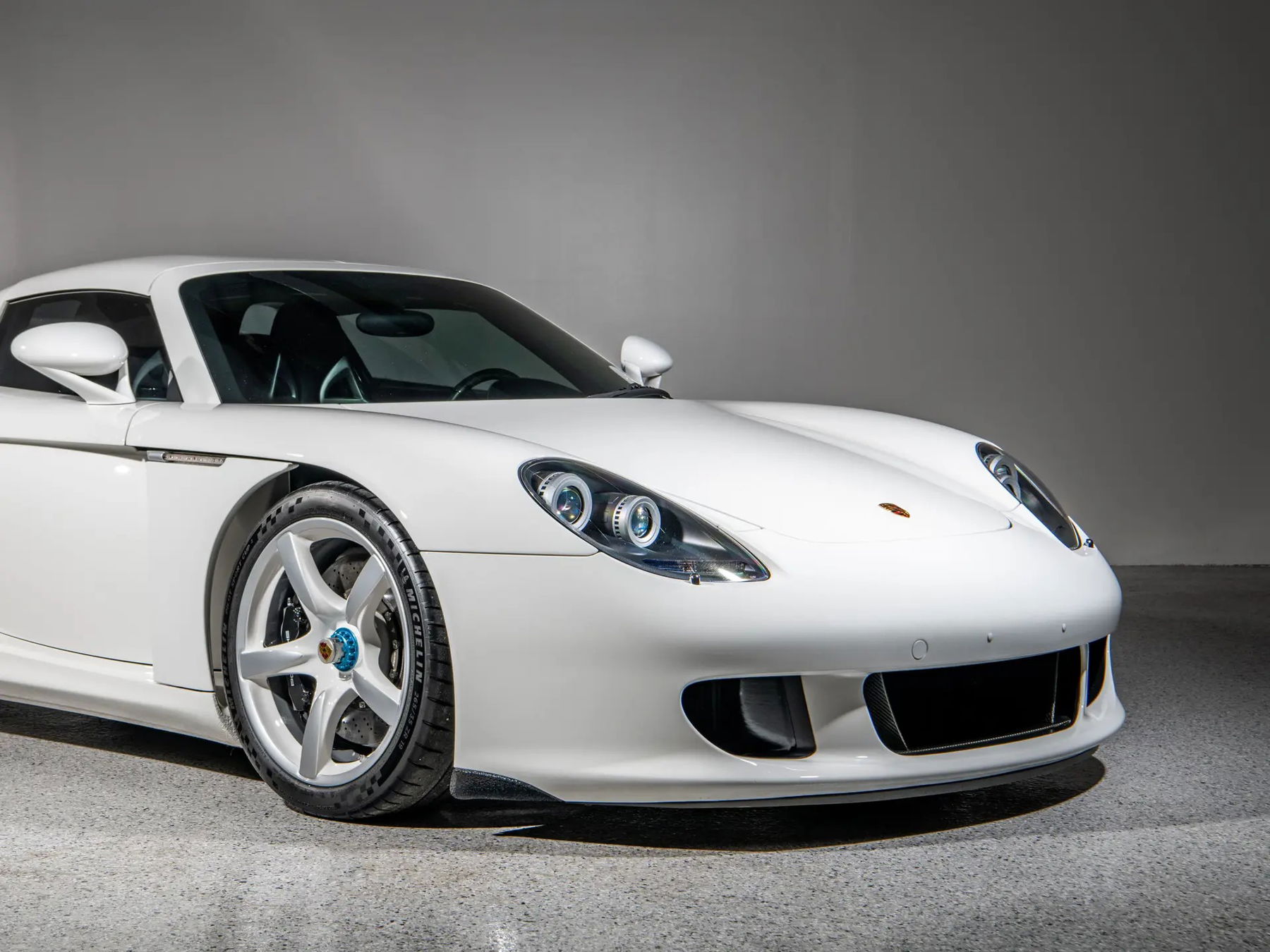 Für diesen Carrera GT mit der Seriennummer 1080 wurde die Farbe Carraraweiß gewählt, und man geht davon aus, dass er einer von nur einer Handvoll Carrera GTs ist, die ursprünglich in diesem Farbton lackiert wurden. Die Außenseiten der Radspeichen sind passend zur Karosserie in Carrara-Weiß lackiert, zusammen mit schwarz lackierten Bremssätteln anstelle der standardmäßig kontrastierenden rot und gelb lackierten Bremssättel. Die Lackierung wird durch eine dunkelgraue Lederausstattung kompensiert, die im gesamten Innenraum mit abweichenden Nähten versehen ist, einschließlich des Lenkrads mit optionaler Kohlefaserverkleidung. Der Wagen ist außerdem mit dem seltenen Kohlefaser-Schaltknauf ausgestattet, der in Anlehnung an den Porsche 917 normalerweise aus Birke und Esche gefertigt wird. Schließlich wurde der Carrera GT mit dem seltenen, passenden Kofferset ausgestattet und wird derzeit von einem Aktenkoffer mit Holzgriff, einer Reisetasche, einem Anzugträger, einem Seesack, einer Tasche für die Mittelkonsole und zwei kleinen Taschen für die Türfächer begleitet (Fotos der zugehörigen Gegenstände finden Sie in der digitalen Historiendatei). Alles in allem belief sich der UVP dieses Carrera GT auf 504.060 $, was vermutlich einer der höchsten UVP eines Carrera GT ist.