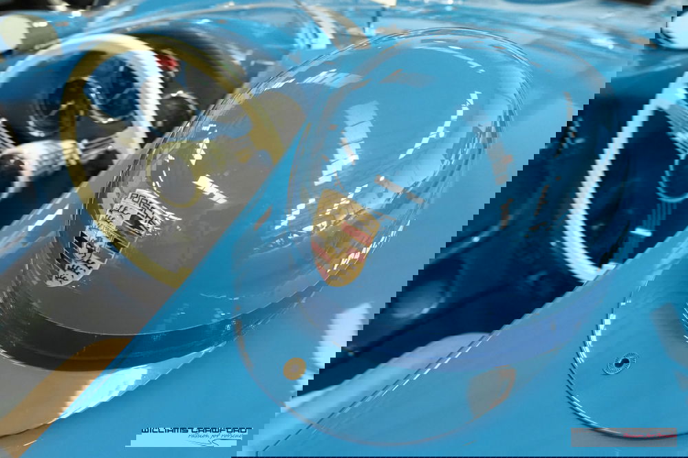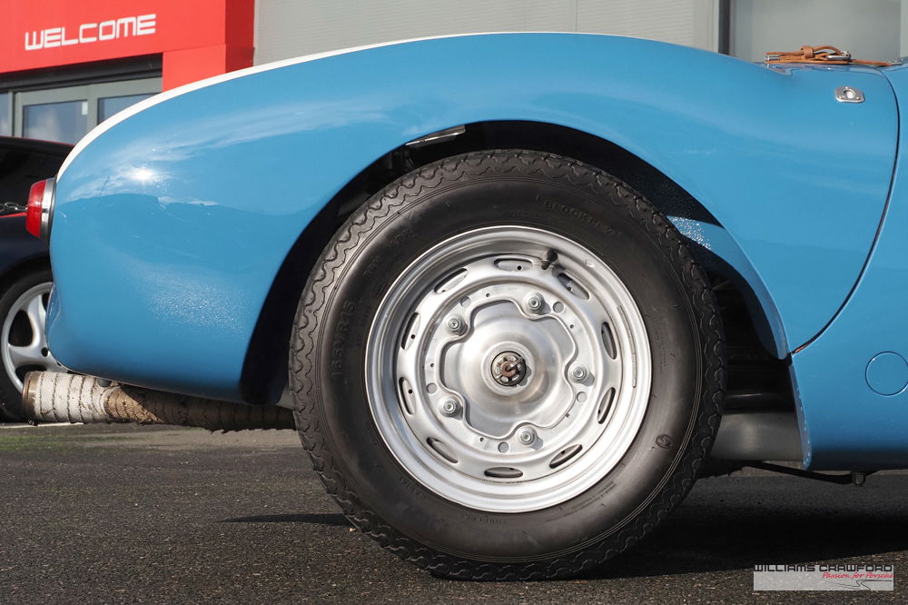 Mit seiner zeitgenössischen Lackierung in Französischblau ist er eine Hommage an die leichten Porsche 550 RS Spyder, die Mitte 1955 neu nach Frankreich geliefert wurden.